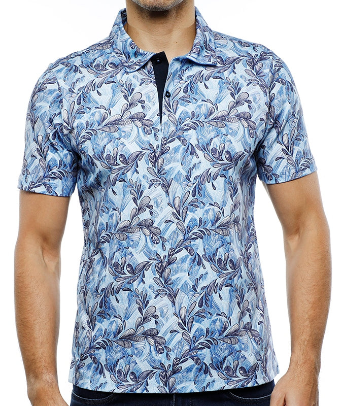Polo with multi blue leaf pattern, interlock system and 4-way natural stretch. Material is 100% pima mercerized cotton.