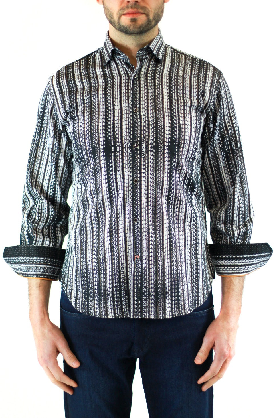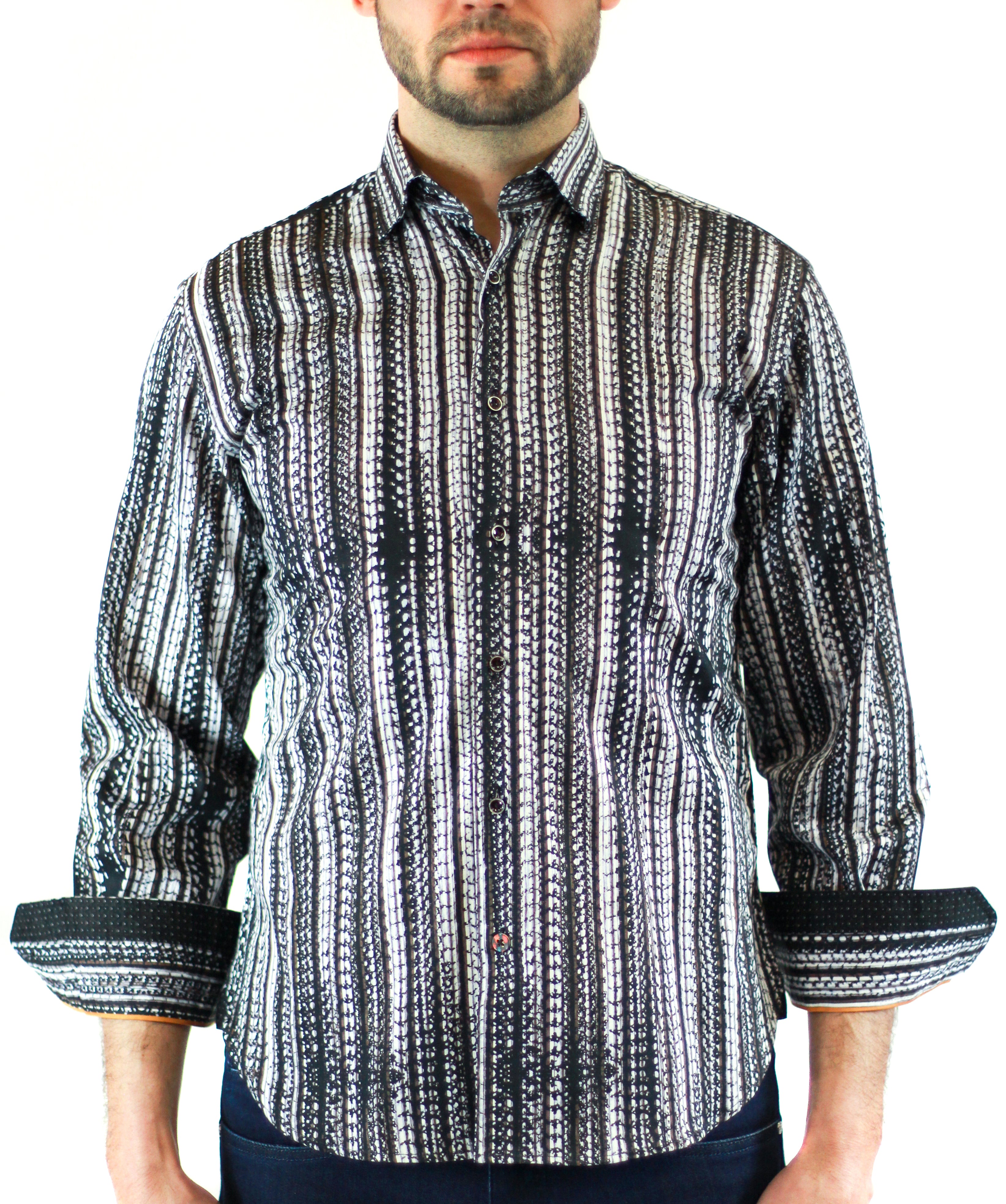Long sleeve shirt in black and white daggered stripes. Material has a satin finish with natural stretch.