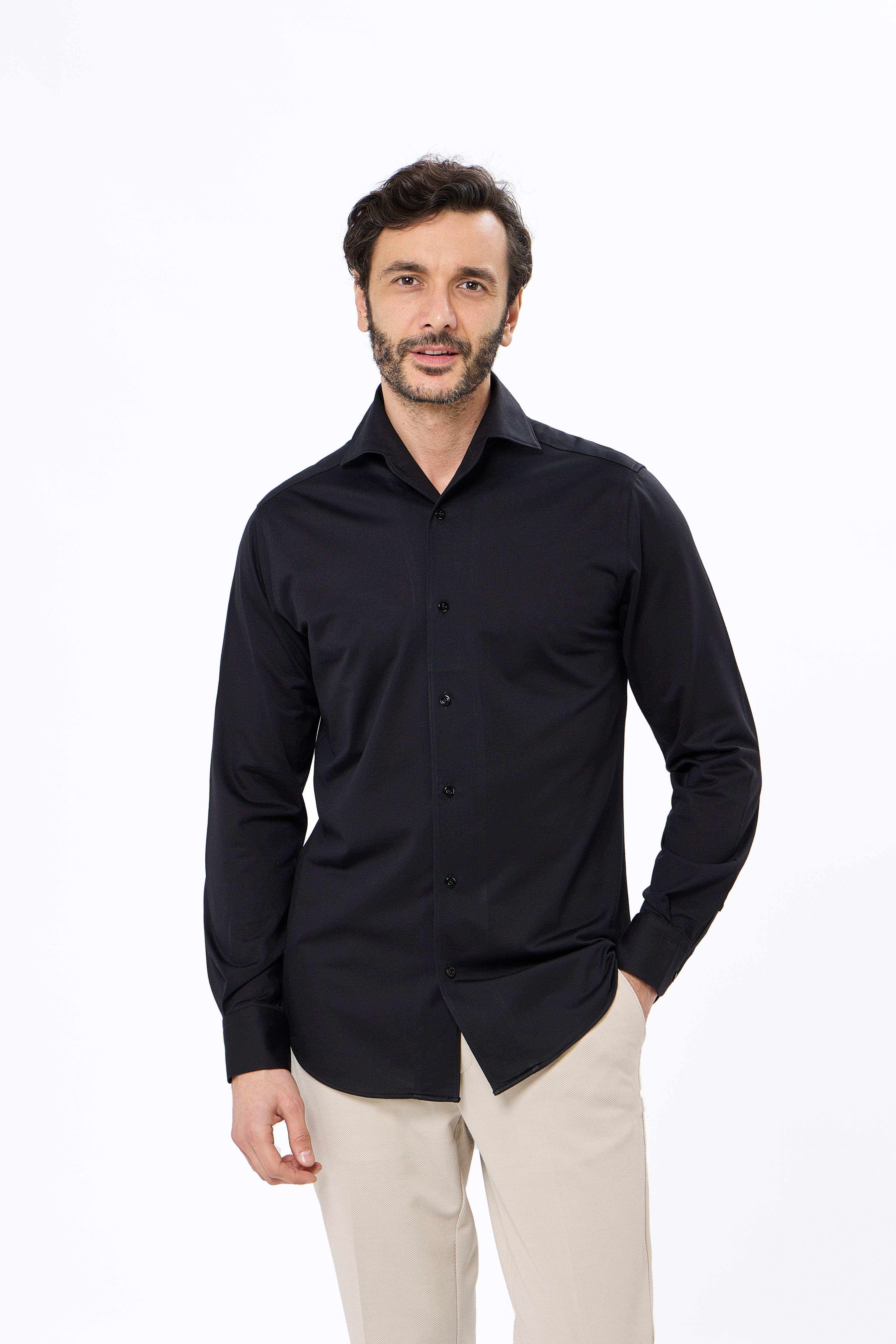 Upgrade your wardrobe with this Black One-Piece Collar Shirt, crafted for all-day performance and modern polish. Made from a sustainable blend of 60% organic cotton and 40% recycled polyester, it features 6-way stretch for unmatched comfort and movement. Designed with moisture-wicking, non-iron, and quick air-dry technology, this shirt keeps you looking sharp with minimal effort. The sleek one-piece collar adds a refined touch, making it versatile enough for both work and evening wear. A must-have Fall season essential that blends sustainability, performance, and timeless style.