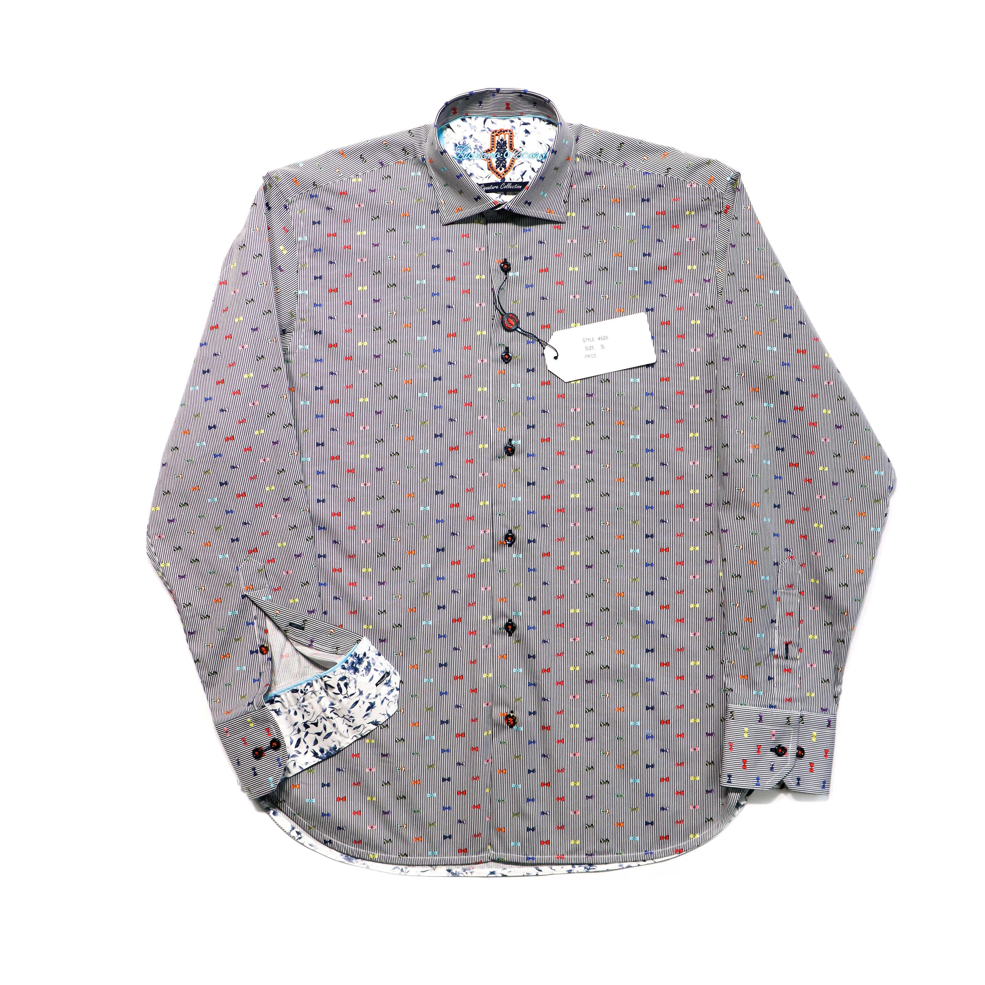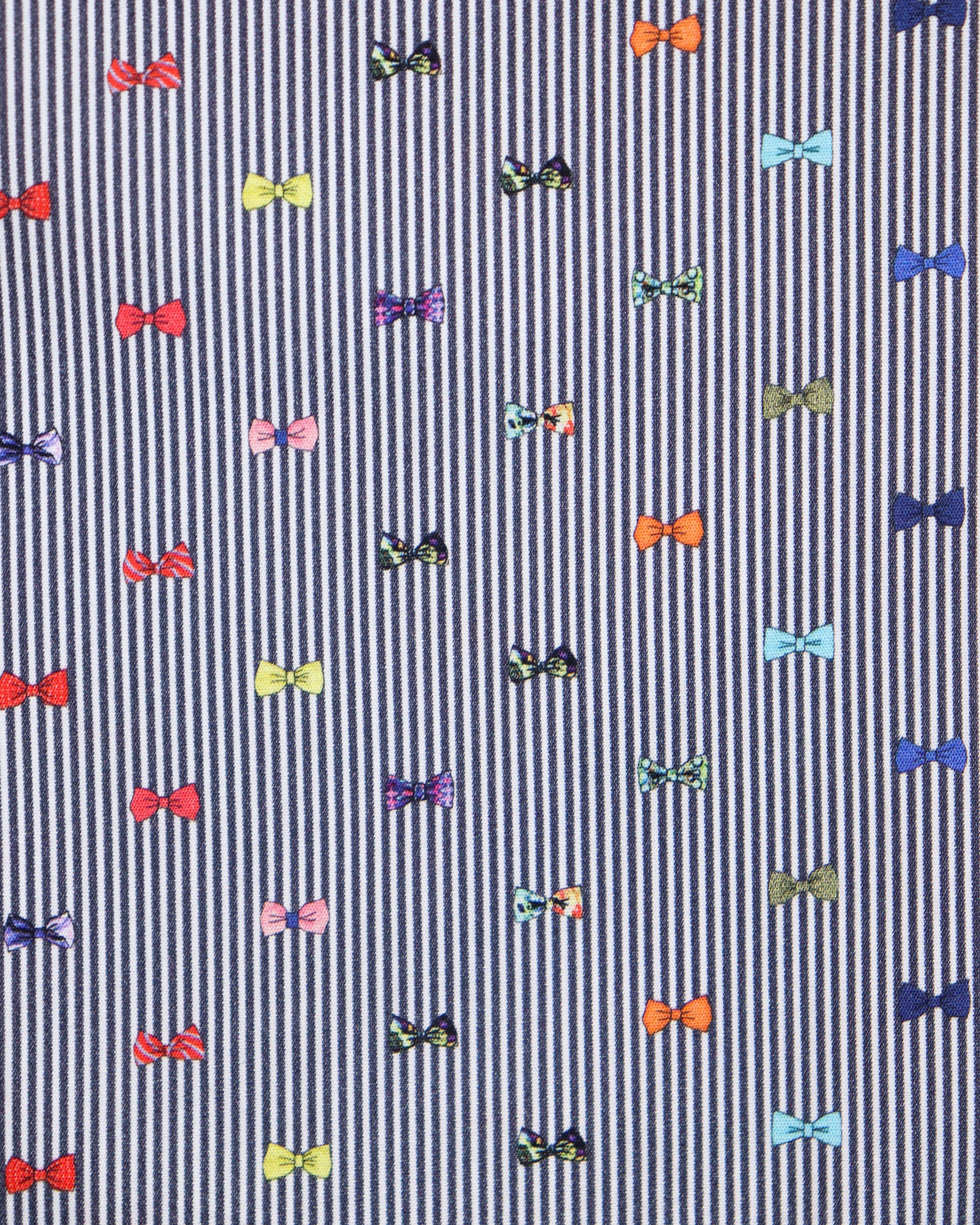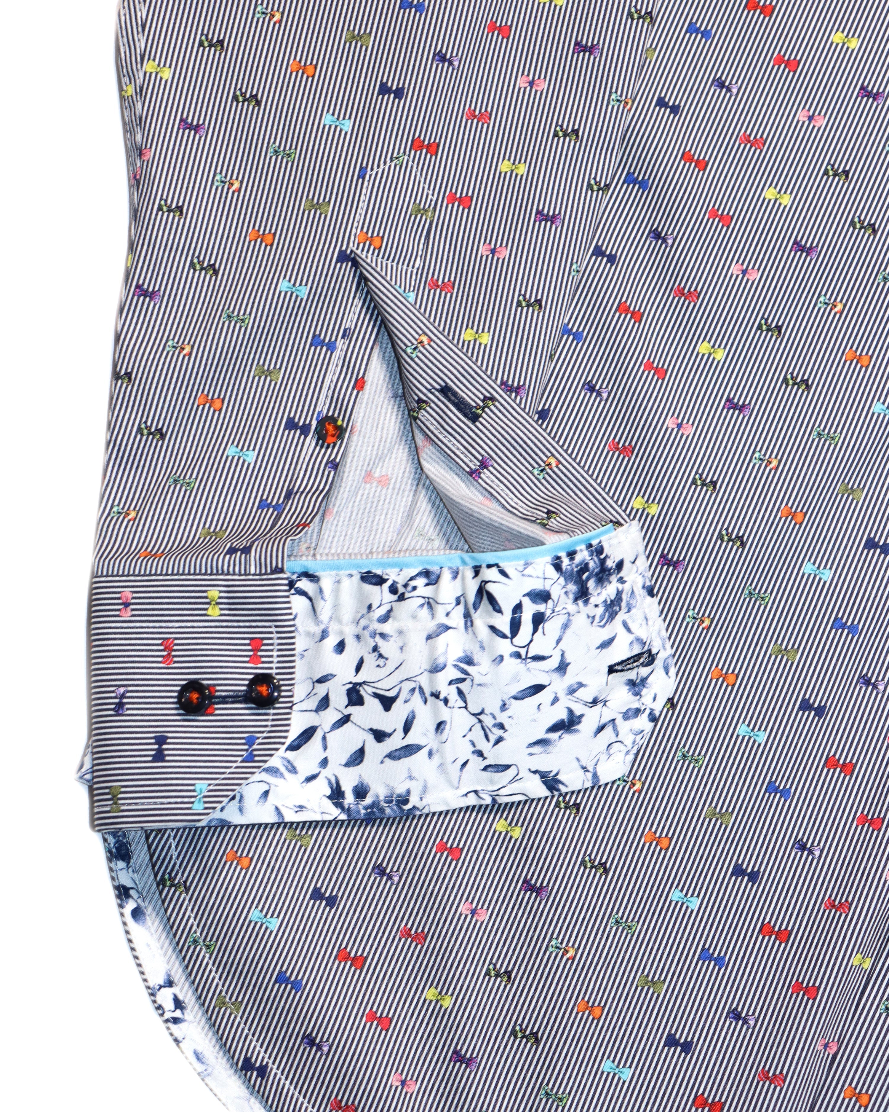 Long sleeve shirt in black and white stripes with multicolor bowties.
