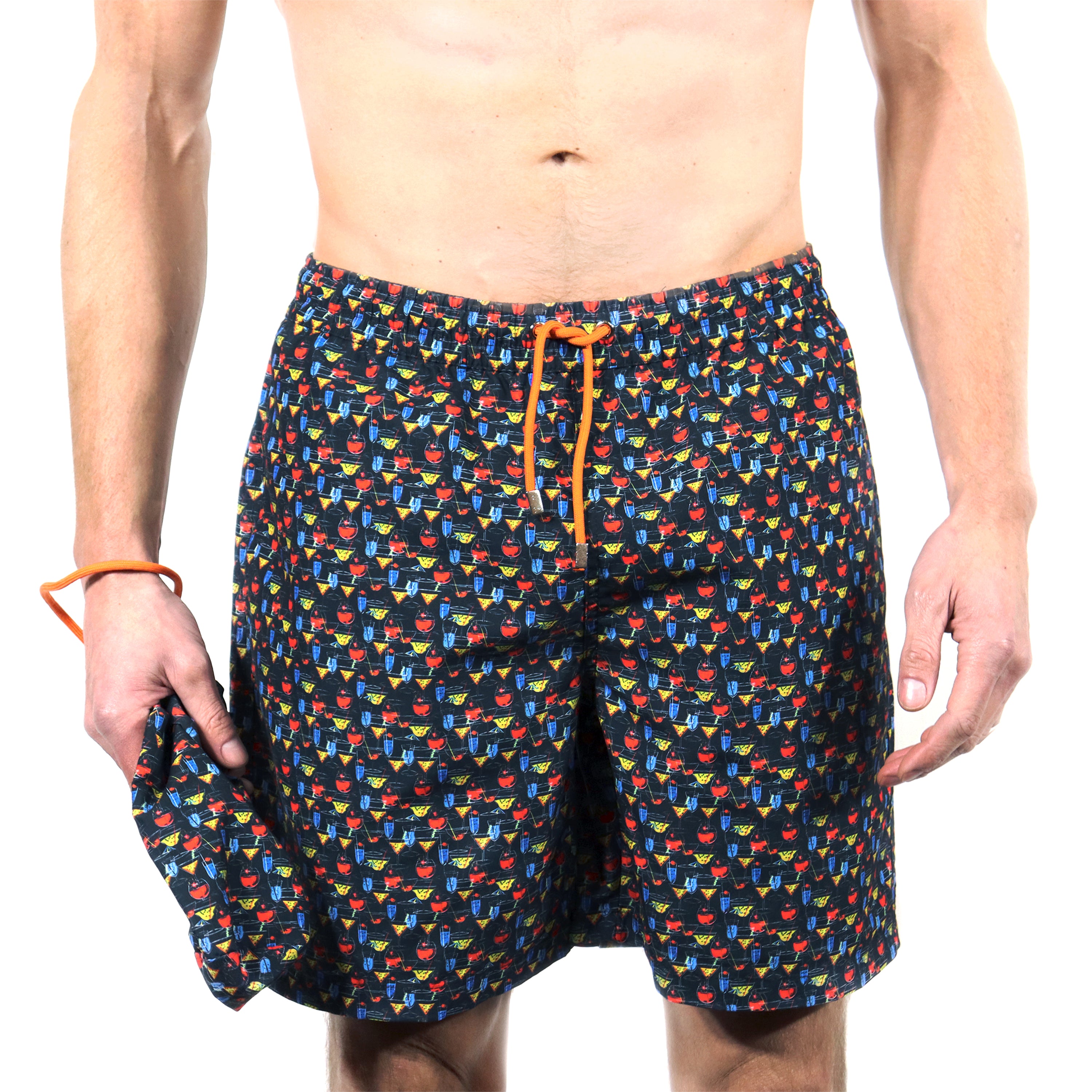 Swim trunks in black with red, yellow and blue cocktails. All swimsuits come with their own matching travel bag!