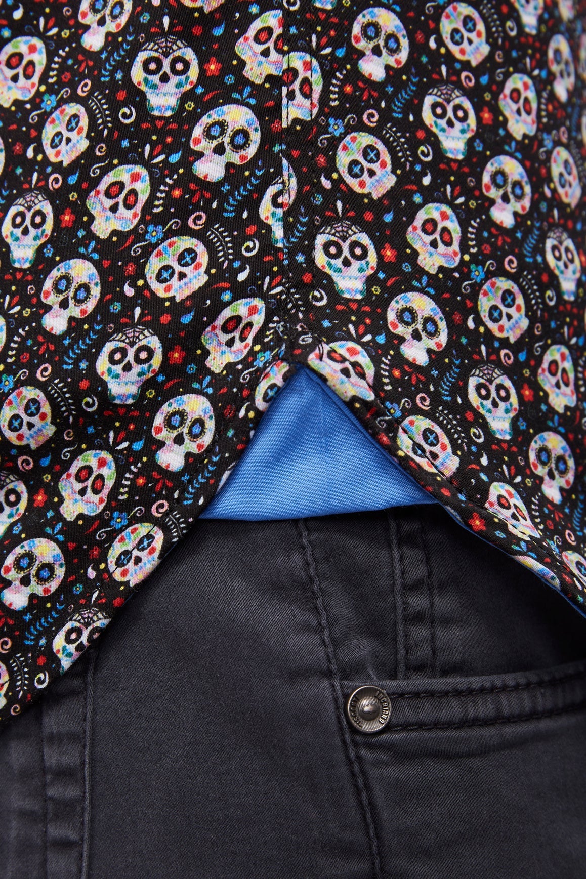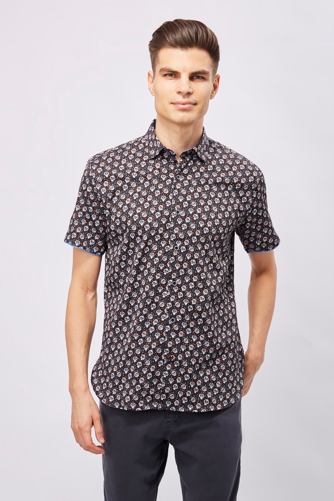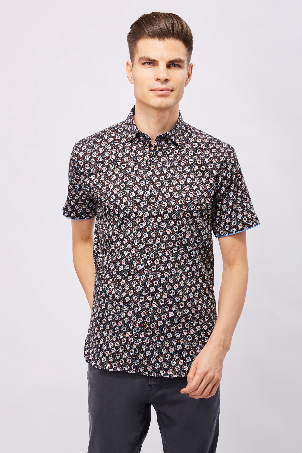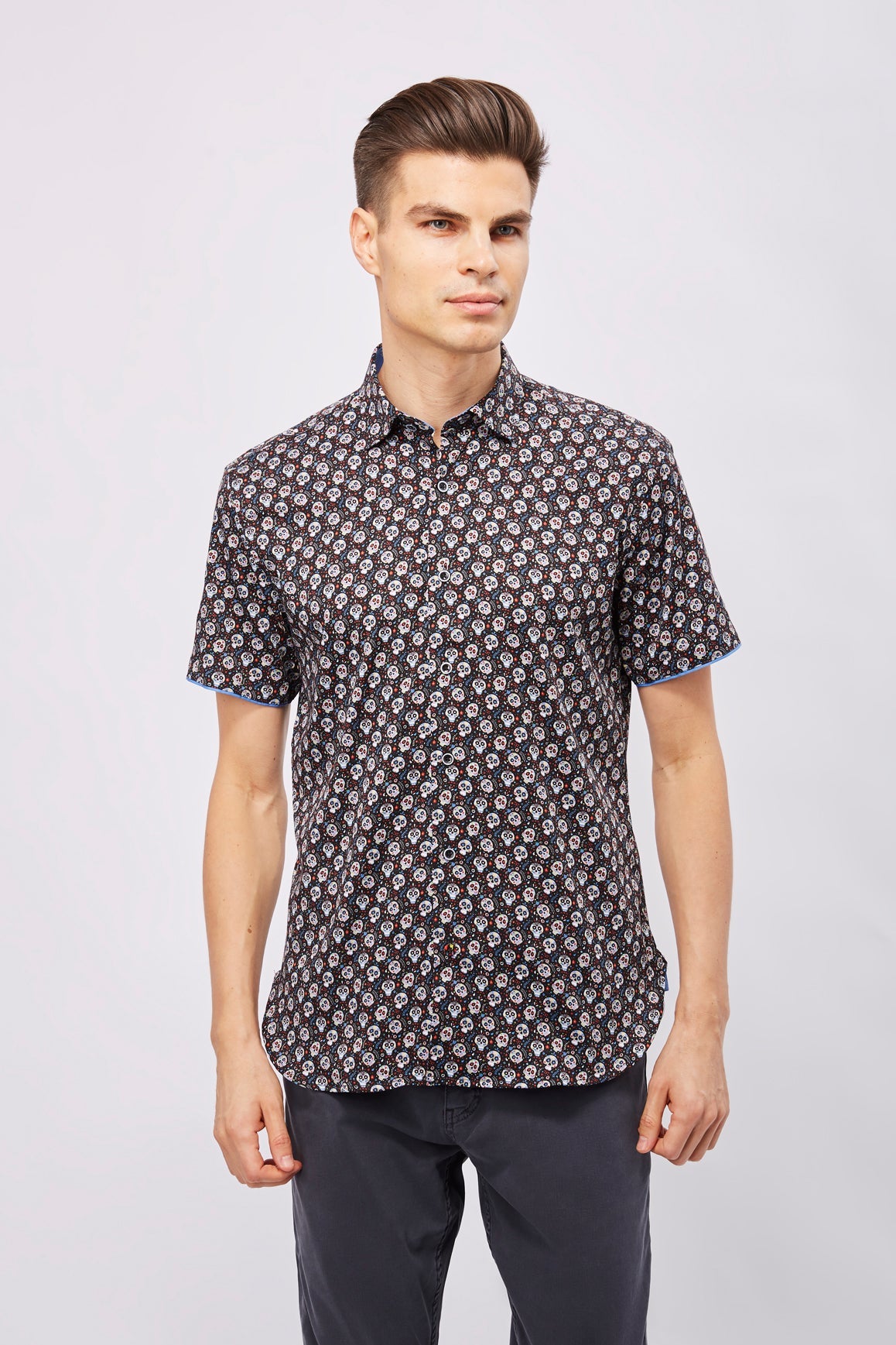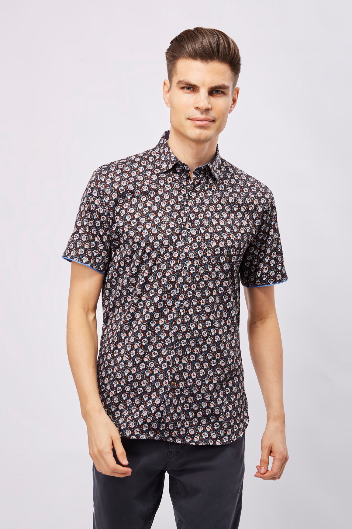 Short sleeve shirt in black with multicolor sugar skulls.