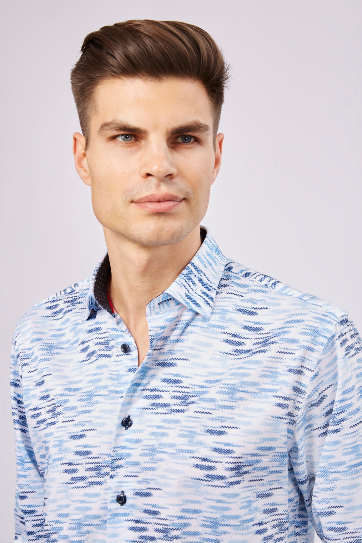Long sleeve shirt in white with multi blue daggered lines. Material has a satin finish with natural stretch.
