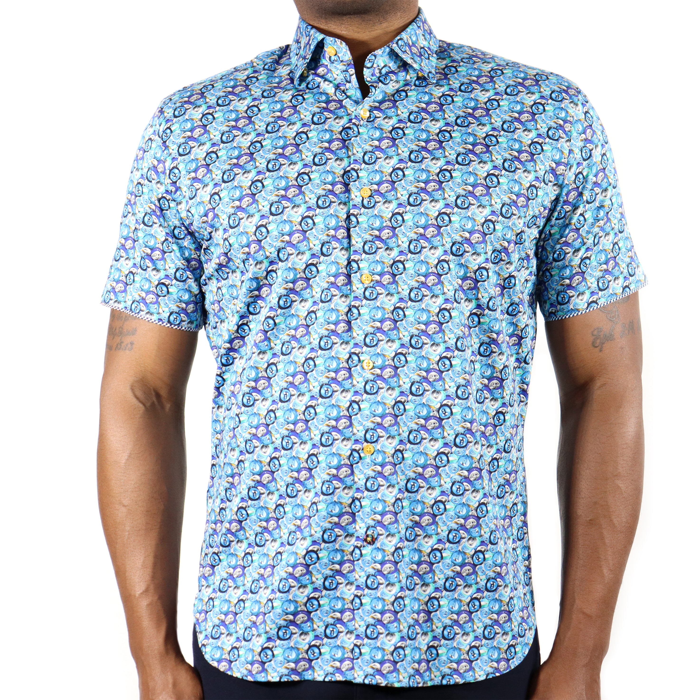 Short sleeve shirt in multicolor blue soda can print with yellow buttons.