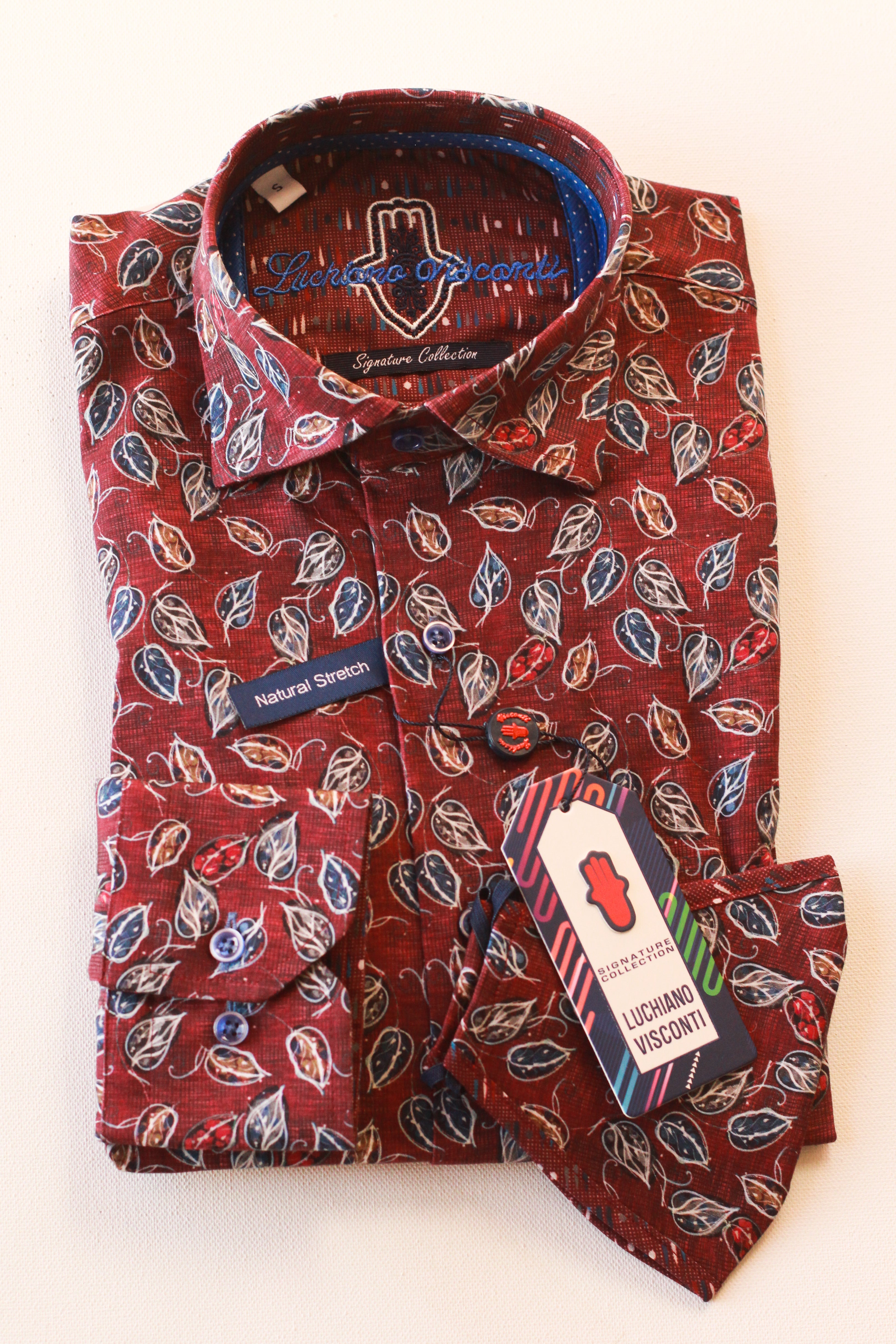 The Luchiano Visconti Signature Collection features the eclectic, bold styles that are the cornerstone of the Luchiano Visconti brand. This year's collection takes inspiration from colorful, contemporary art and unique patterns found in nature. The signature collection boasts natural stretch and satin finishing. Each shirt includes a matching mask.