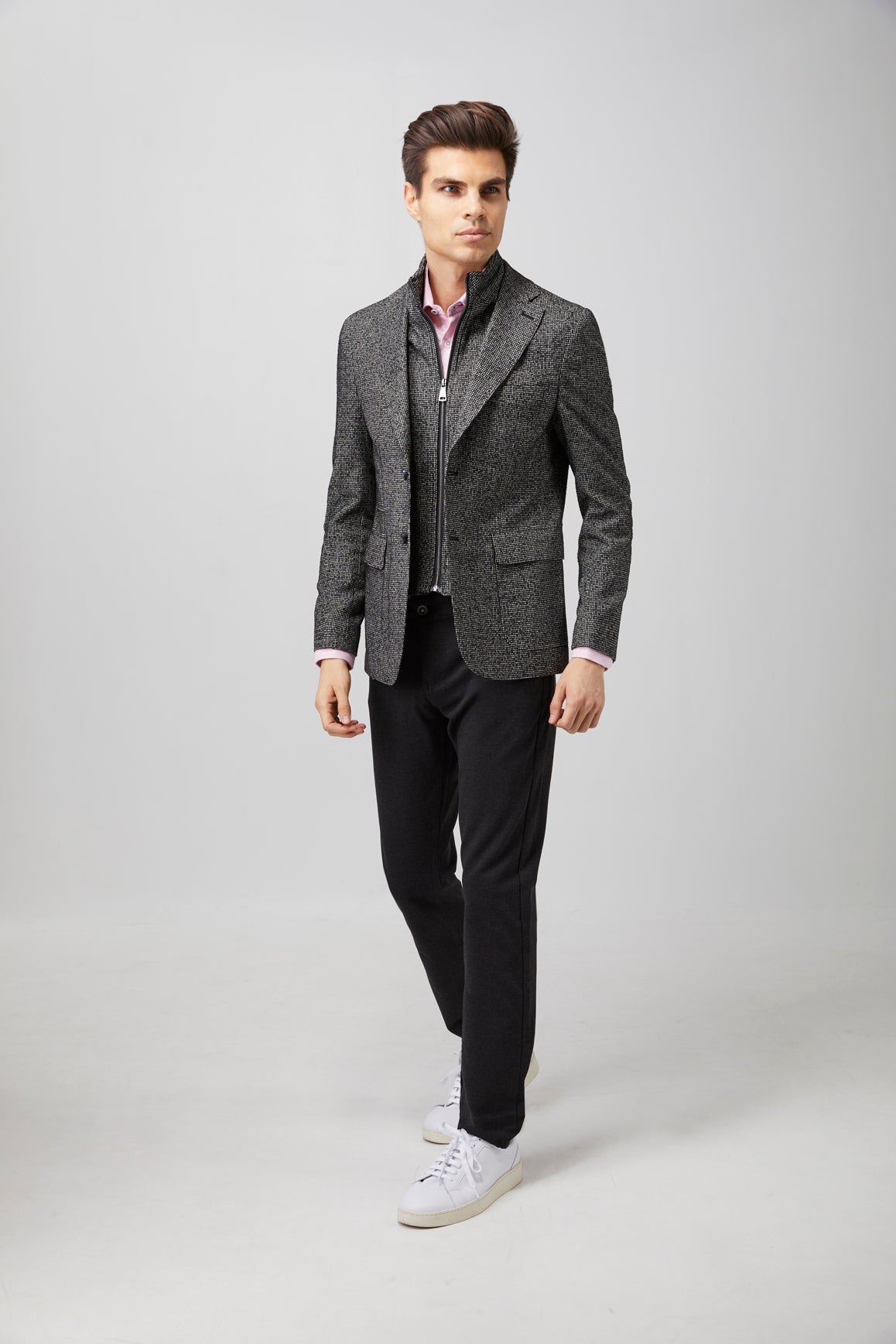 Upgrade your wardrobe with this sleek full zip black and white houndstooth sport coat. With its inner removable collar, this jacket is perfect for any occasion. Pair it with your favorite shirt and pants for a polished and elevated look.