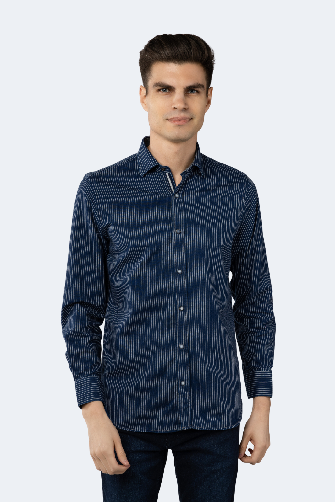 Experience ultimate luxury with this FW23 Denim Blue Stripe Shirt from Luchiano Visconti. Crafted with high-quality denim fabric and featuring snap buttons, this classic button-down shirt will lend you timeless style and modern sophistication.