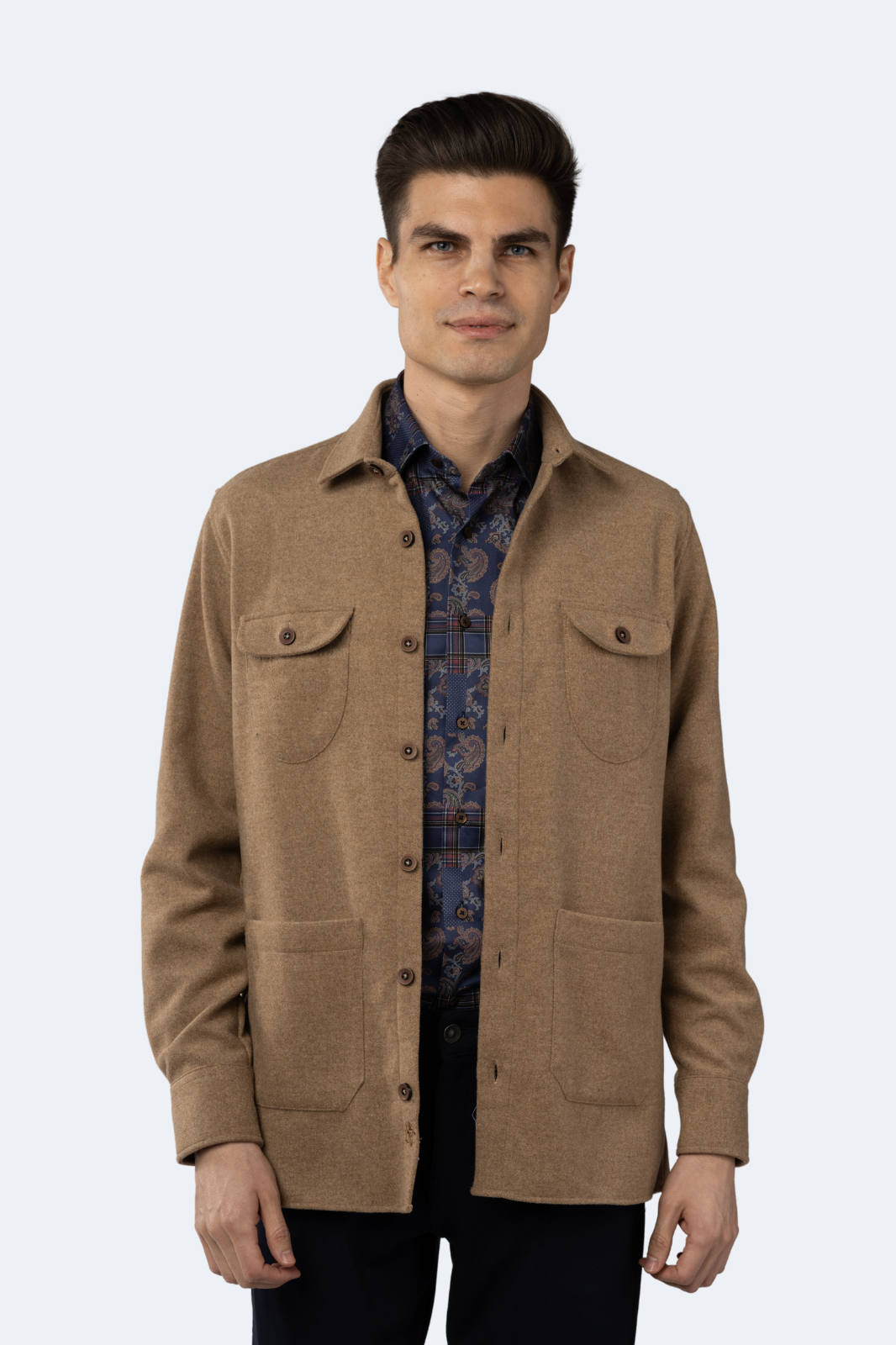 Made with impeccable craftsmanship, the FW23 Leo Camel Shacket from Luchiano Visconti is a luxurious statement piece. Featuring a slim fit, button-down design and four front pockets, this shacket's classic details will elevate your wardrobe.