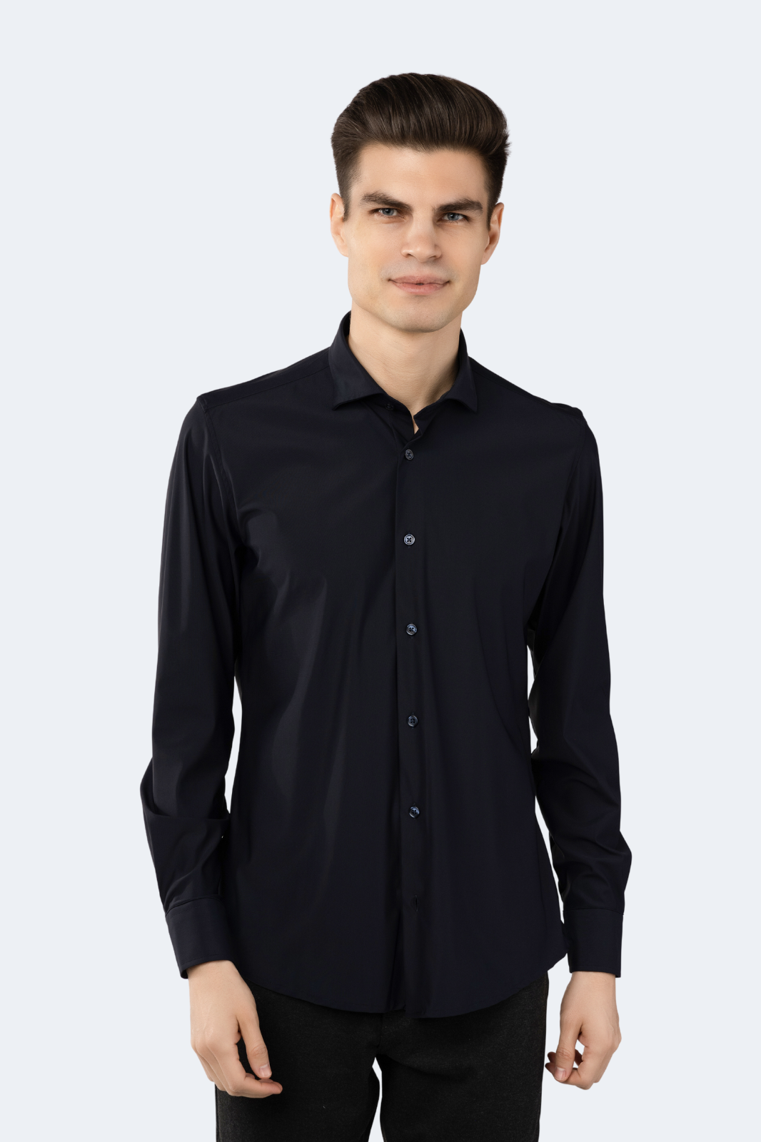 This Leo Navy Solid Shirt is an exquisite wardrobe staple crafted for the modern man. Cut for a slim fit, it features a full stretch fabrication and a classic button-down collar. Exuding a luxurious and sophisticated style, this timeless piece is perfect for special occasions.