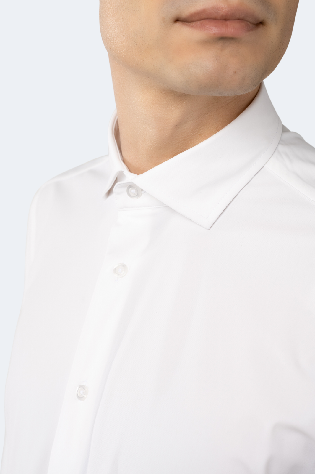 Experience styling excellence with this FW23 Leo White Solid Shirt from Luchiano Visconti. Delivering a timeless silhouette with its slim fit and button-down design, this sophisticated piece is crafted from a full stretch fabric for ultimate comfort. A sophisticated statement in formal wear.
