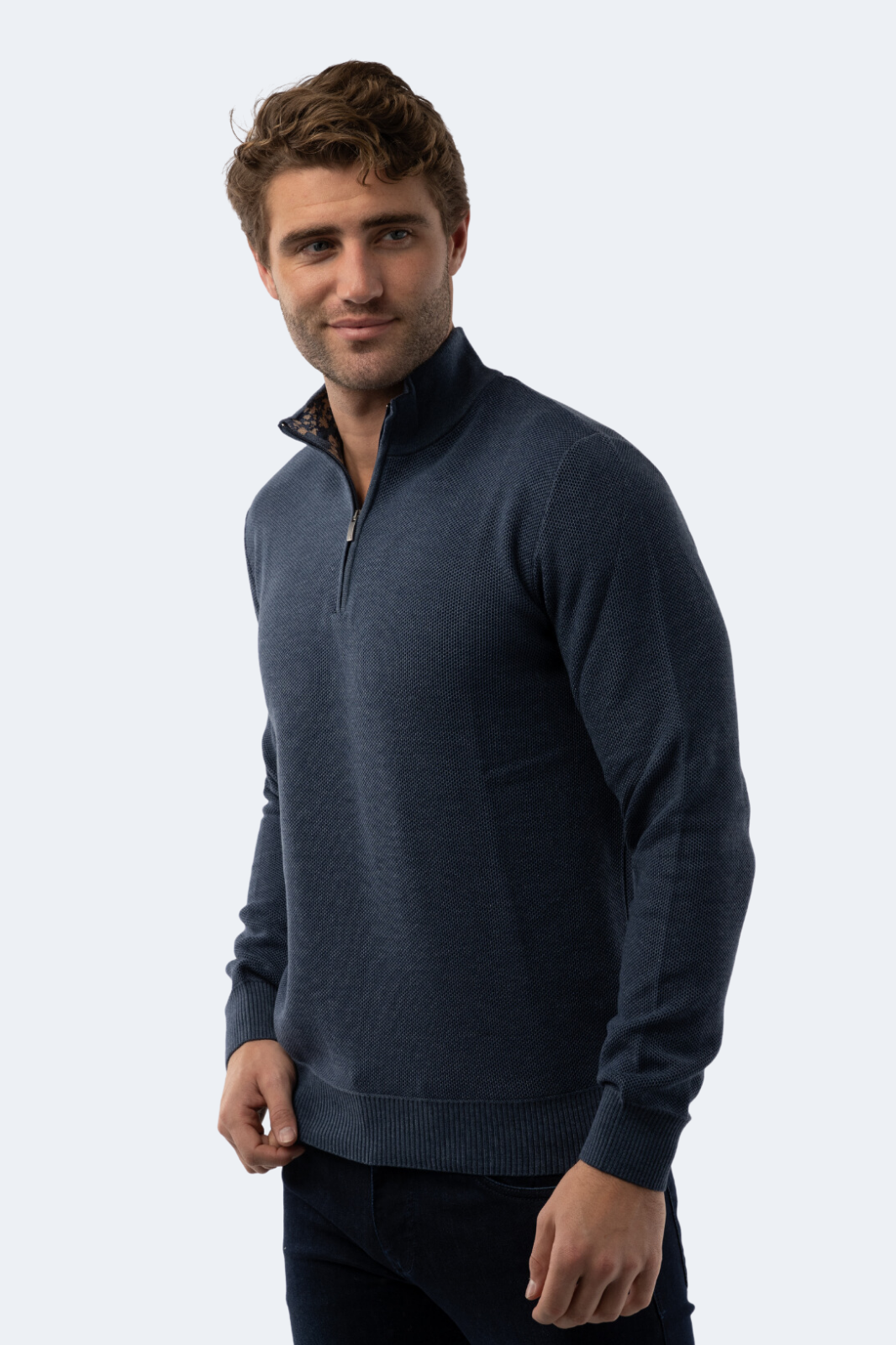 Introducing the Melange Indigo Quarter Zip, by designer Luchiano Visconti. This 3/4 sleeve pullover features an elegant quarter zip closure. Luxurious and sophisticated, it's the perfect addition to your wardrobe.