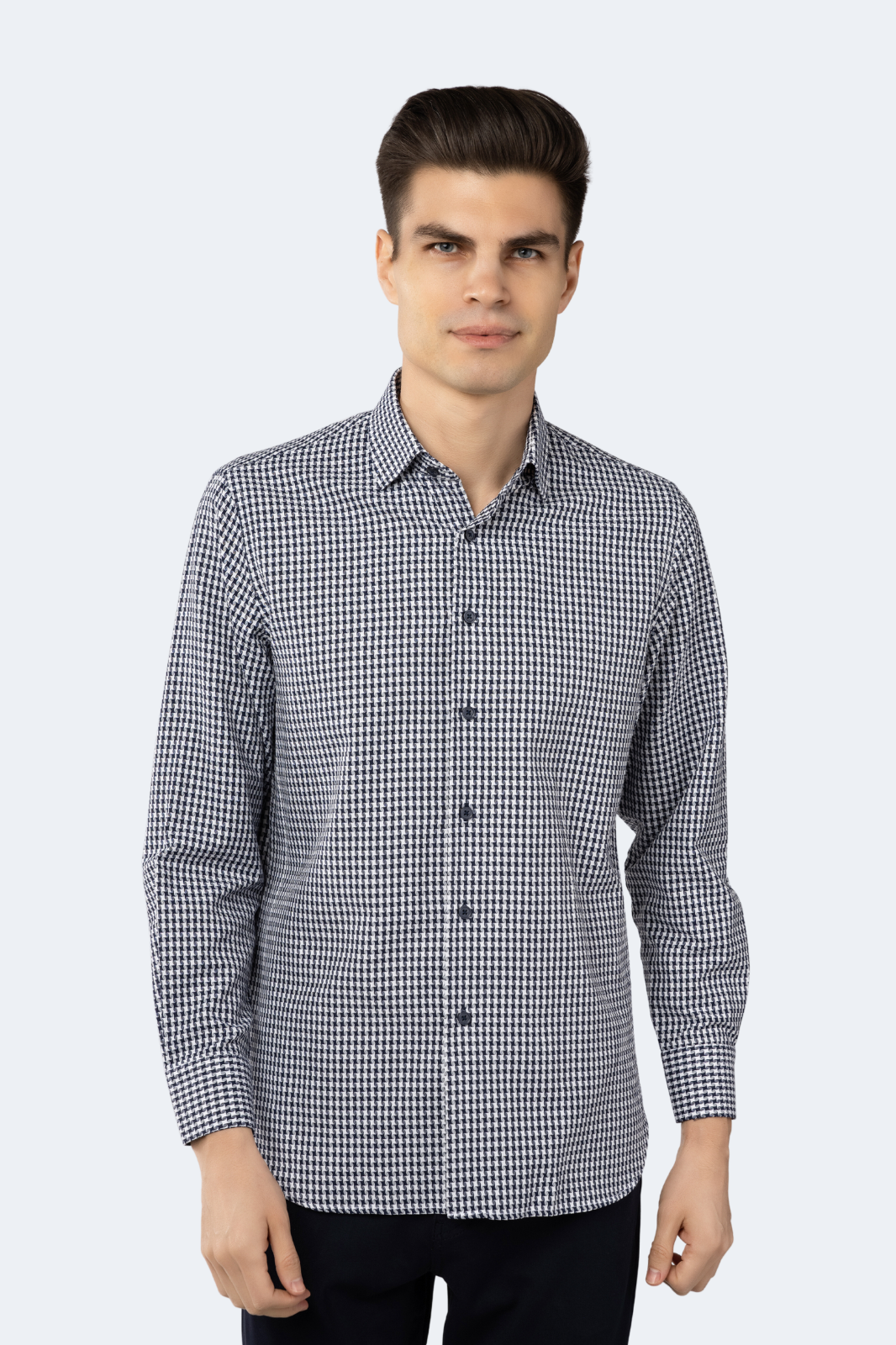 Introducing the FW23 Navy and White Jacquard Square Swirl Design Shirt, a beautiful piece from Luchiano Visconti crafted with a modern fit and stylishly elegant button-down. Adorned with a jacquard pattern of swirling squares, this exquisite shirt will add a touch of luxury to any wardrobe.