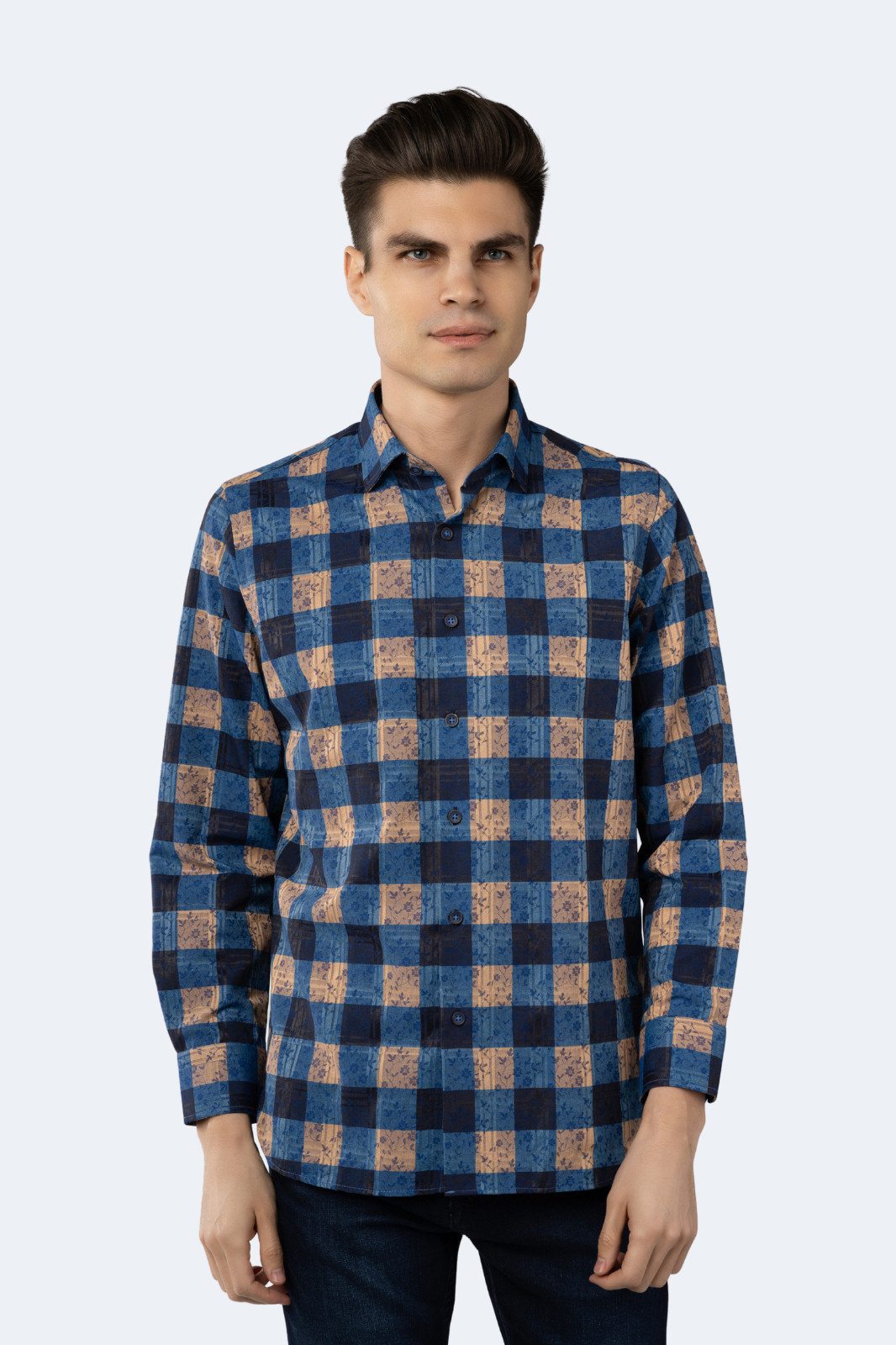 Navy, Blue and Gold Patch Plaid Floral Jacquard Shirt