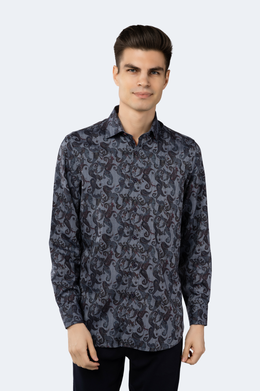 Discover the FW23 Navy Herringbone Jacquard Woven with Paisley Shirt by Luchiano Visconti. An exclusive luxury piece that combines modern craftsmanship with art-infused design. Its button-down silhouette and contemporary fit exude effortless sophistication.