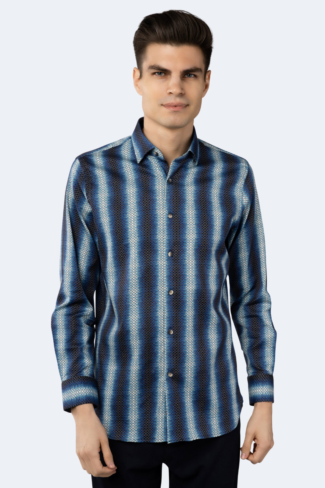 This FW23 Navy Light Blue Gradient with Gold Circle Chain Shirt from Luchiano Visconti is the perfect way to make a statement. Crafted with a shimmering navy-light blue gradient and delicate gold circle chain detailing, this button-down shirt exudes sophistication and elegance.