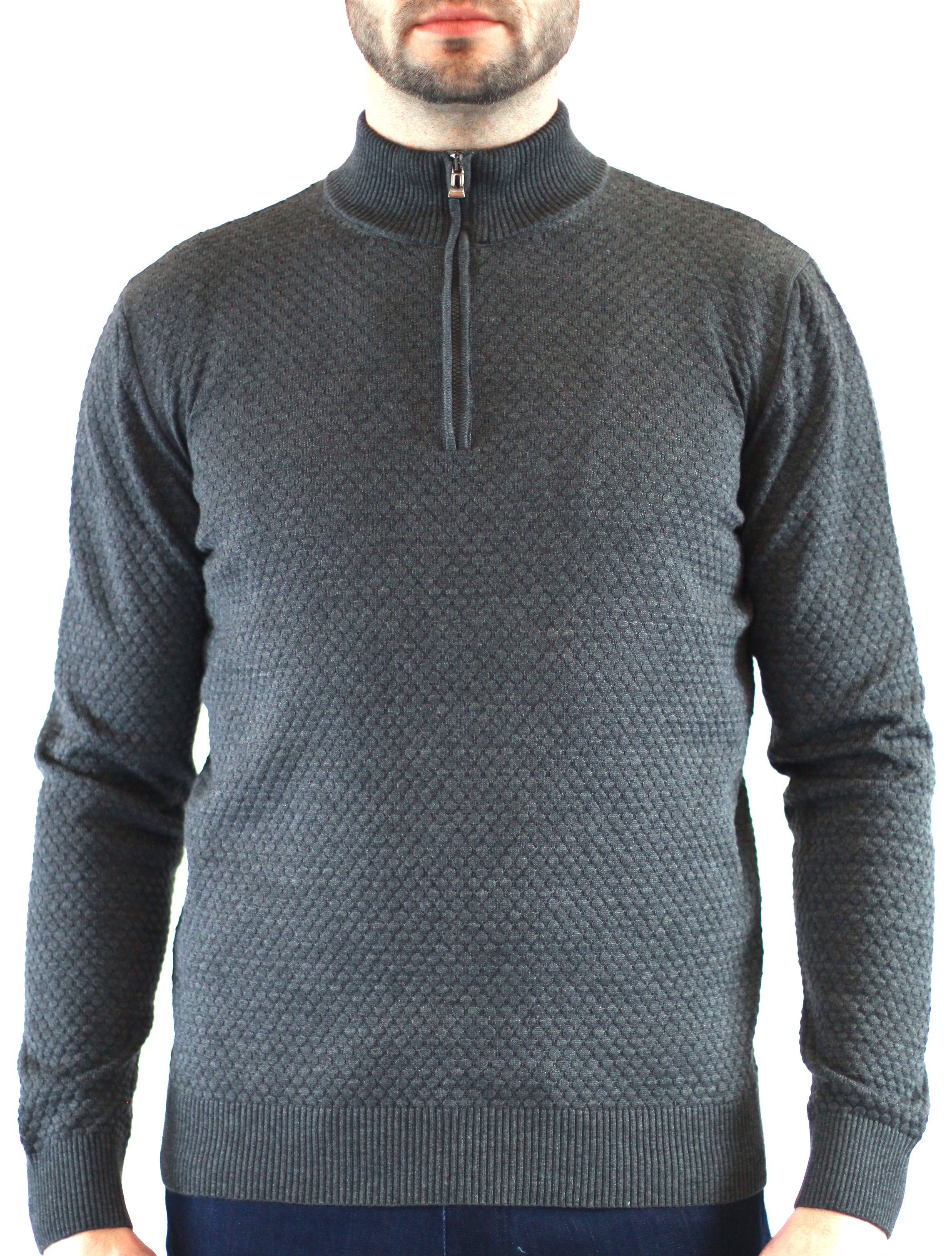 3/4 Zip sweater in grey bubble knit. Material is 70% mercerized Cotton and 30% Modal.
