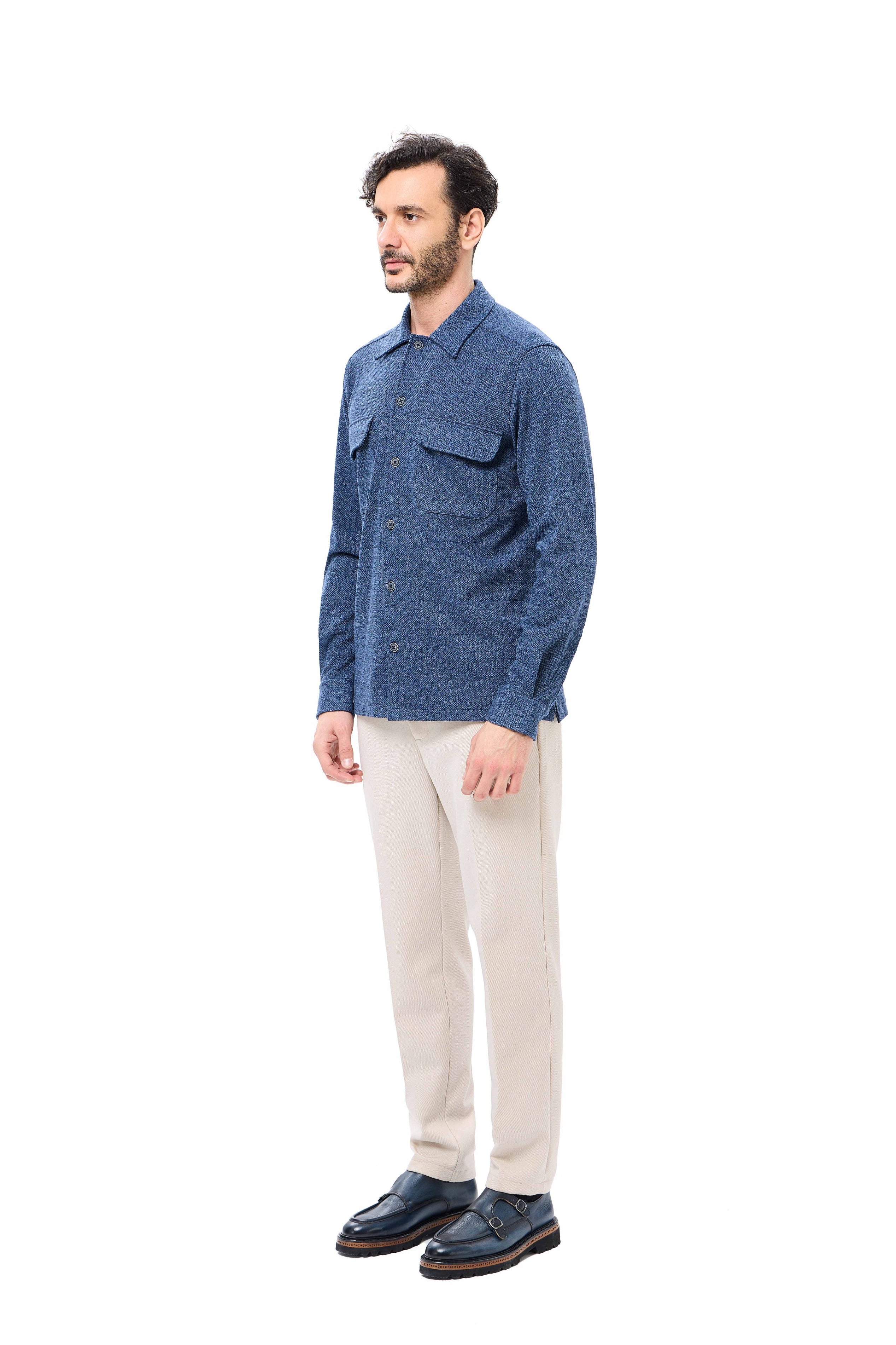 Stay sharp and comfortable in this Indigo Dobby Double-Faced Knit Shirt Jacket, designed with versatility in mind. Made from a sustainable blend of 65% recycled polyester, 30% viscose, and 5% elastane, it offers a soft yet durable finish with just the right amount of stretch. Featuring two button-flap chest pockets, a full button-down front, and clean tailoring, this piece works effortlessly as both a shirt and a lightweight jacket. A perfect layering essential for the Fall season, combining modern style with everyday ease.