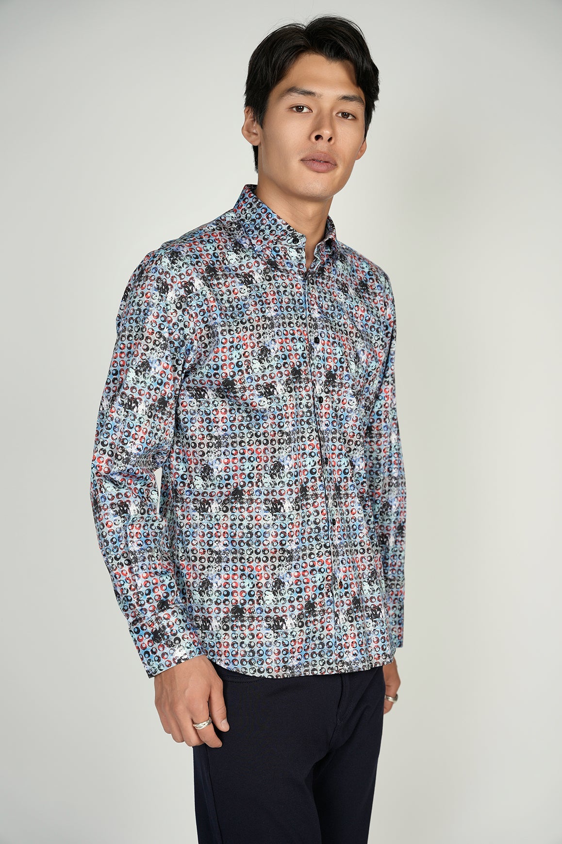 Teal and blue performance stretch shirt with orange and black circular shapes.