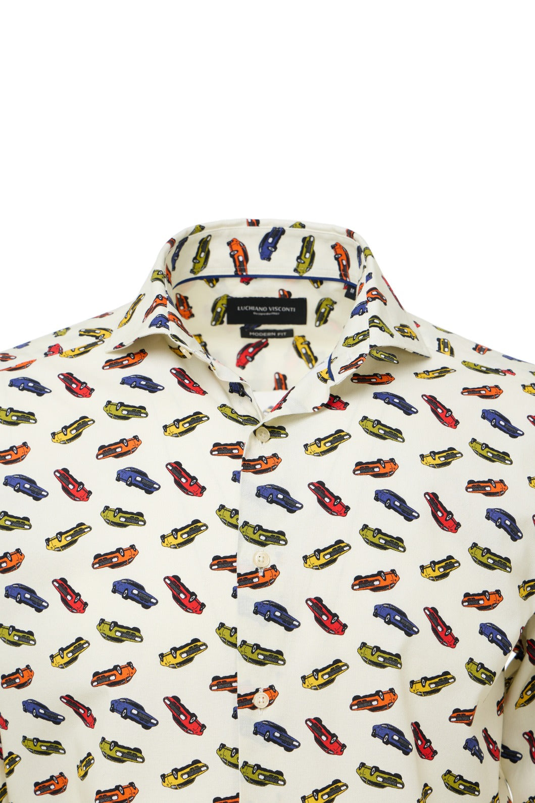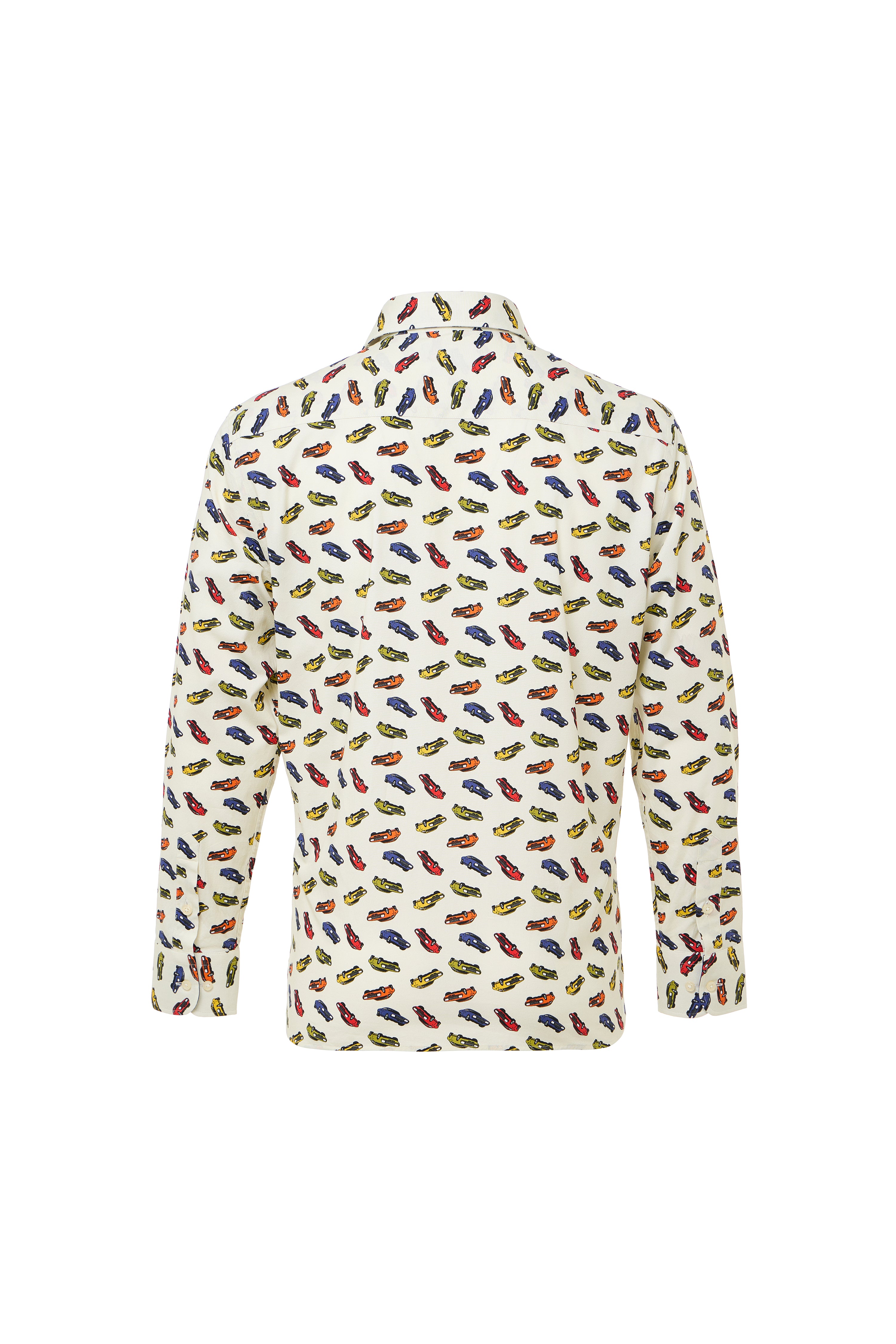 Add personality to your wardrobe with this playful multicolor car print shirt, designed for comfort and style. Made from 97% organic cotton with 3% elastane, it offers a soft feel with a hint of stretch for all-day wear. Featuring contrast piping inside the collar, cuffs, and side slits, this button-down is perfect for making a fun statement while staying polished. A standout choice for the fall season, it's a versatile piece that pairs easily with jeans or trousers.