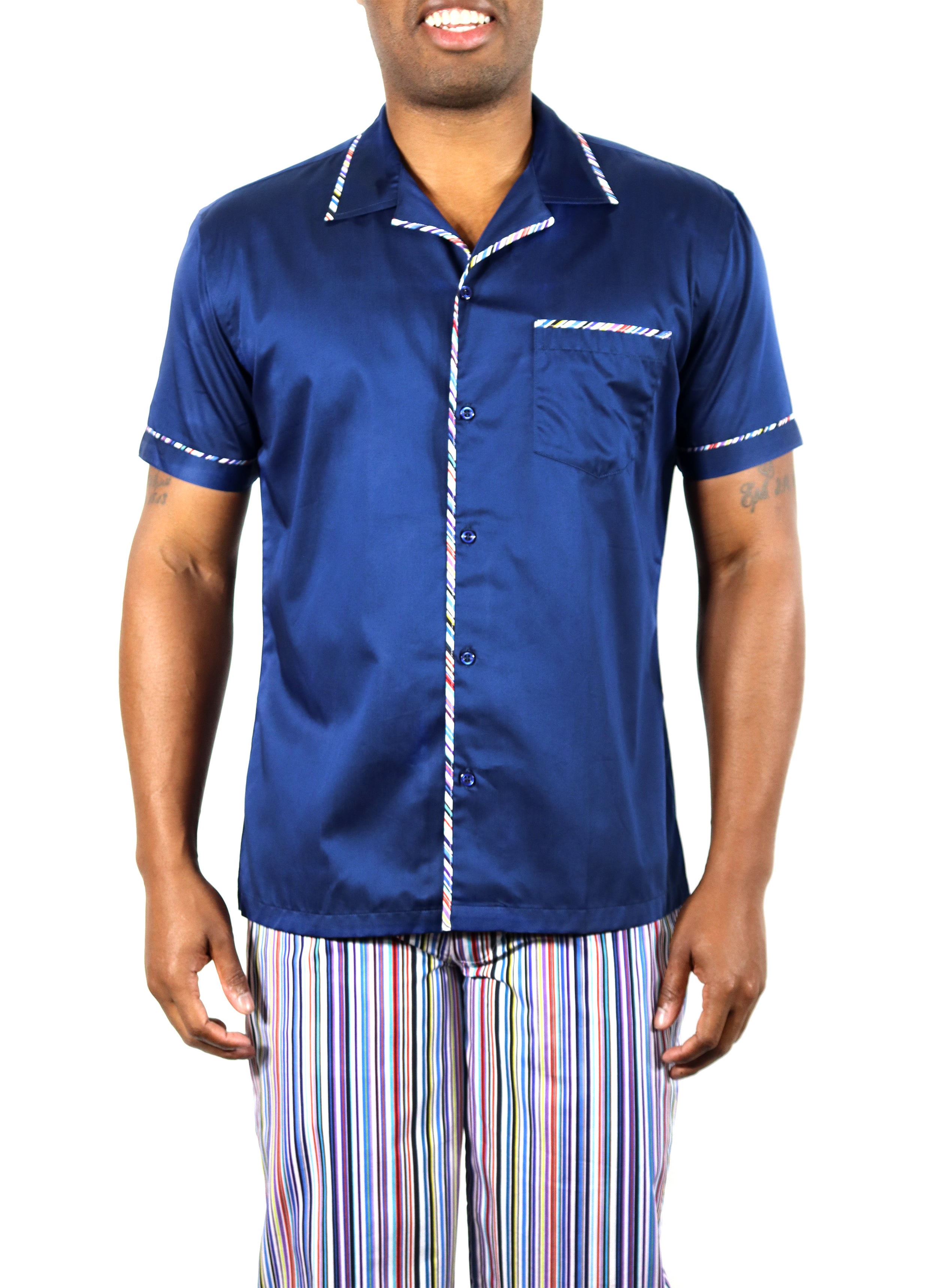 Top: Navy pajama top with multicolor stripe detailing and front chest pocket.