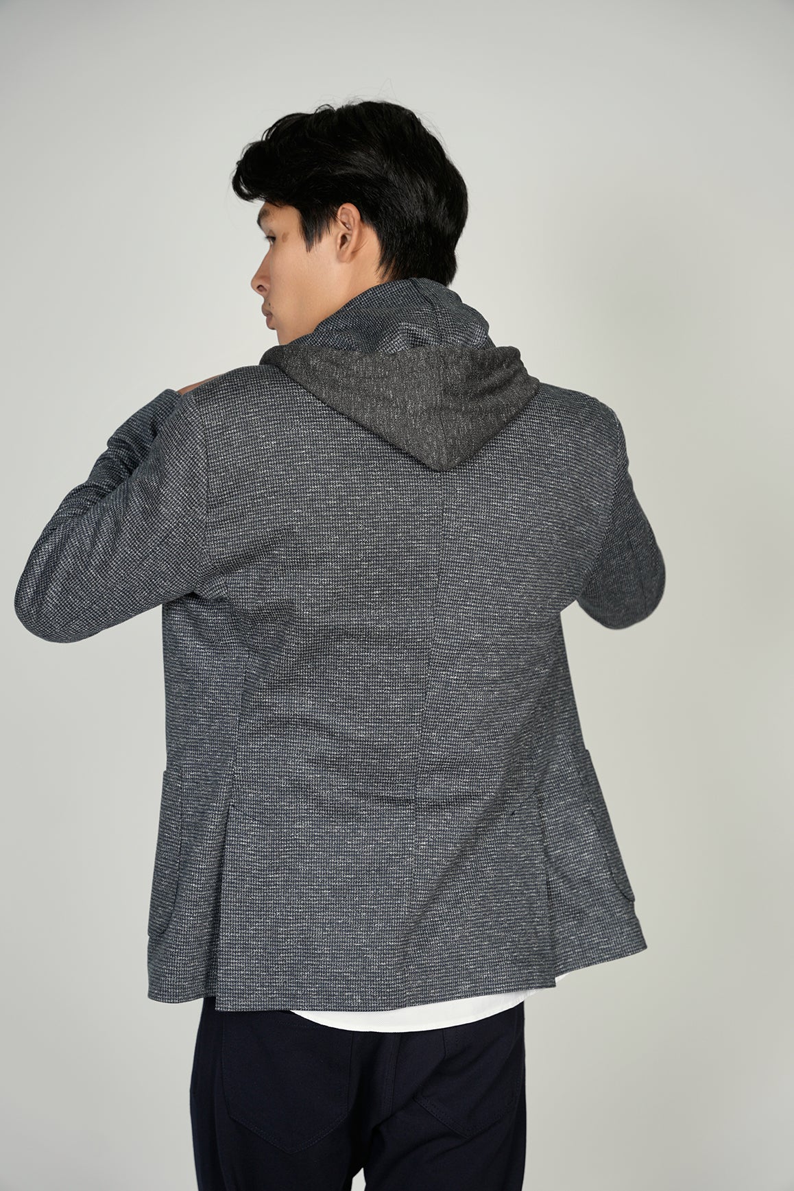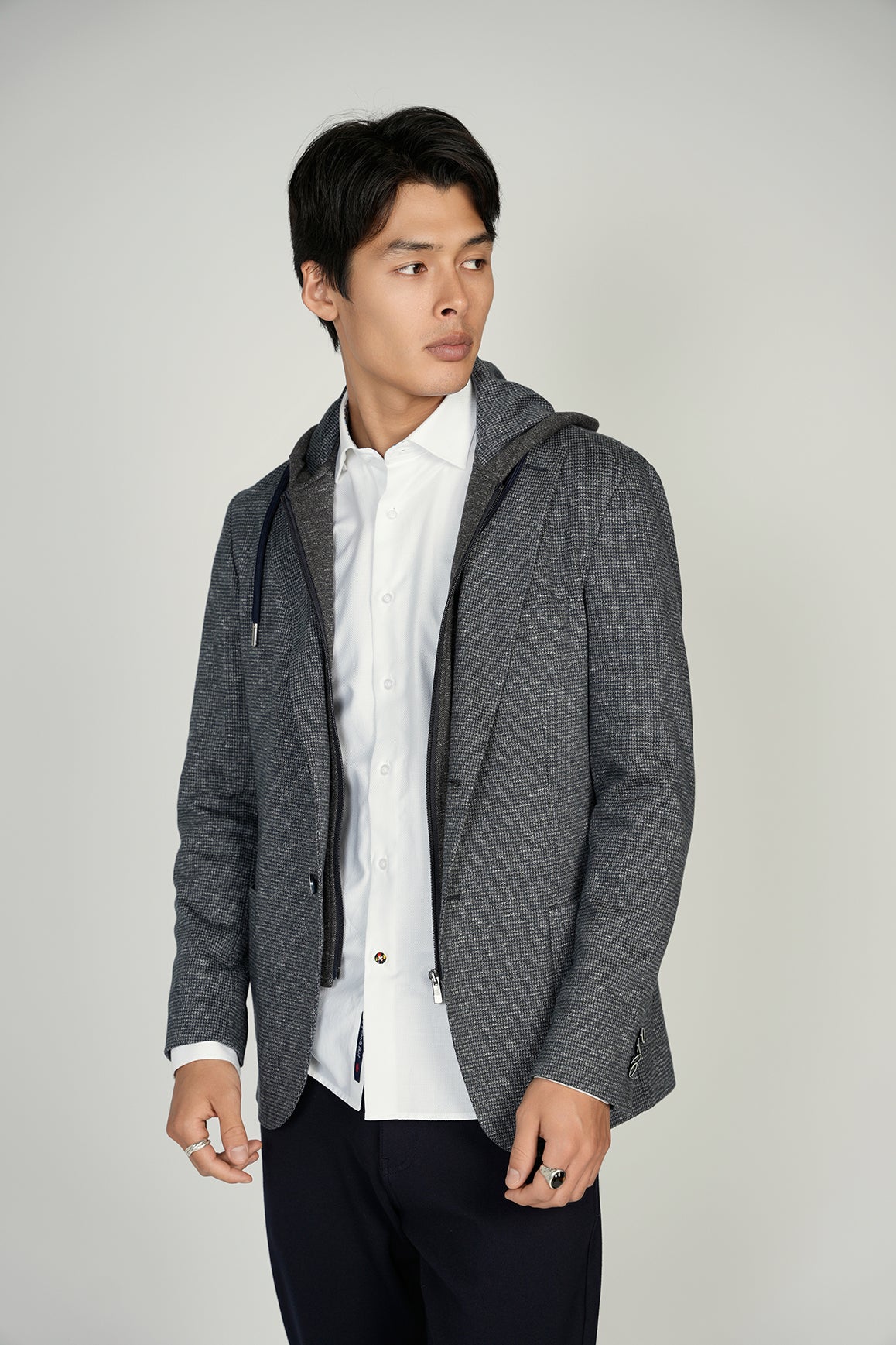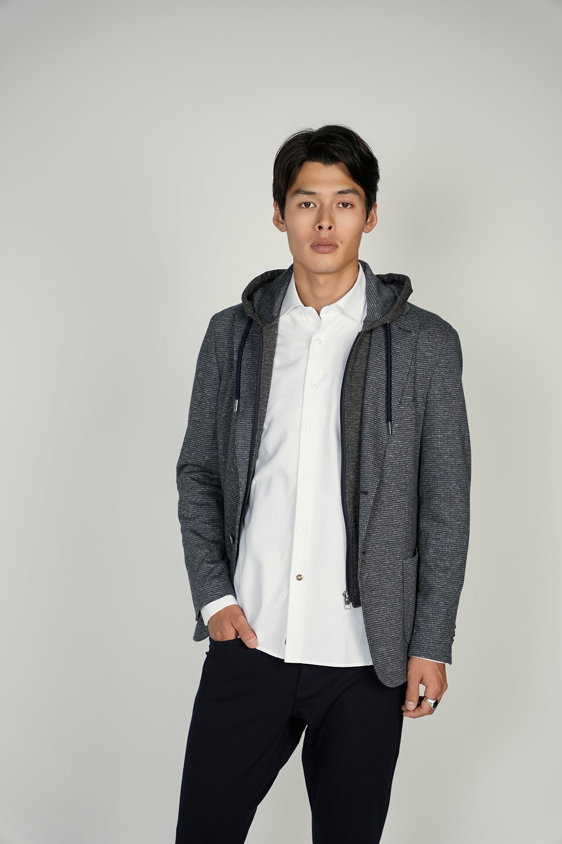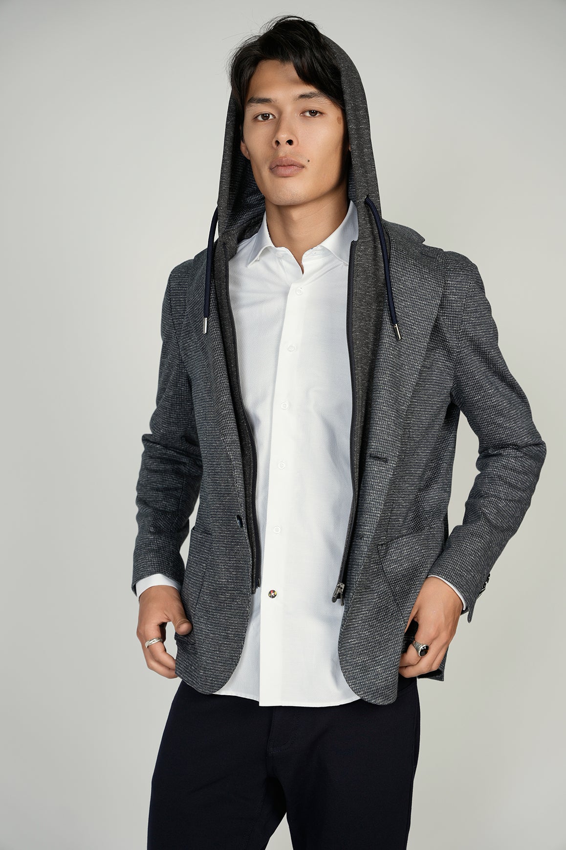 Navy and grey sharktooth sportcoat with removable front hoodie.