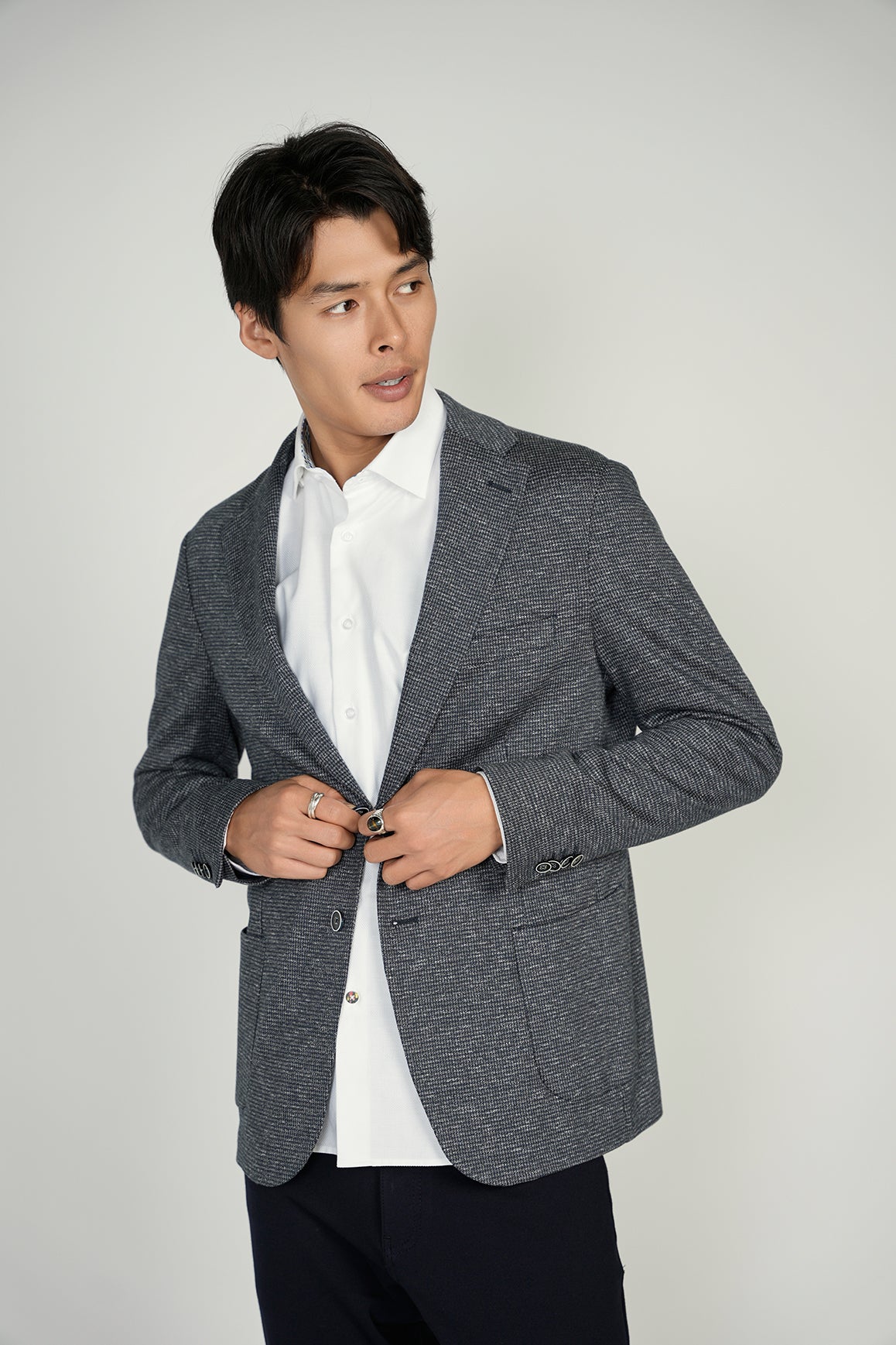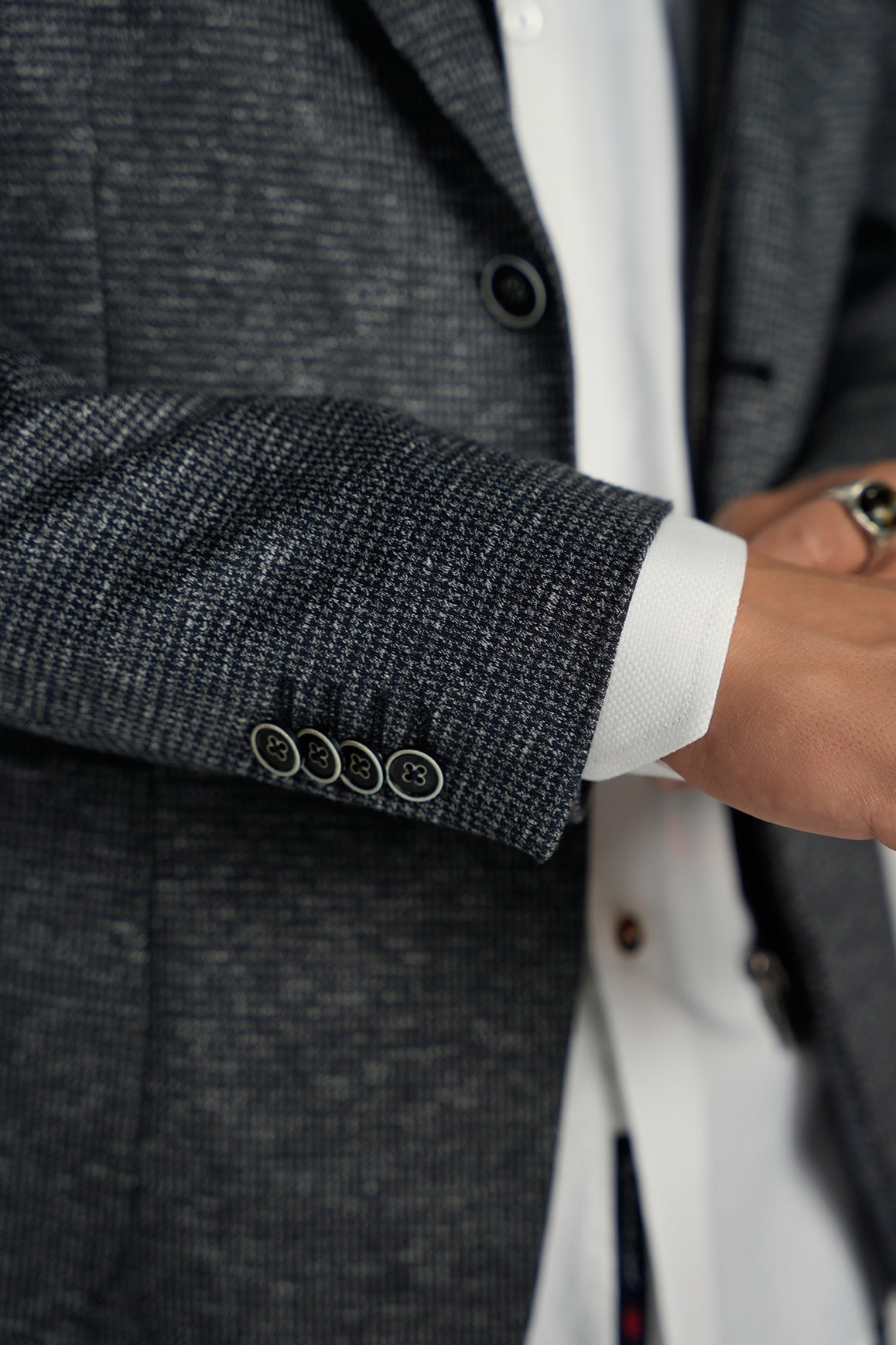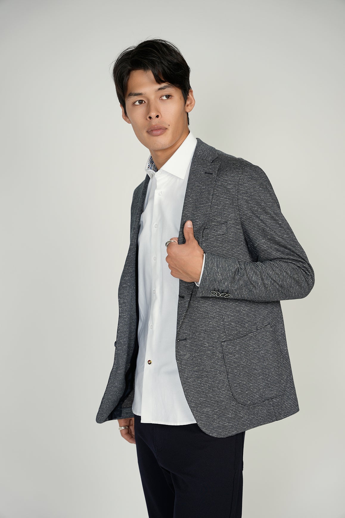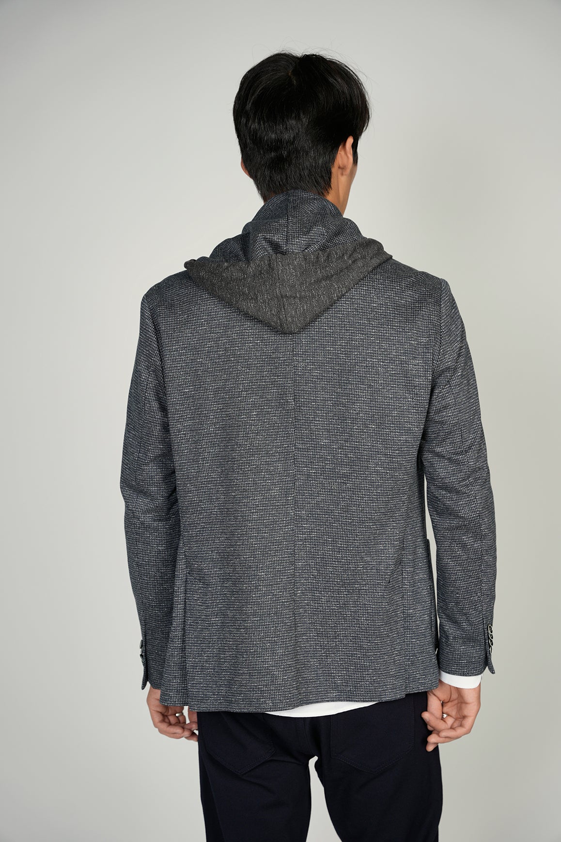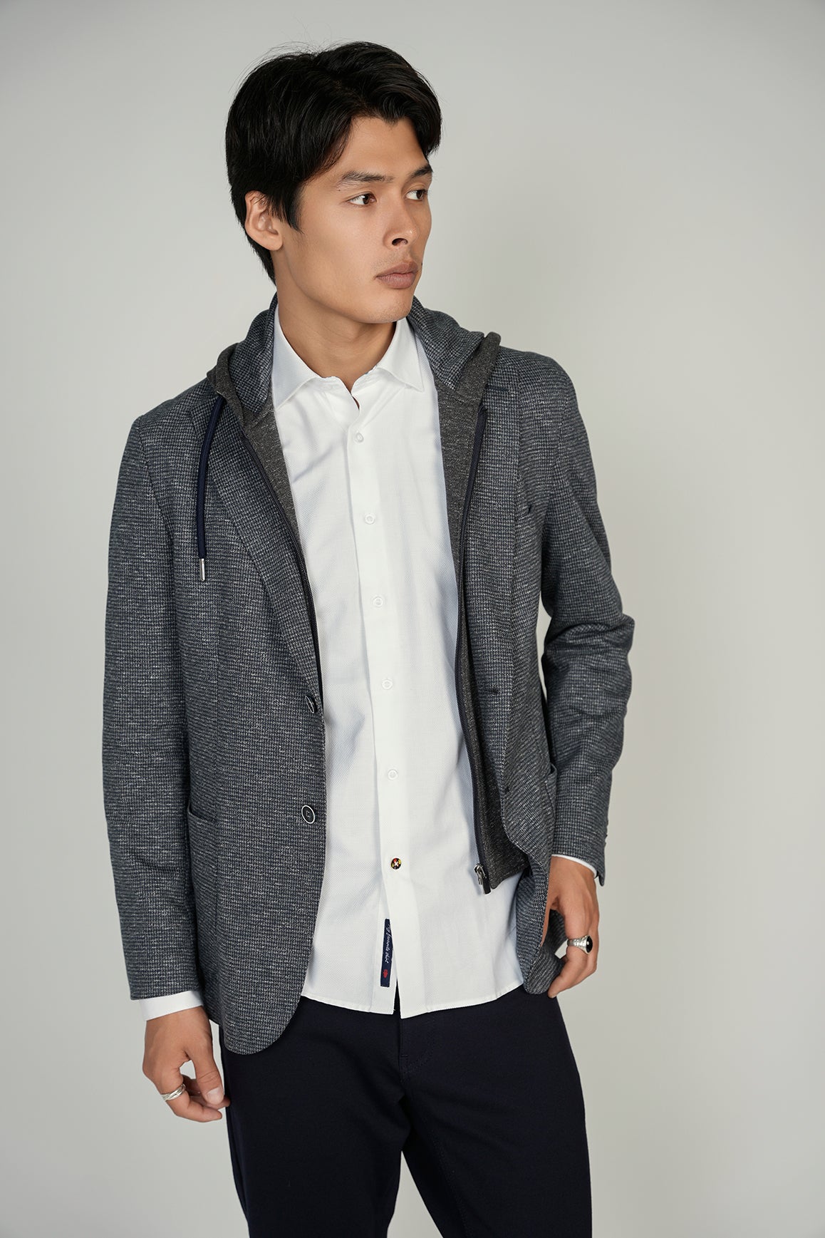 Navy and grey sharktooth sportcoat with removable front hoodie.