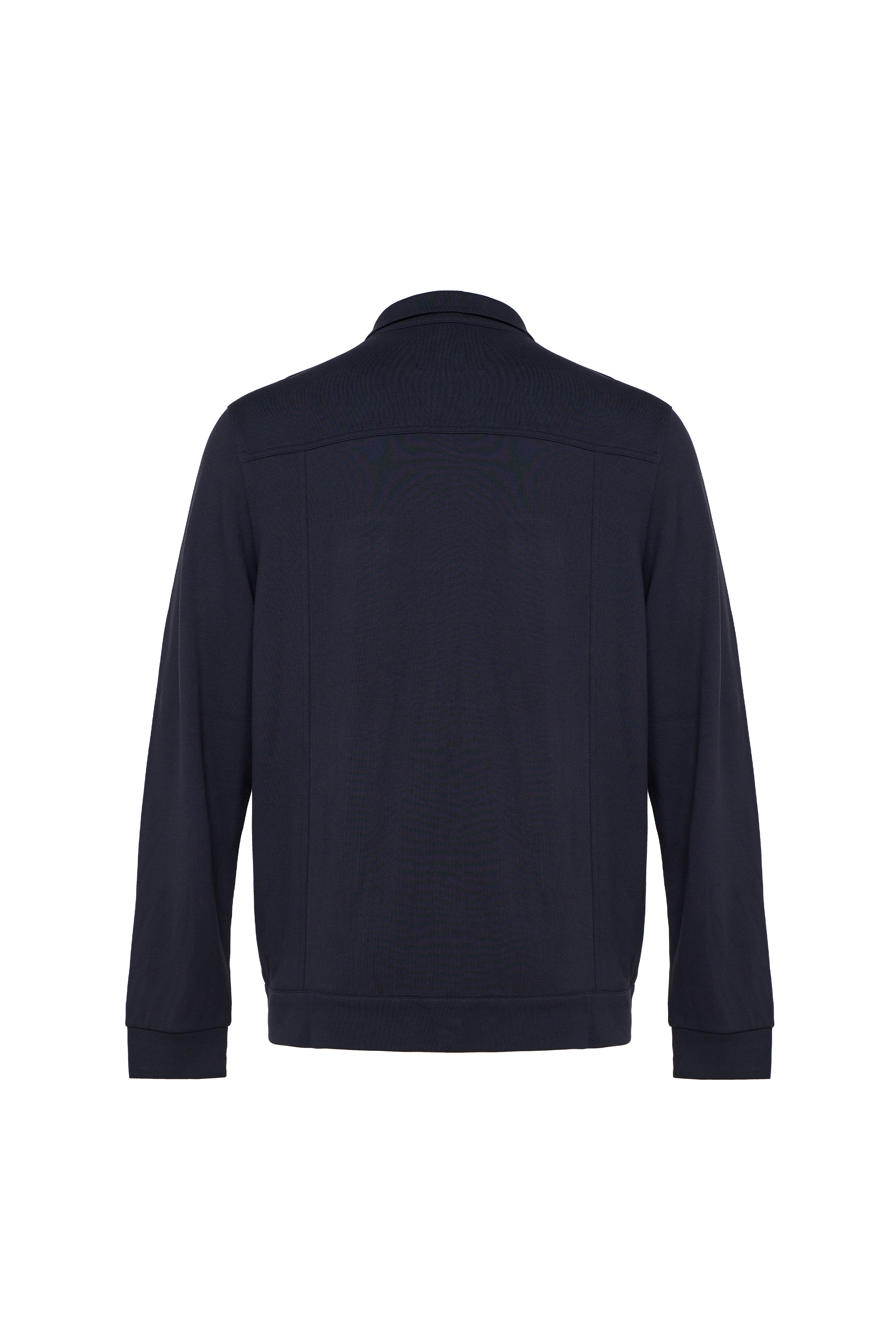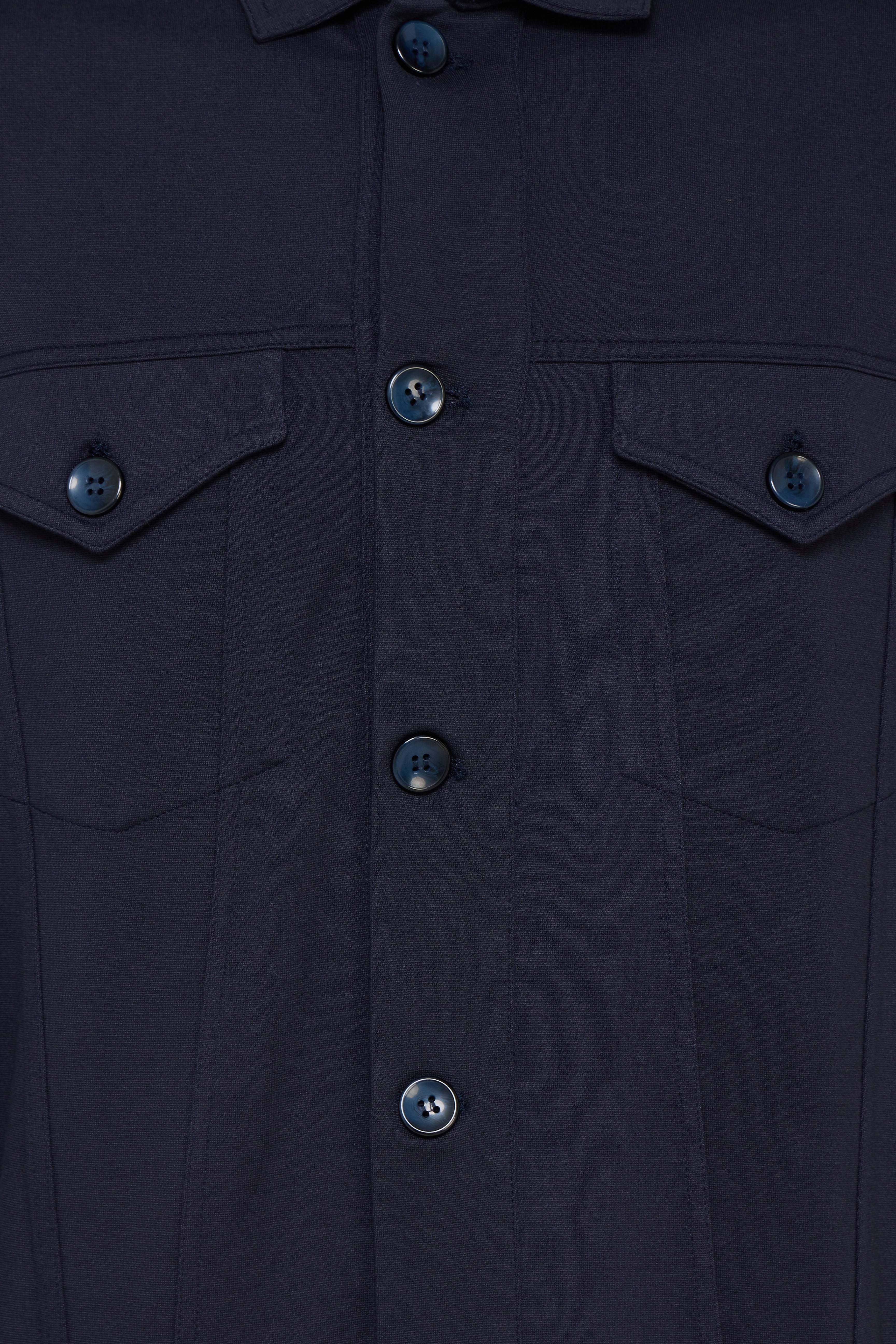 Elevate your fall wardrobe with this refined Interlock Mercerized Button-Up in navy. Crafted from 100% mercerized interlock, it offers a smooth, durable feel with a subtle satin finish that adds polish to any look. Featuring two front pockets and a clean button-up design, this versatile outerwear piece delivers both sophistication and comfort. Perfect for layering or wearing on its own, it's an essential choice for effortless everyday style.
