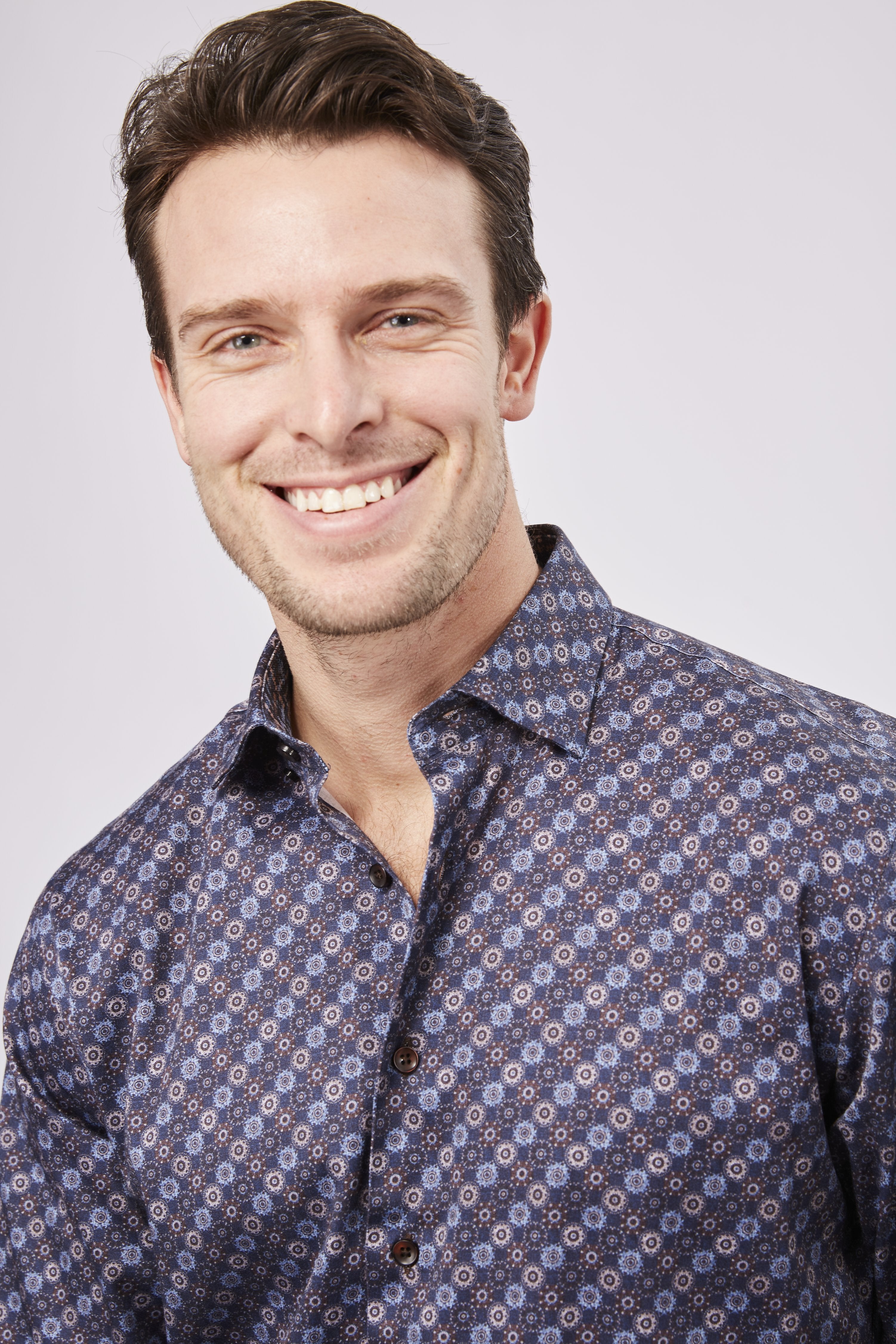Long sleeve shirt in navy with brown floral designs. Material has a satin finishing with natural stretch.