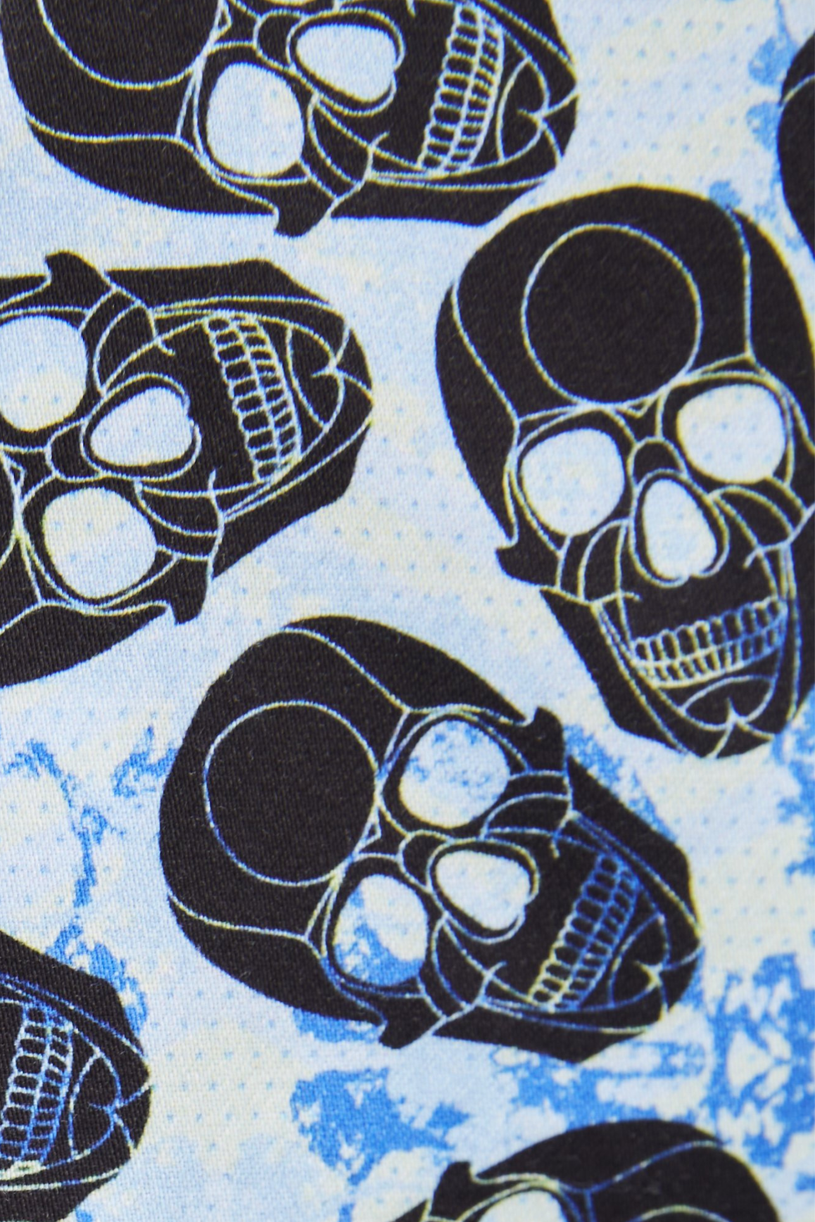 Short sleeve shirt in Light Cyan and French Blue and Yellow with Black Skulls. Natural stretch.