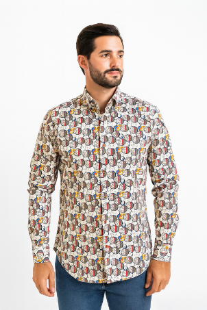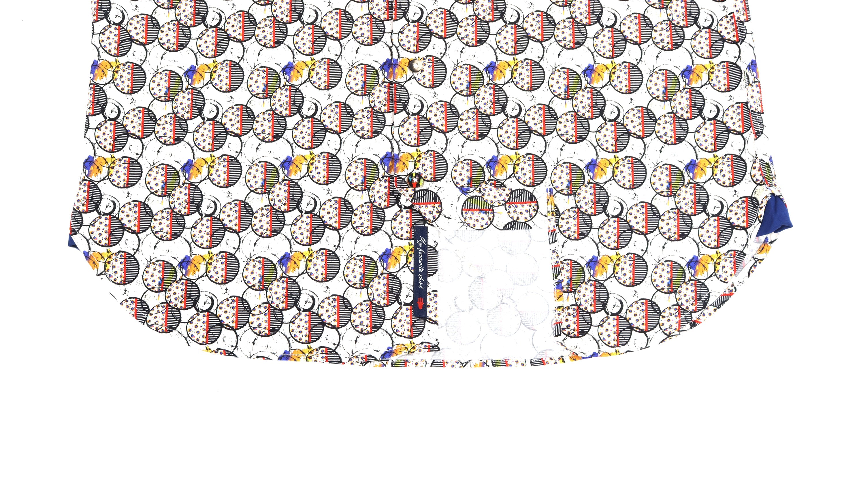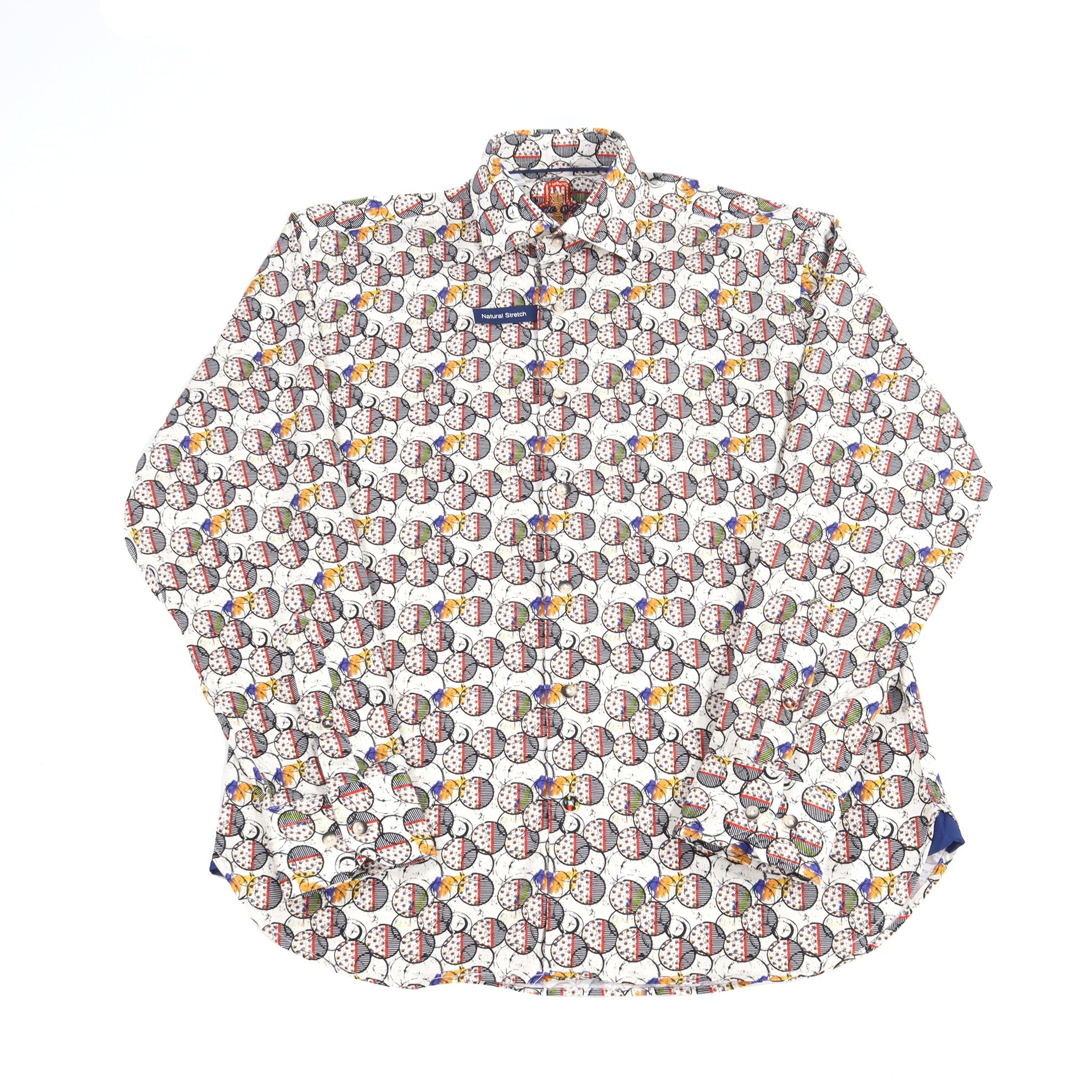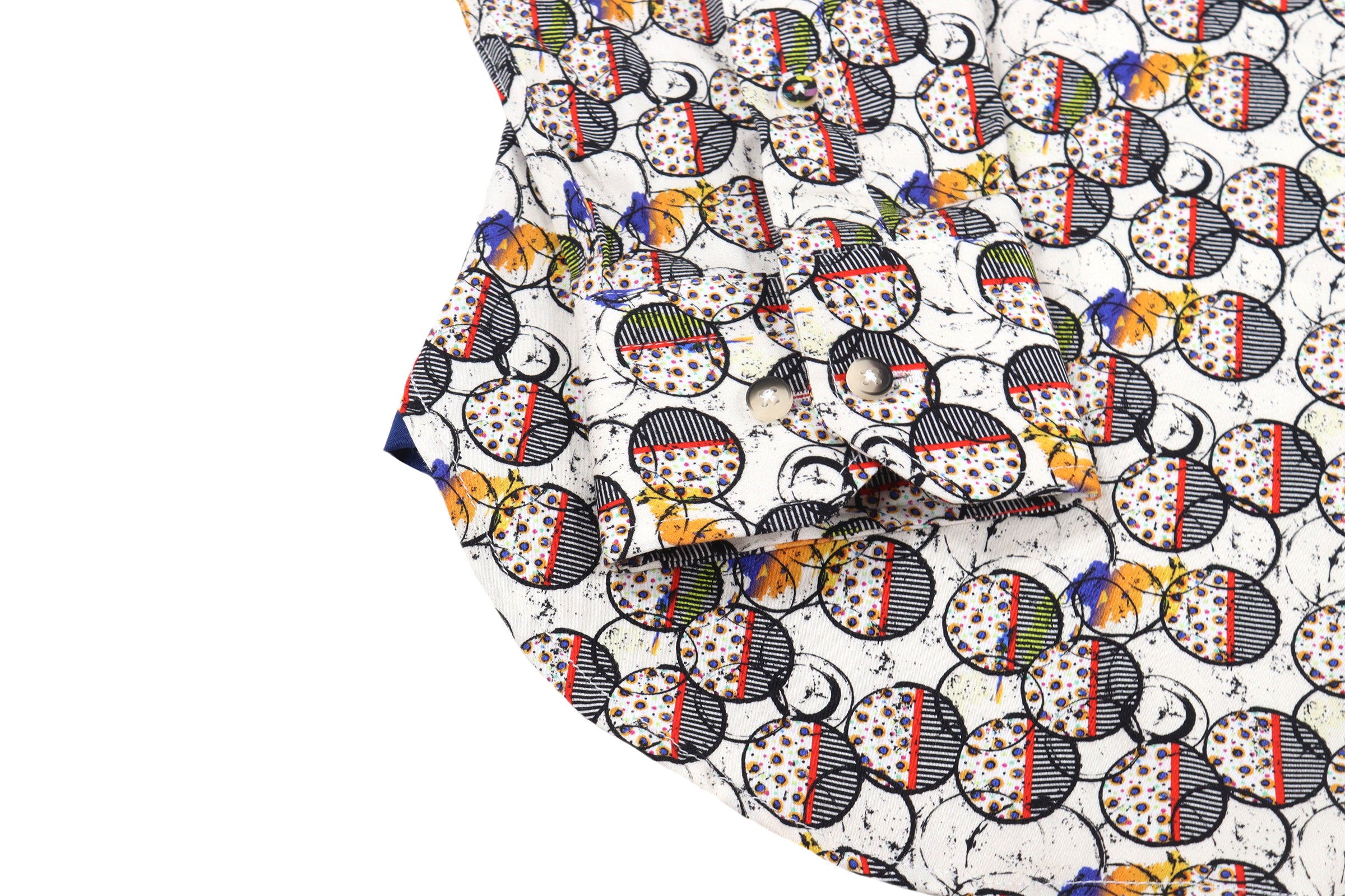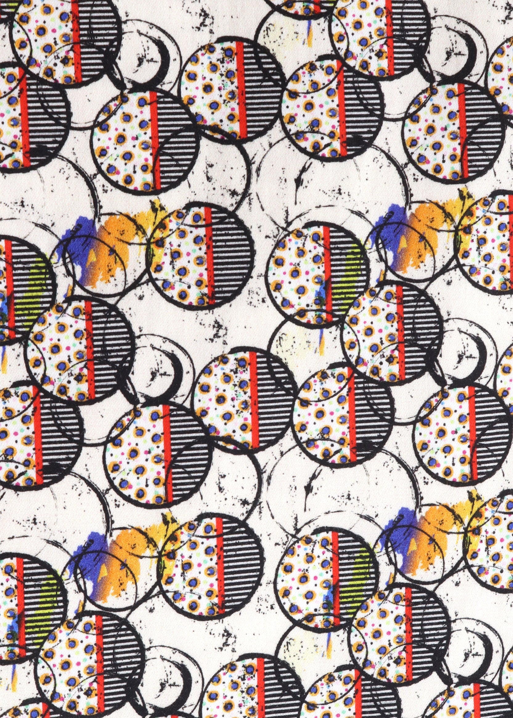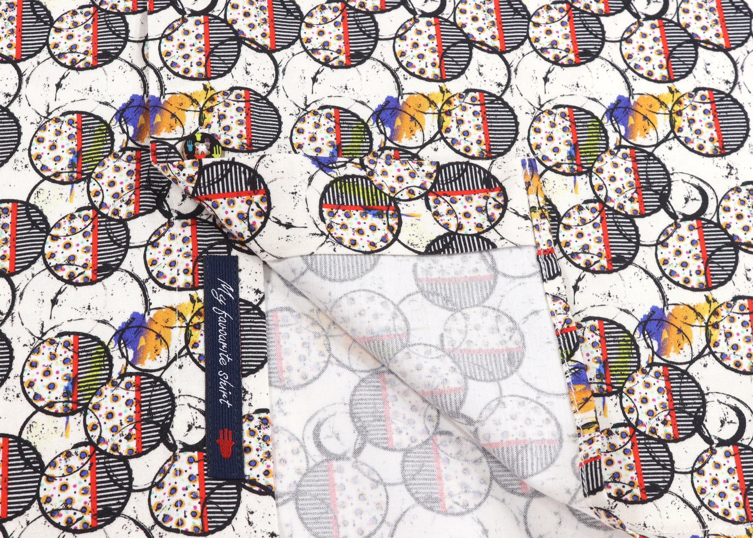 Long sleeve shirt in white with black, red, and orange circles with dots and stripes. Natural stretch.
