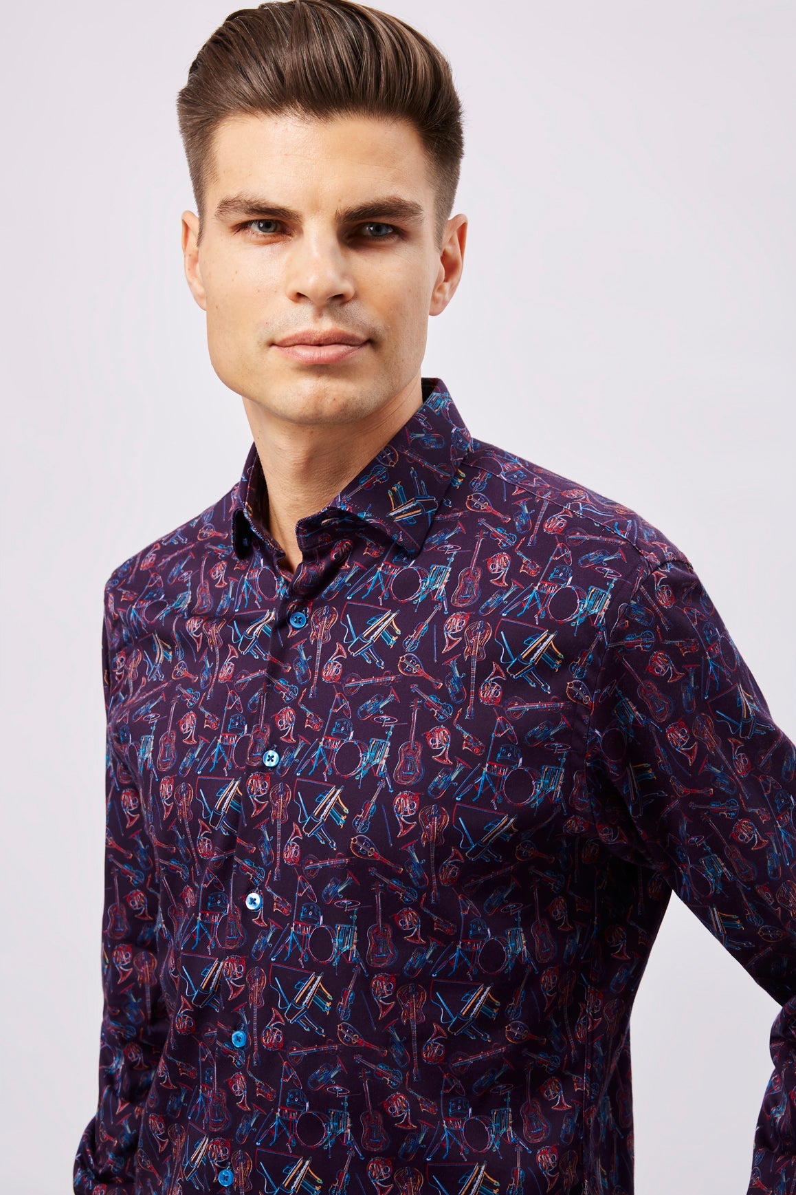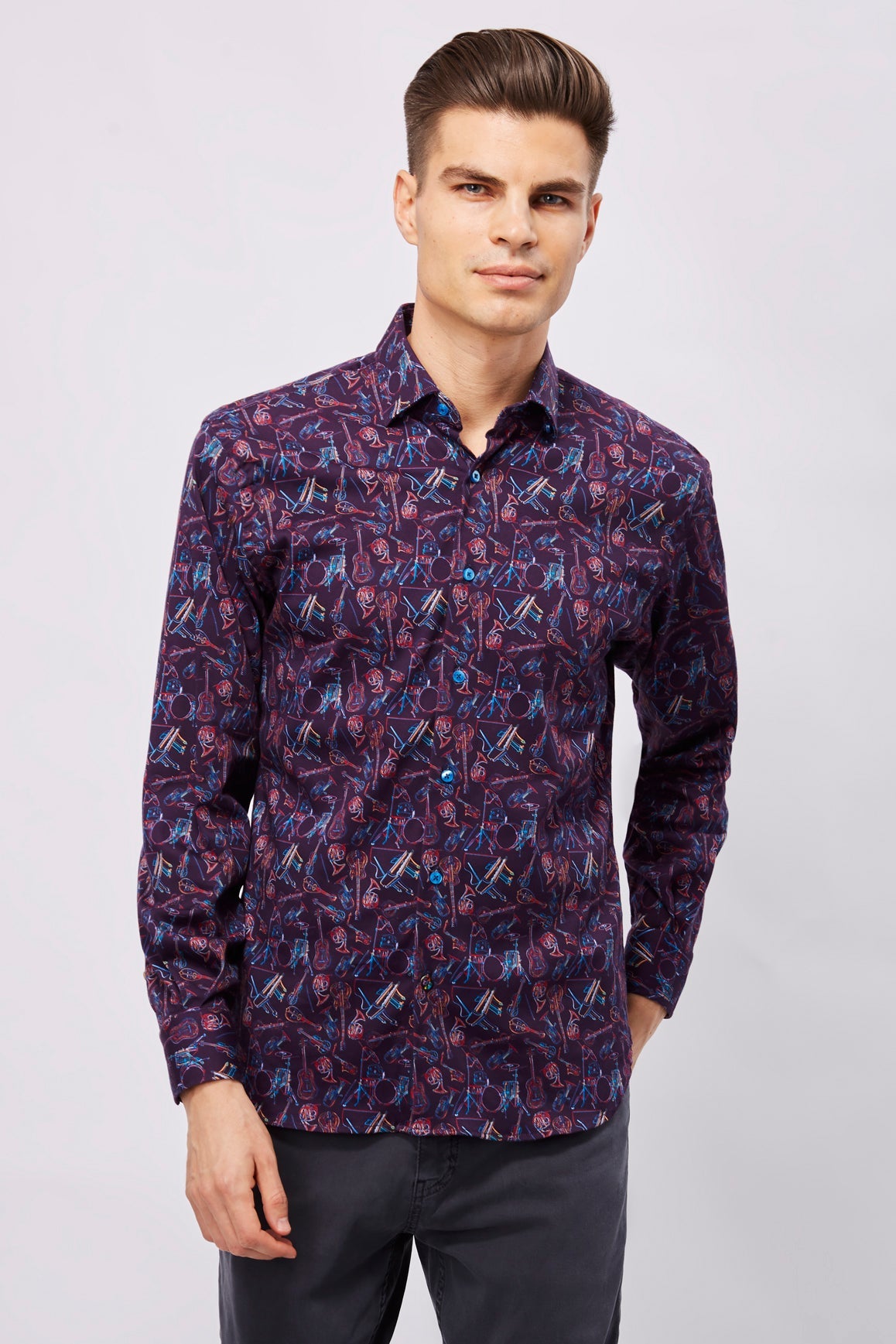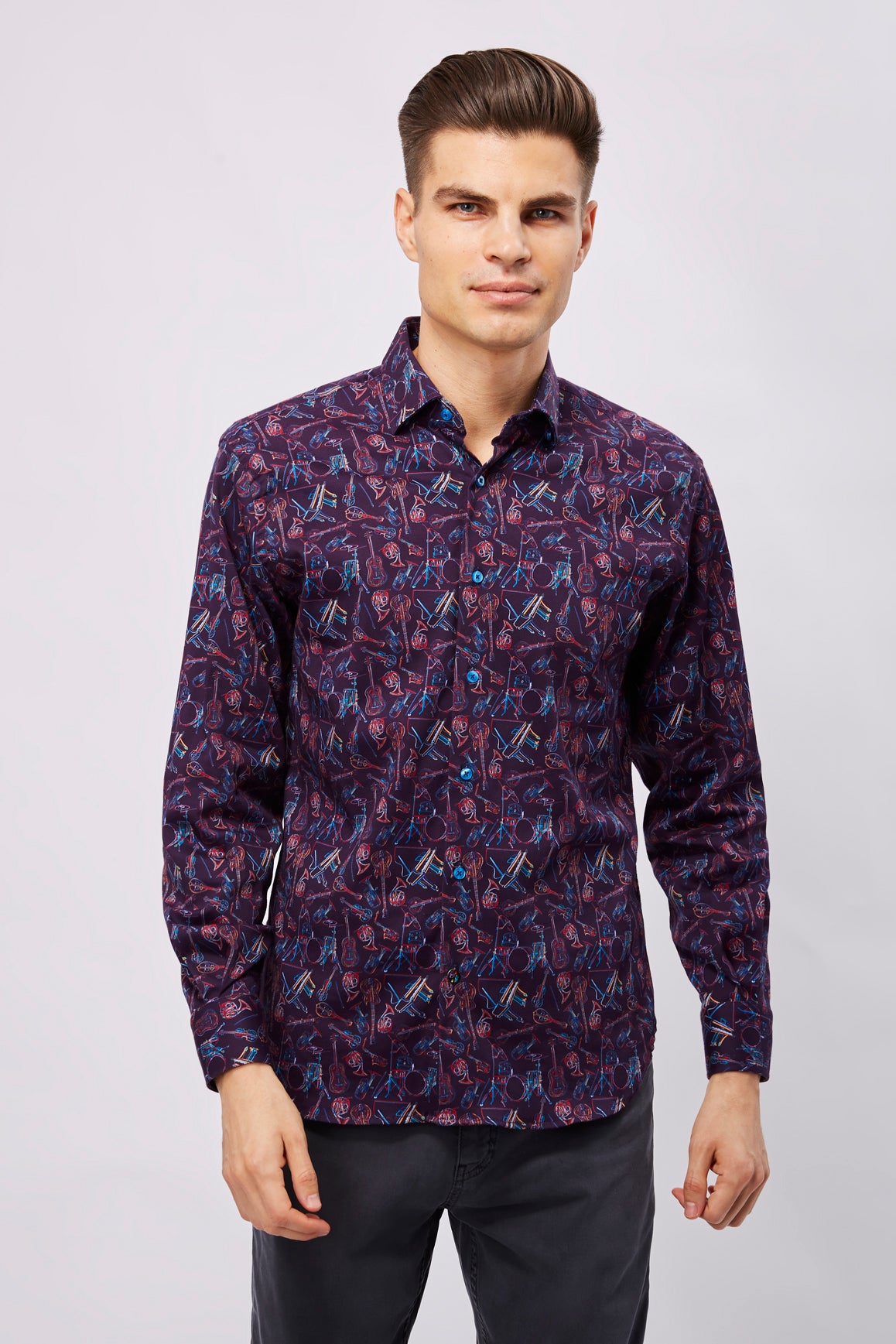 Long sleeve shirt in eggplant with multicolor instruments. Natural stretch.