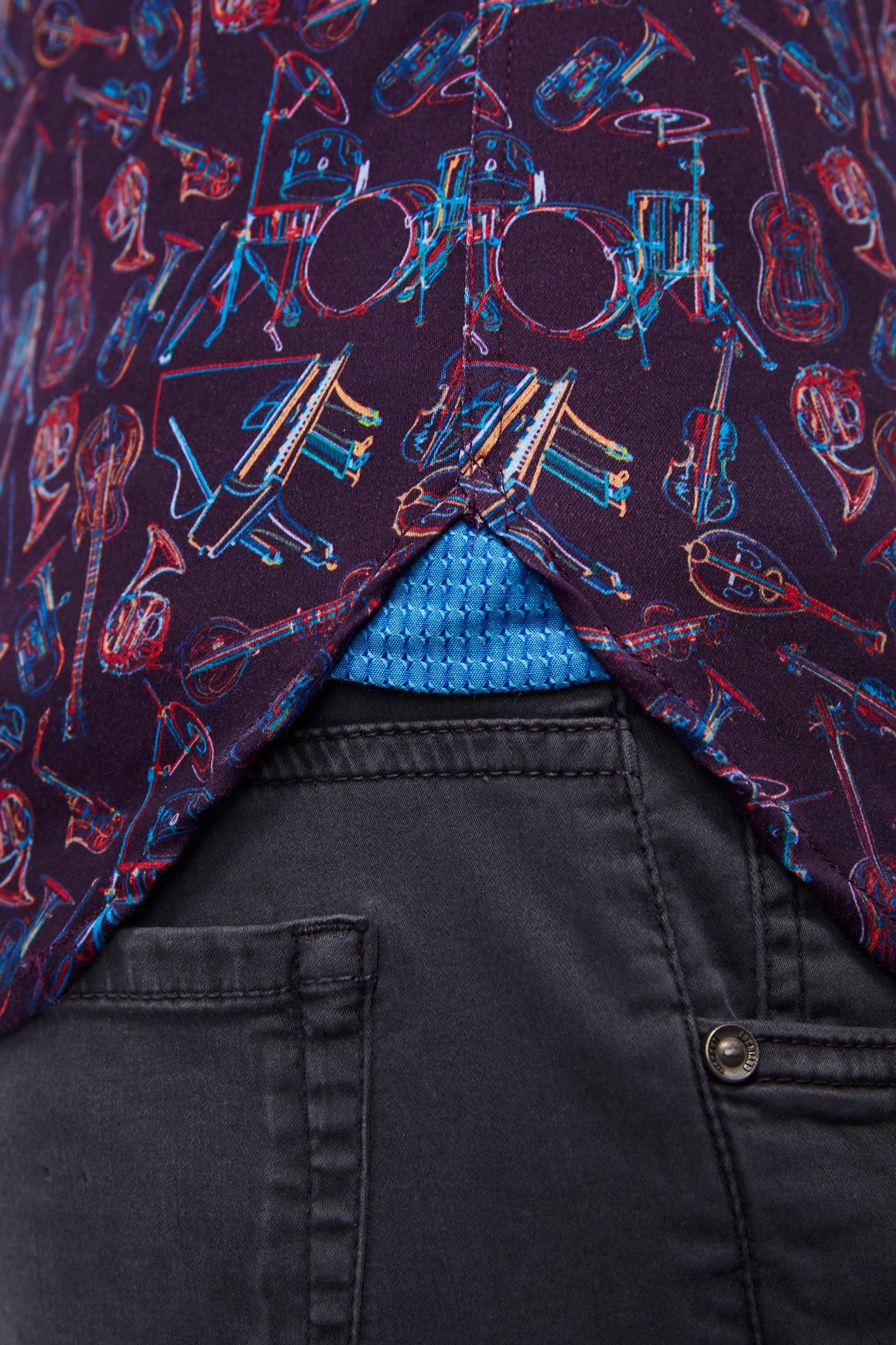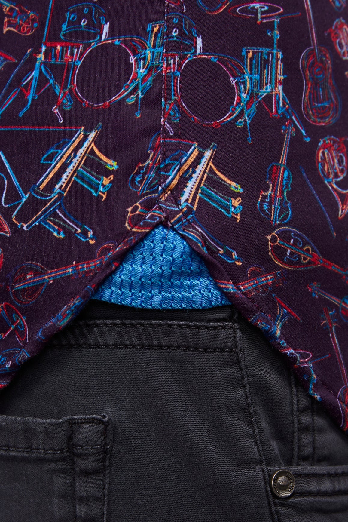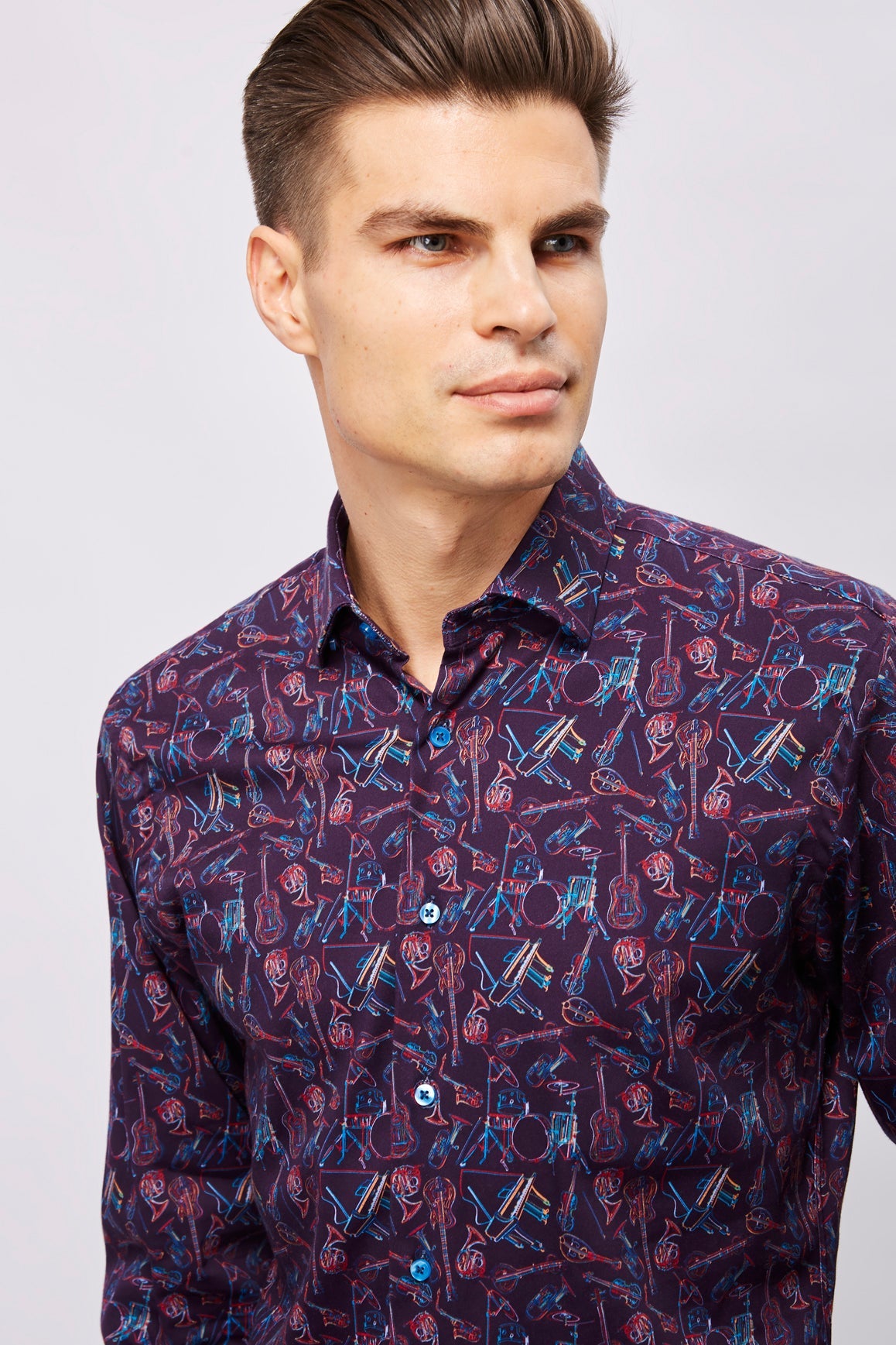 Long sleeve shirt in eggplant with multicolor instruments. Natural stretch.