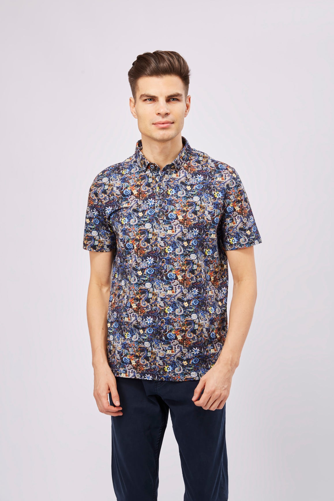 Short sleeve polo in multi mosaic floral design.