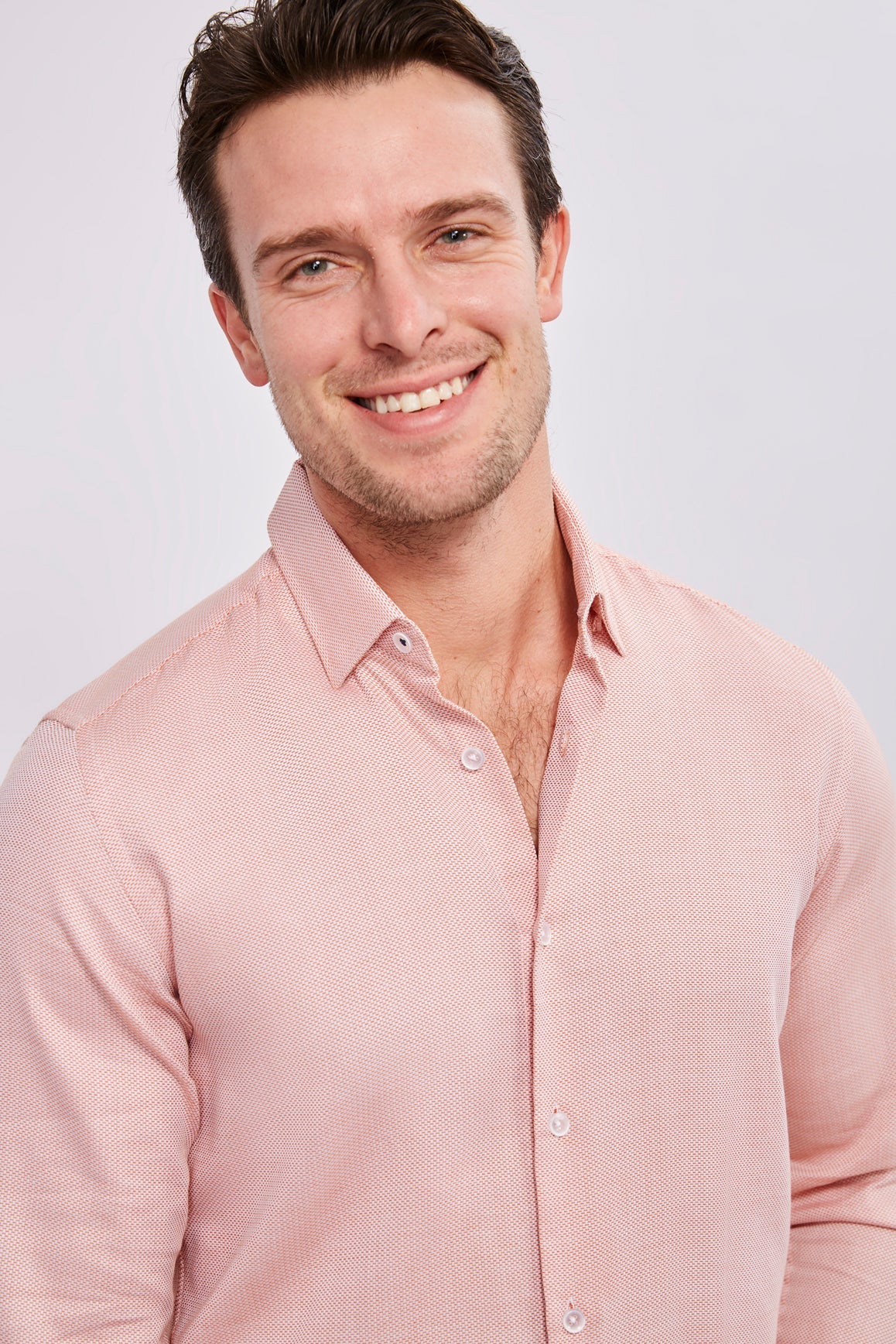 Long sleeve shirt in orange and white woven jacquard. The Leo fit is a slim fit and is designed to provide you with a slimmer, chicer aesthetic.