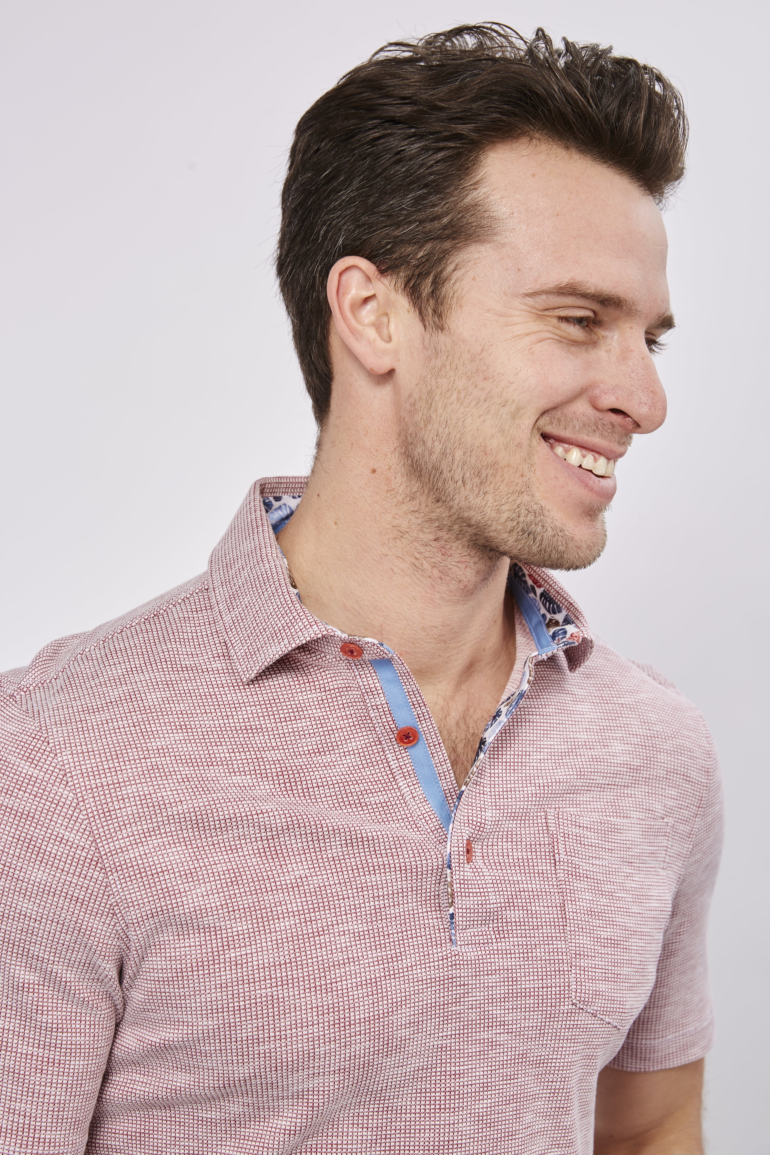 Short sleeve jersey knit polo in red and white waffle check with one pocket.