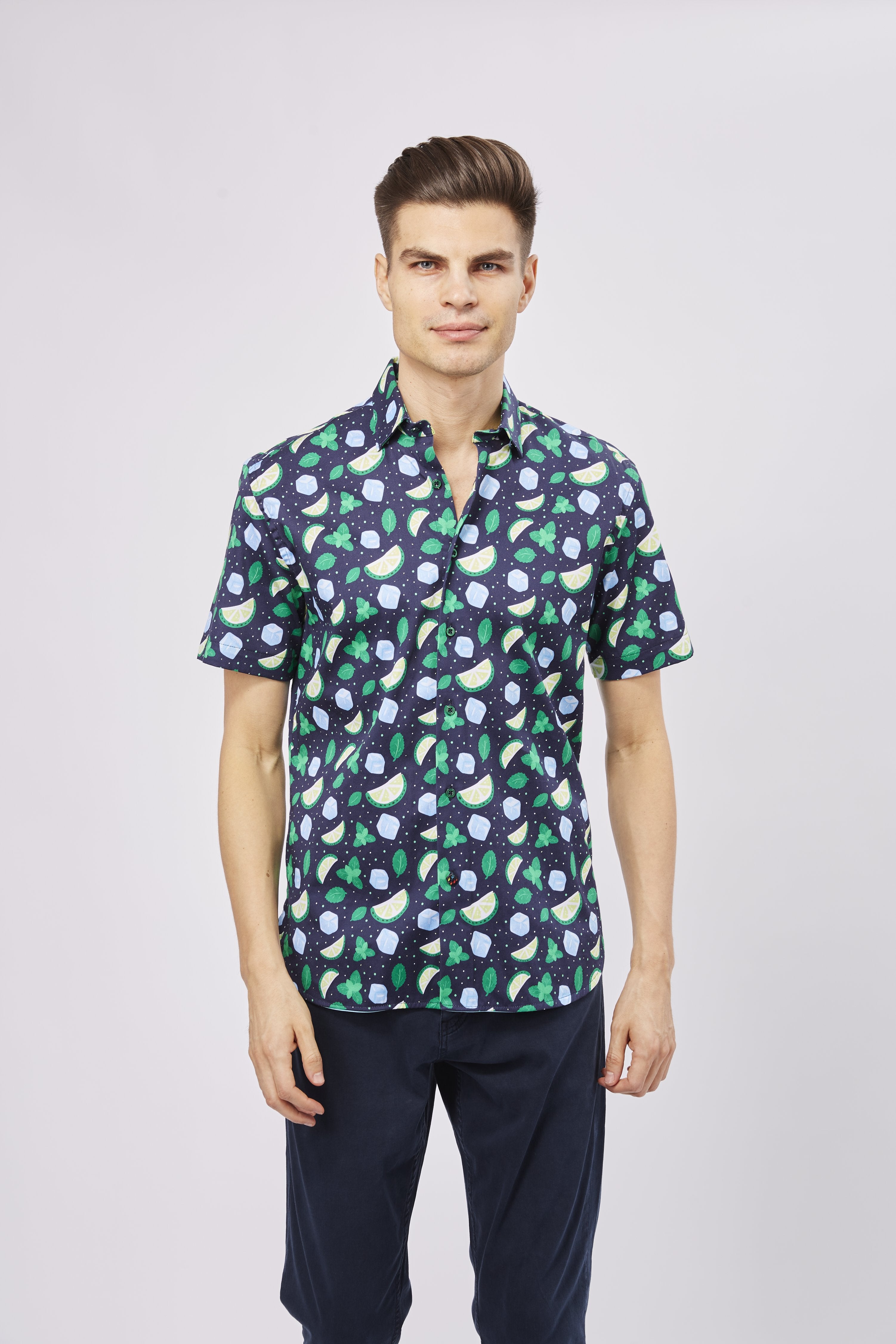 Short sleeve shirt in navy with mojito print - Limes, mint leaves and ice cubes. Natural stretch.