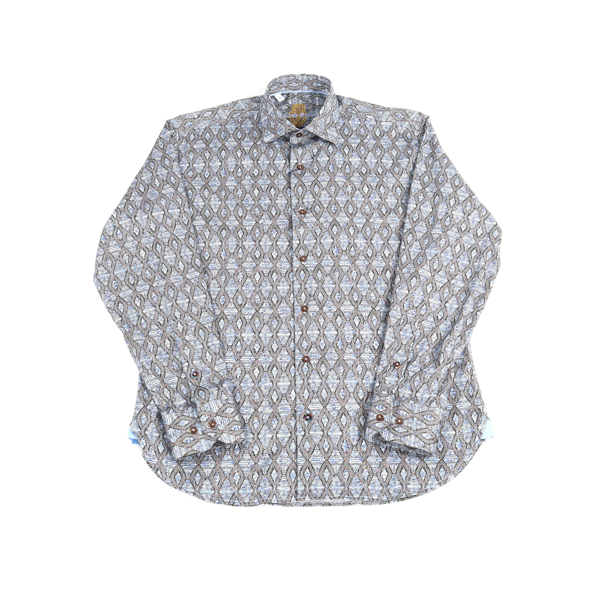 Long sleeve shirt in multi blues with diamond stripe design. Natural stretch.