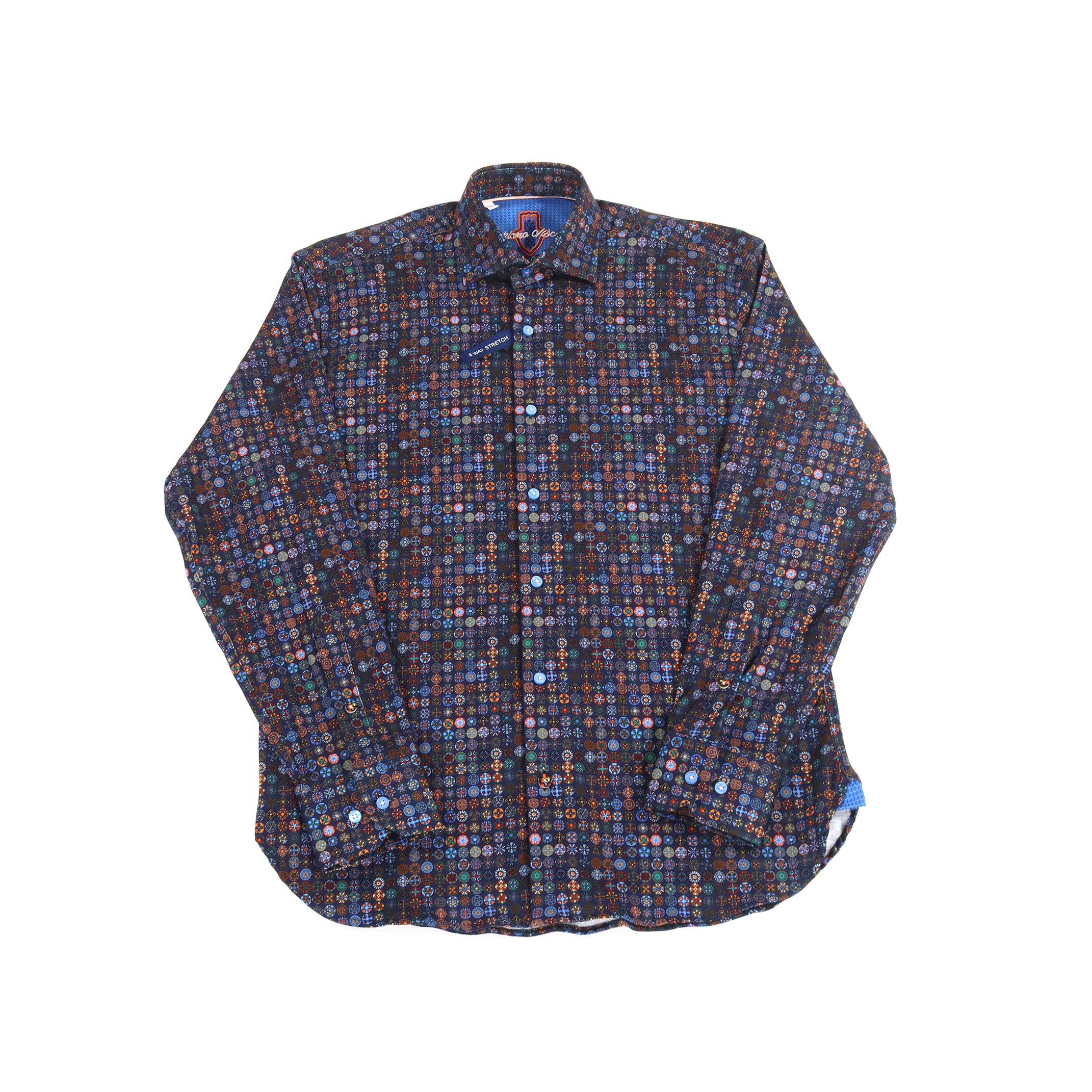 Long sleeve shirt in navy with orange, blue and red circles. Natural stretch.