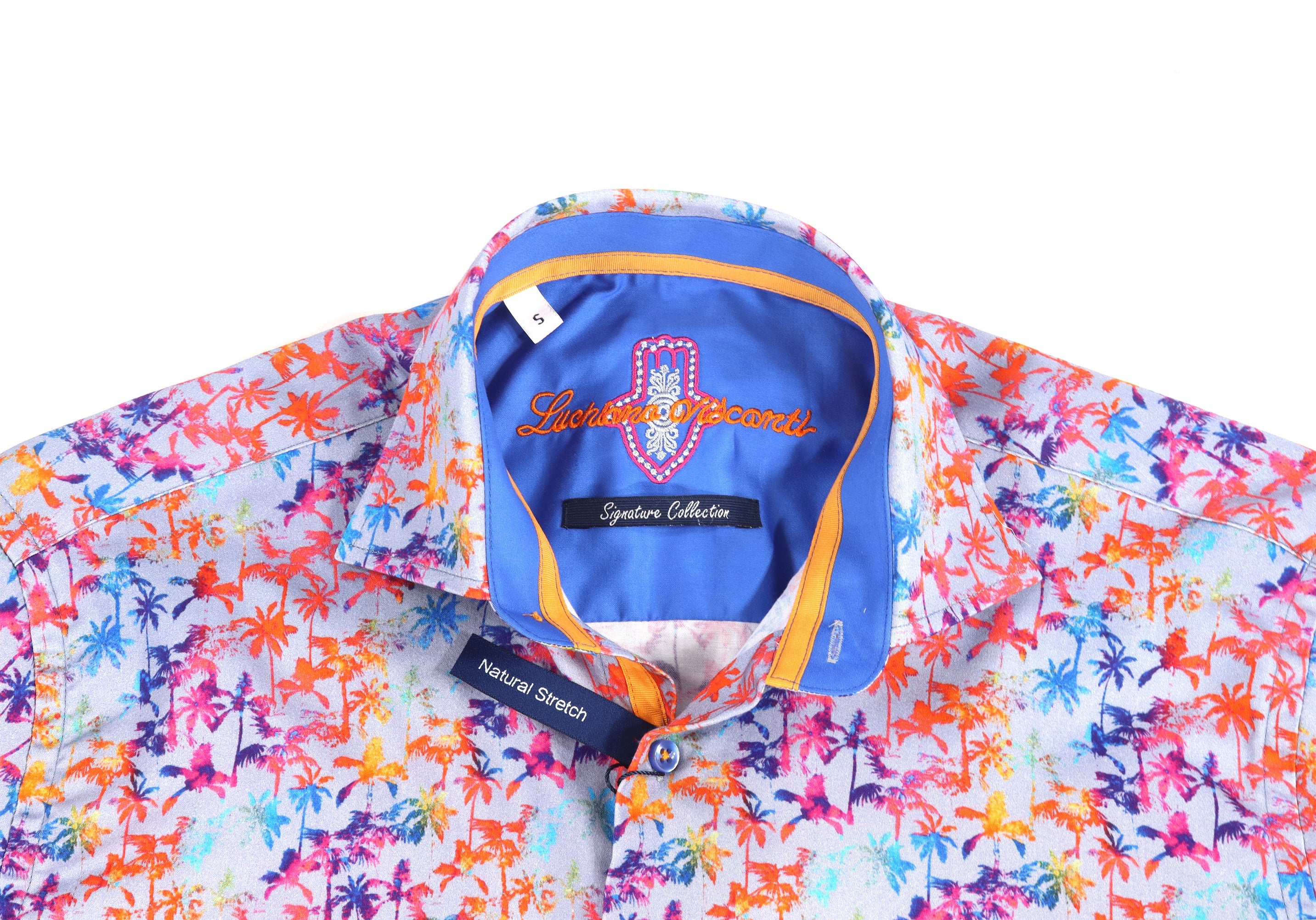 Short sleeve shirt in grey-purple with multicolor palm trees. Natural stretch.