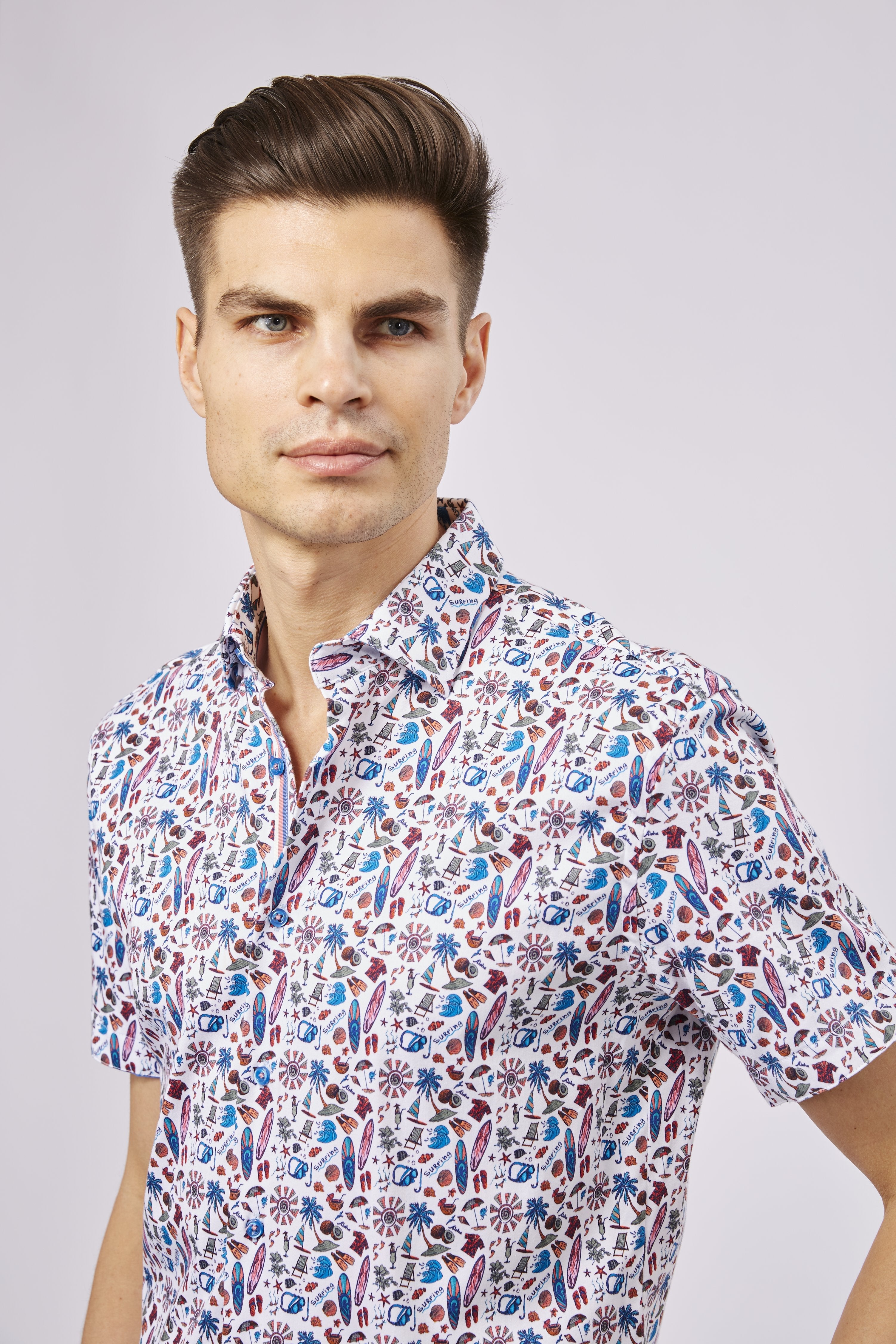 Short sleeve shirt in white with blue waves, pink surf boards, blue goggles, orange fish, grey flowers, seashells and blue palm trees. Natural stretch.