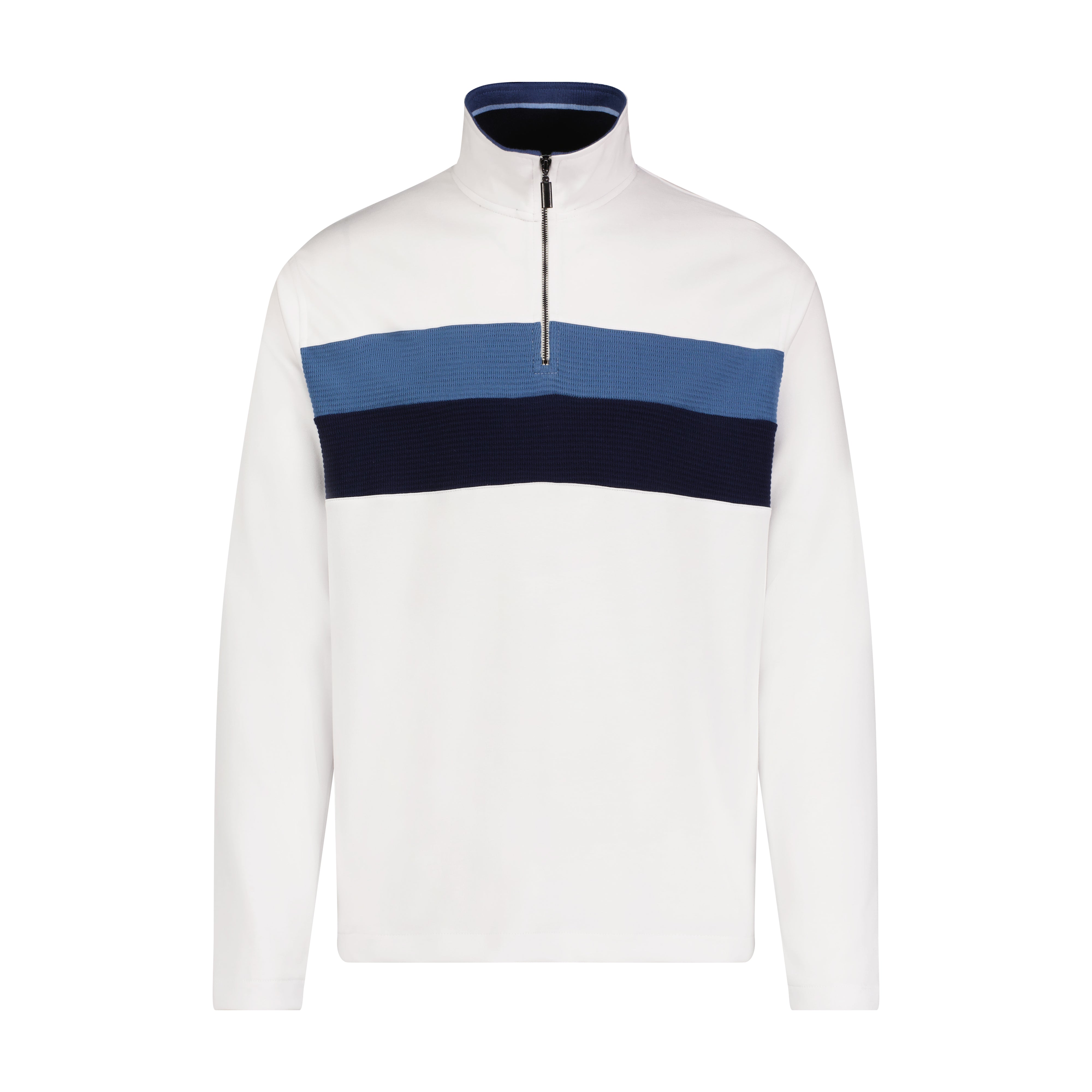 Luchiano Visconti's White with Black Panel Quarter Zip offers modern elegance and luxury, crafted from Italian scuba interlock mercerized cotton for supreme comfort and style. With sophisticated paneling throughout, this quarter zip offers a timeless look, perfect for any occasion.