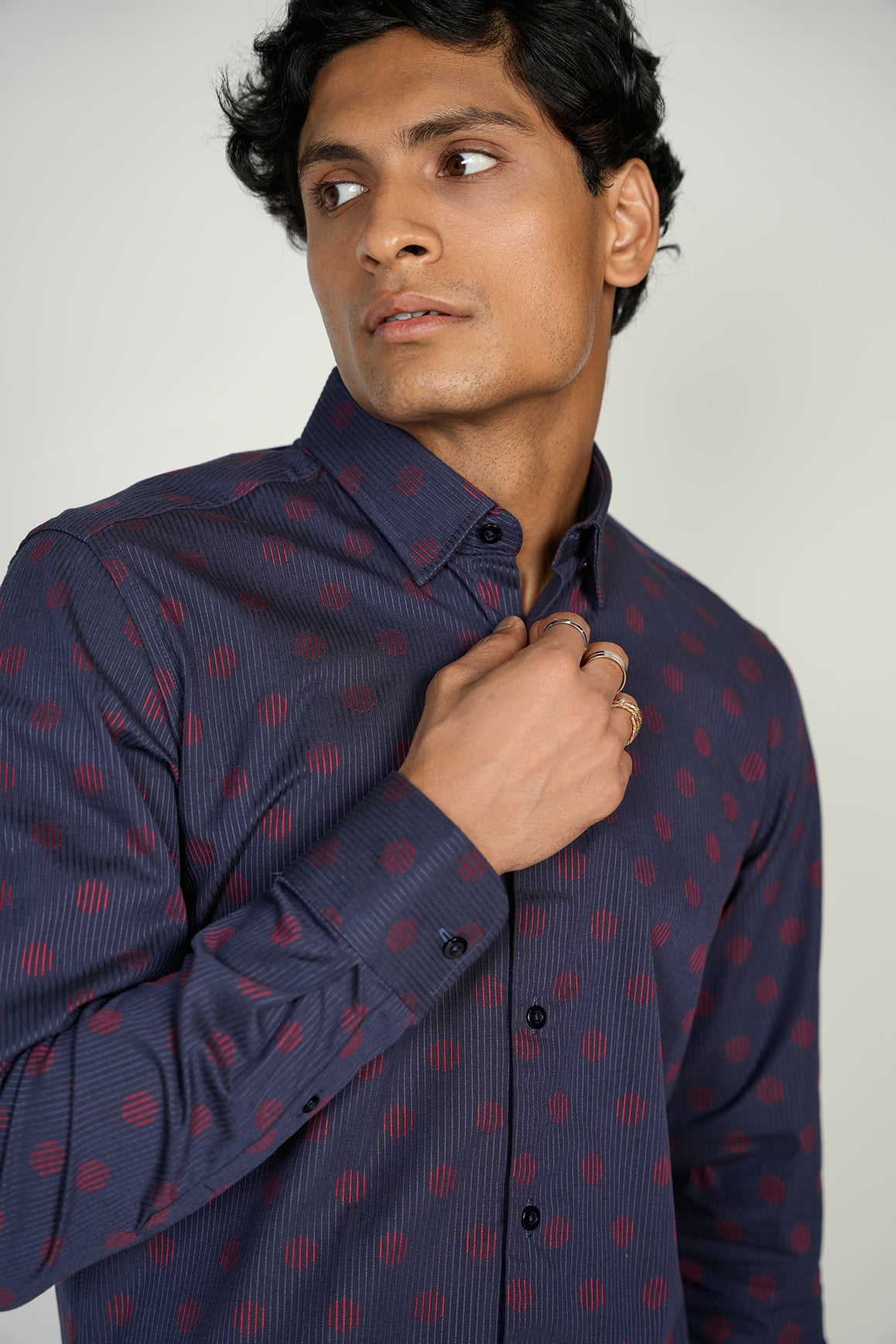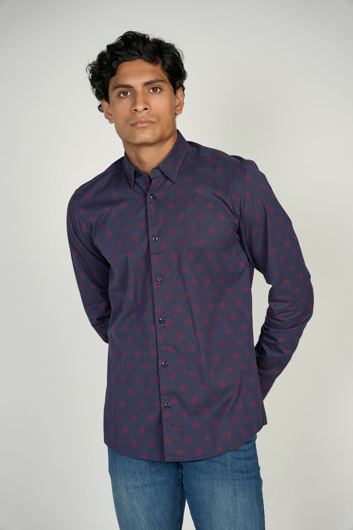 Textured shirt in navy with red stripes and circle pattern.