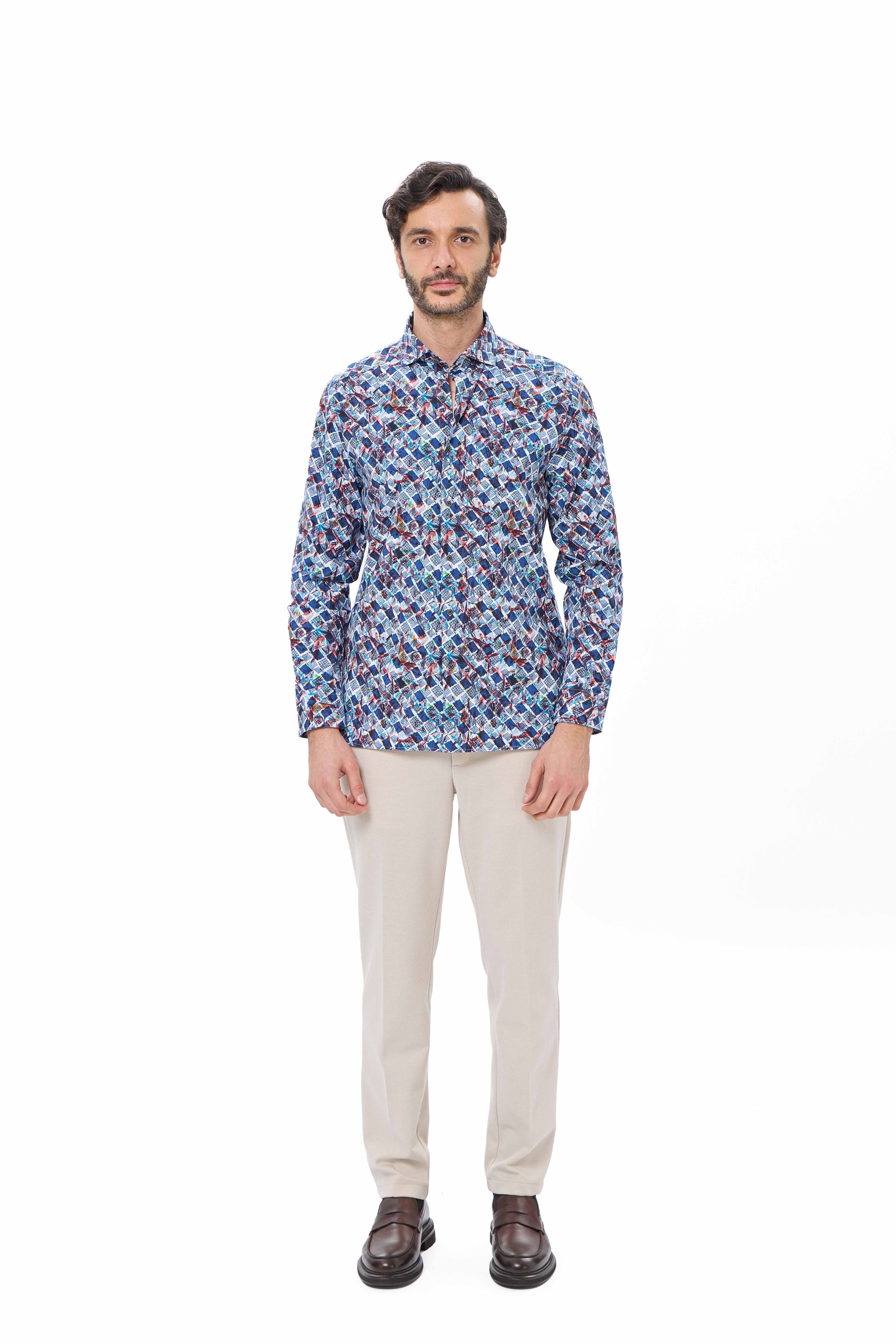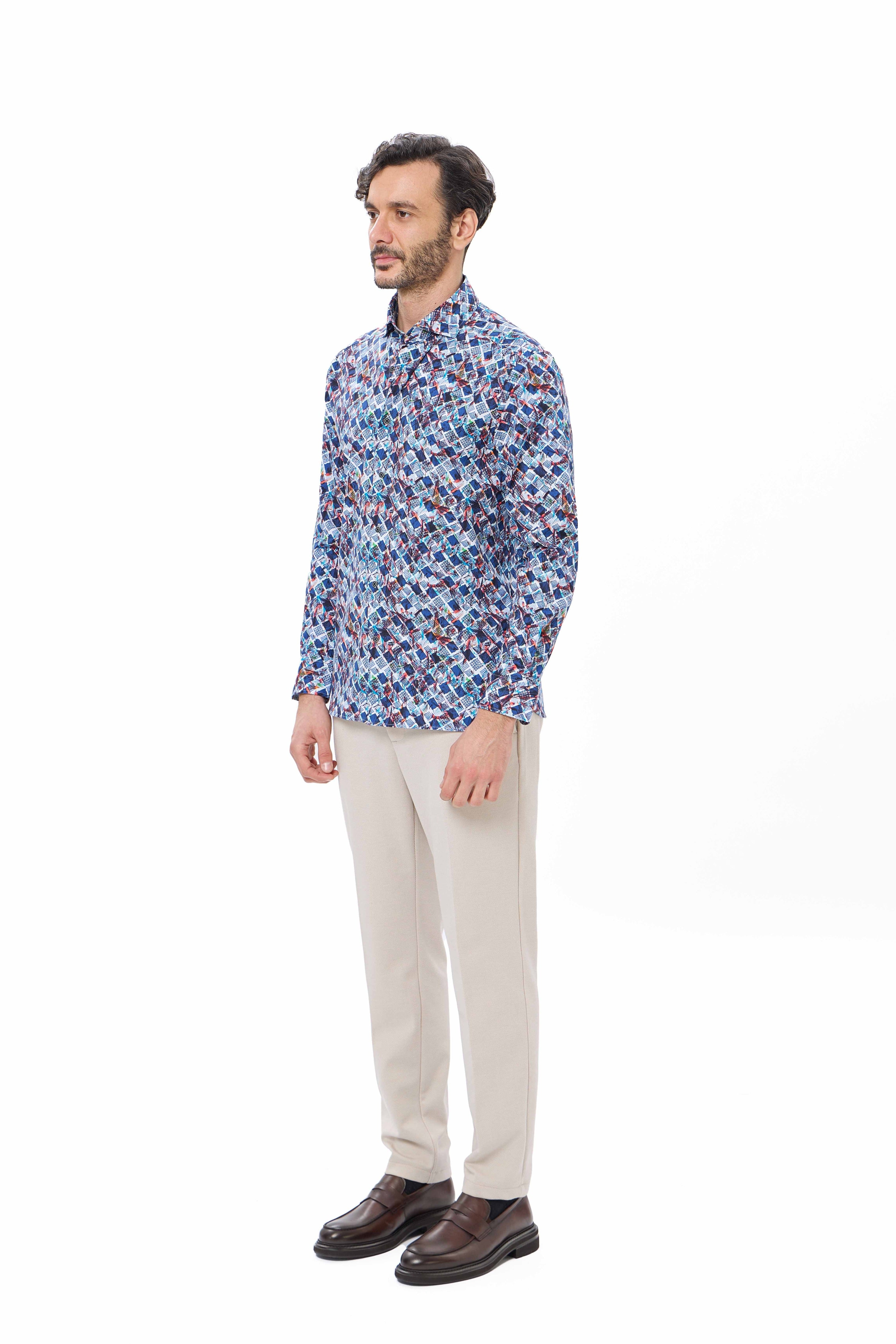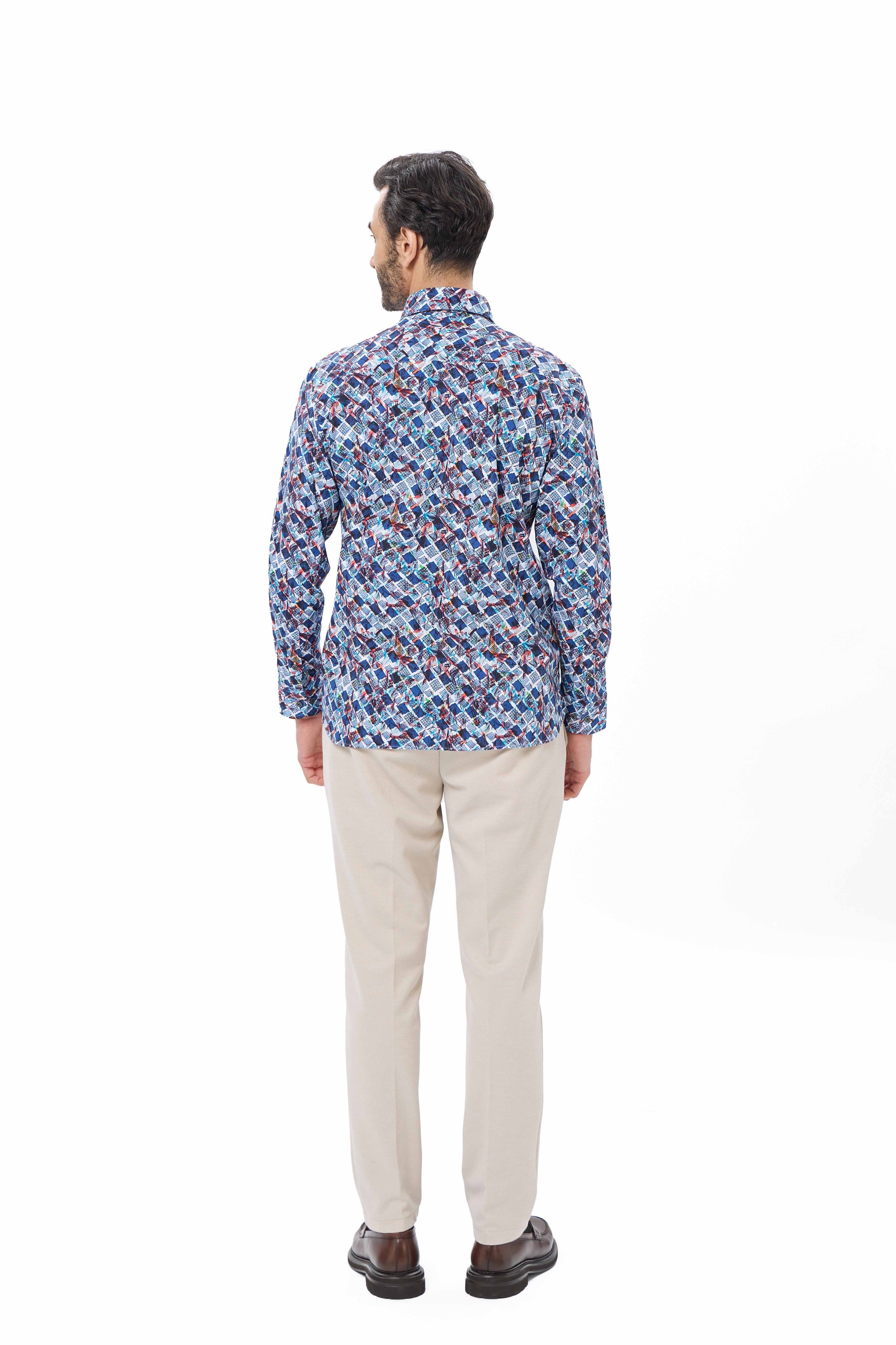 Stand out in style with our Turquoise Geo Print Performance Shirt, designed with a unique double-faced fabric that reverses to a classic herringbone pattern. Crafted from 85% recycled polyester and 15% elastane, this shirt delivers 6-way stretch for maximum comfort and movement, while sustainable materials support eco-conscious living. Trim details at the inner collar, cuff, yoke, and side slit add a refined finish. Perfect for fall, this shirt effortlessly transitions from office-ready to weekend-casual.