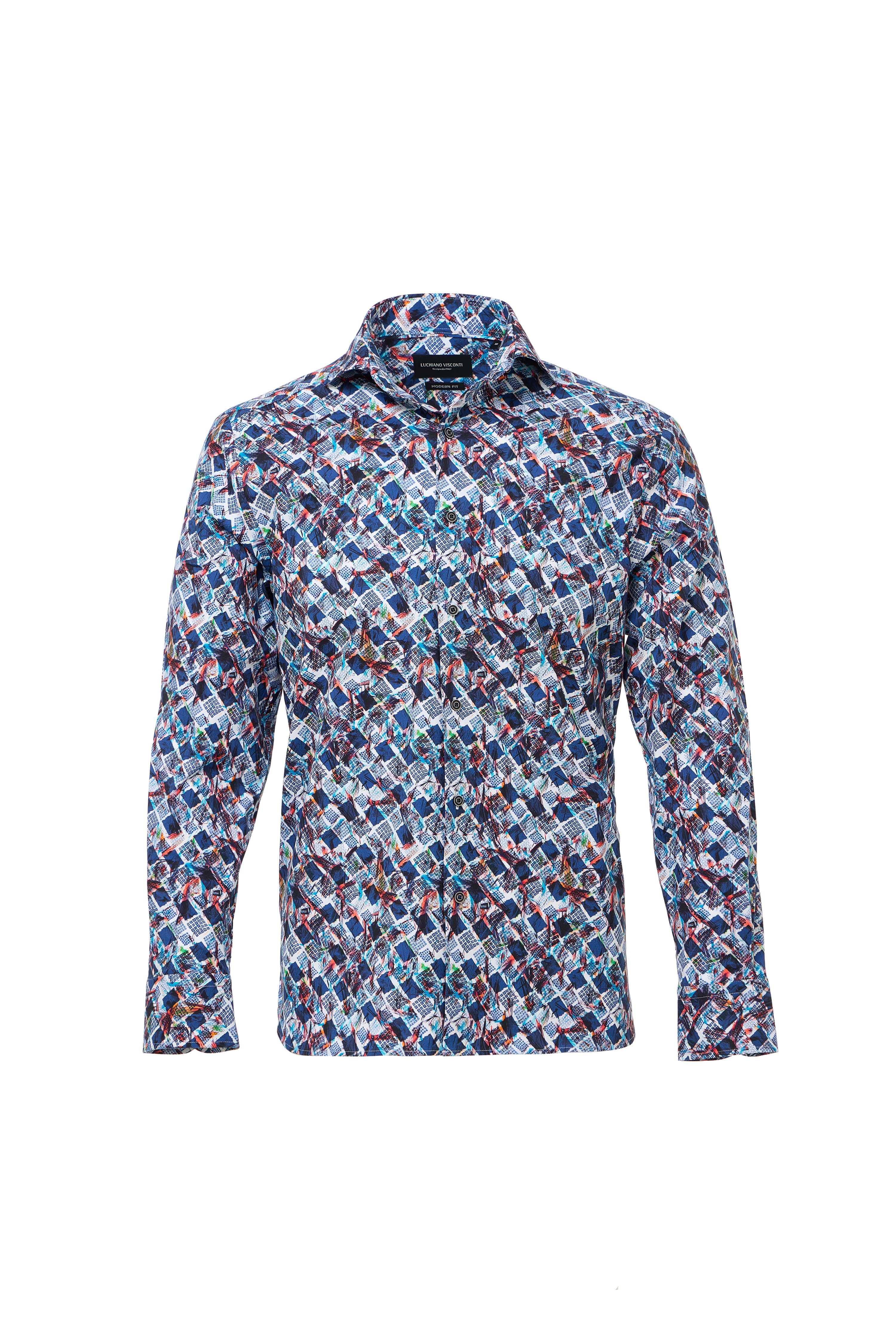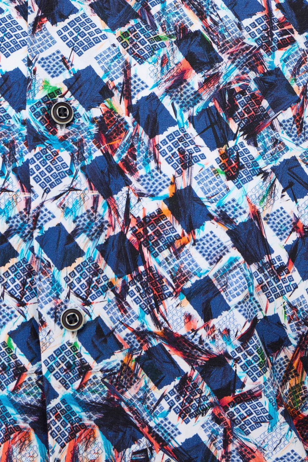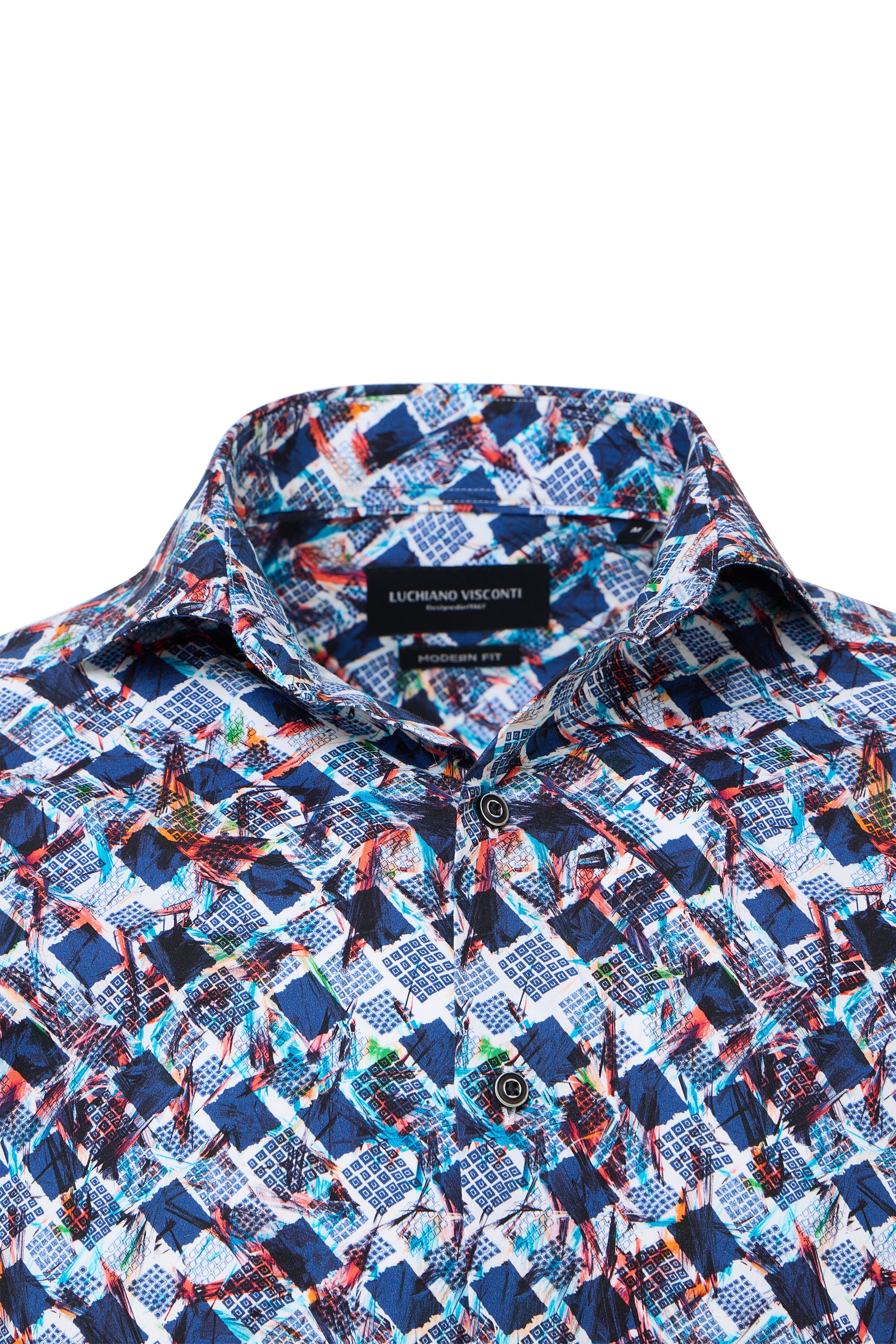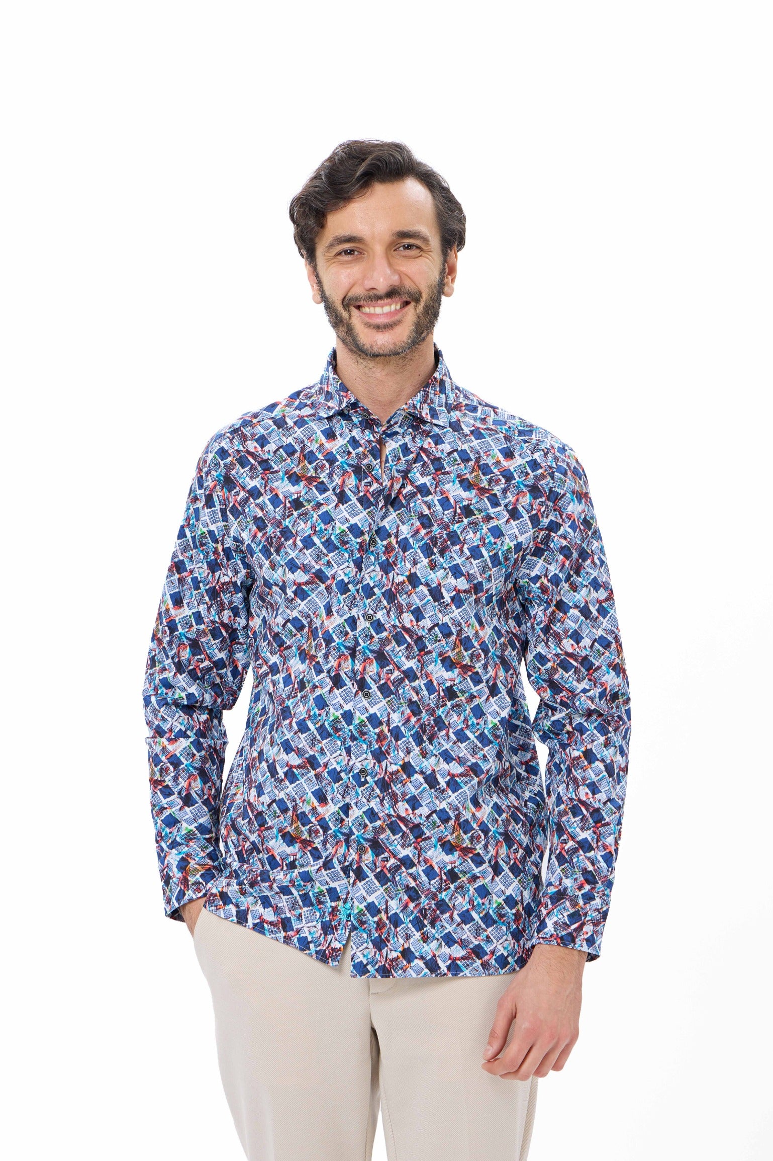 Stand out in style with our Turquoise Geo Print Performance Shirt, designed with a unique double-faced fabric that reverses to a classic herringbone pattern. Crafted from 85% recycled polyester and 15% elastane, this shirt delivers 6-way stretch for maximum comfort and movement, while sustainable materials support eco-conscious living. Trim details at the inner collar, cuff, yoke, and side slit add a refined finish. Perfect for fall, this shirt effortlessly transitions from office-ready to weekend-casual.