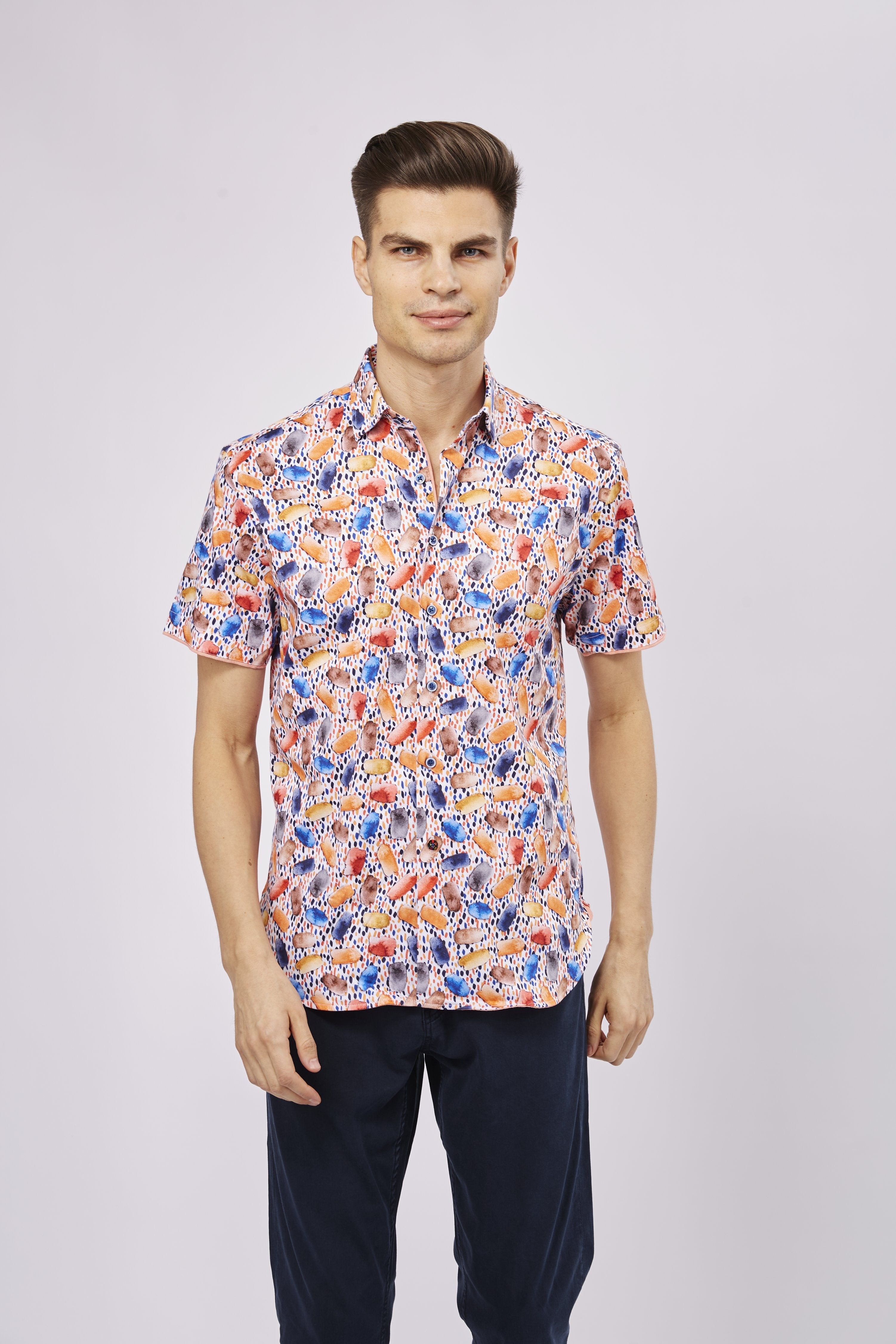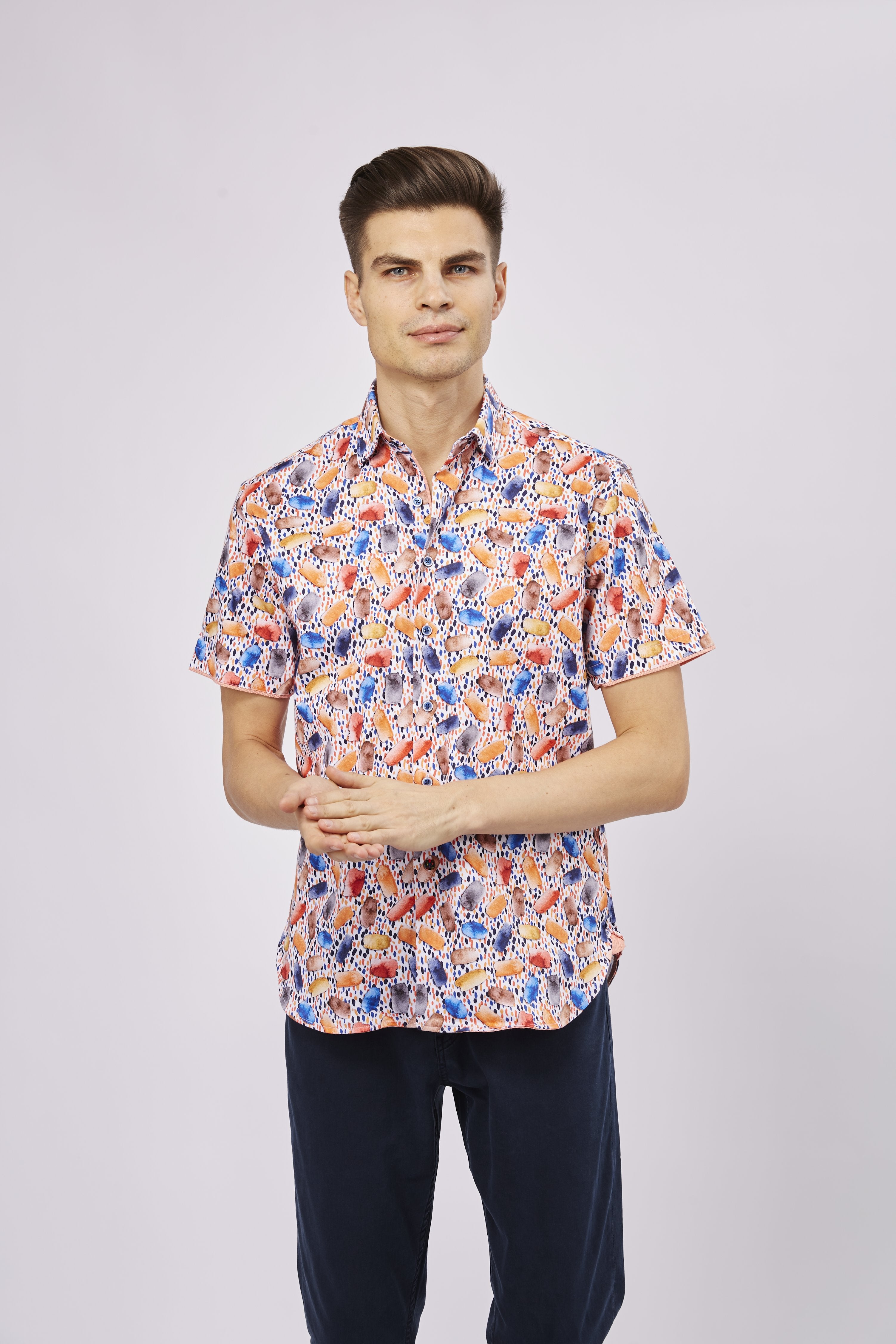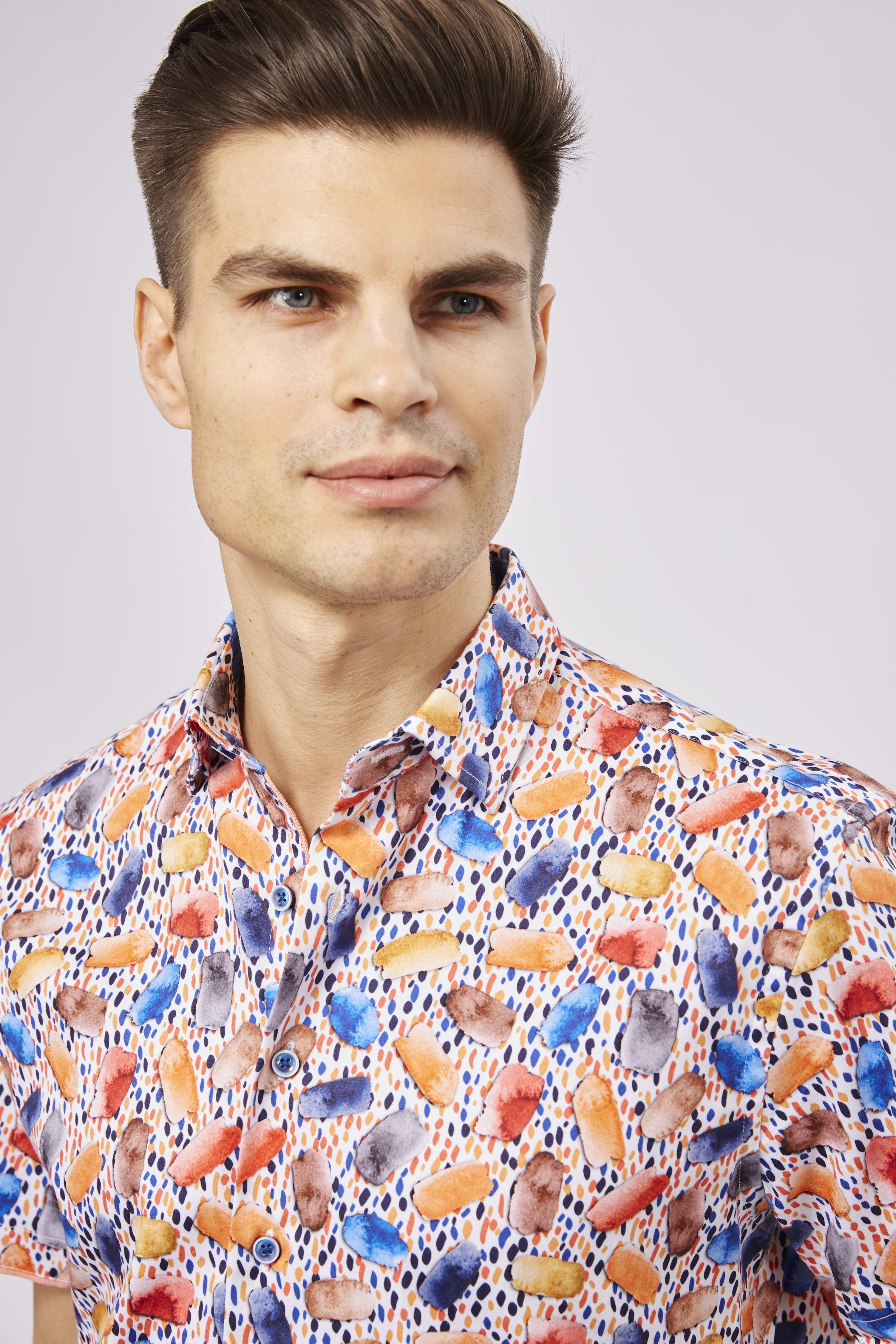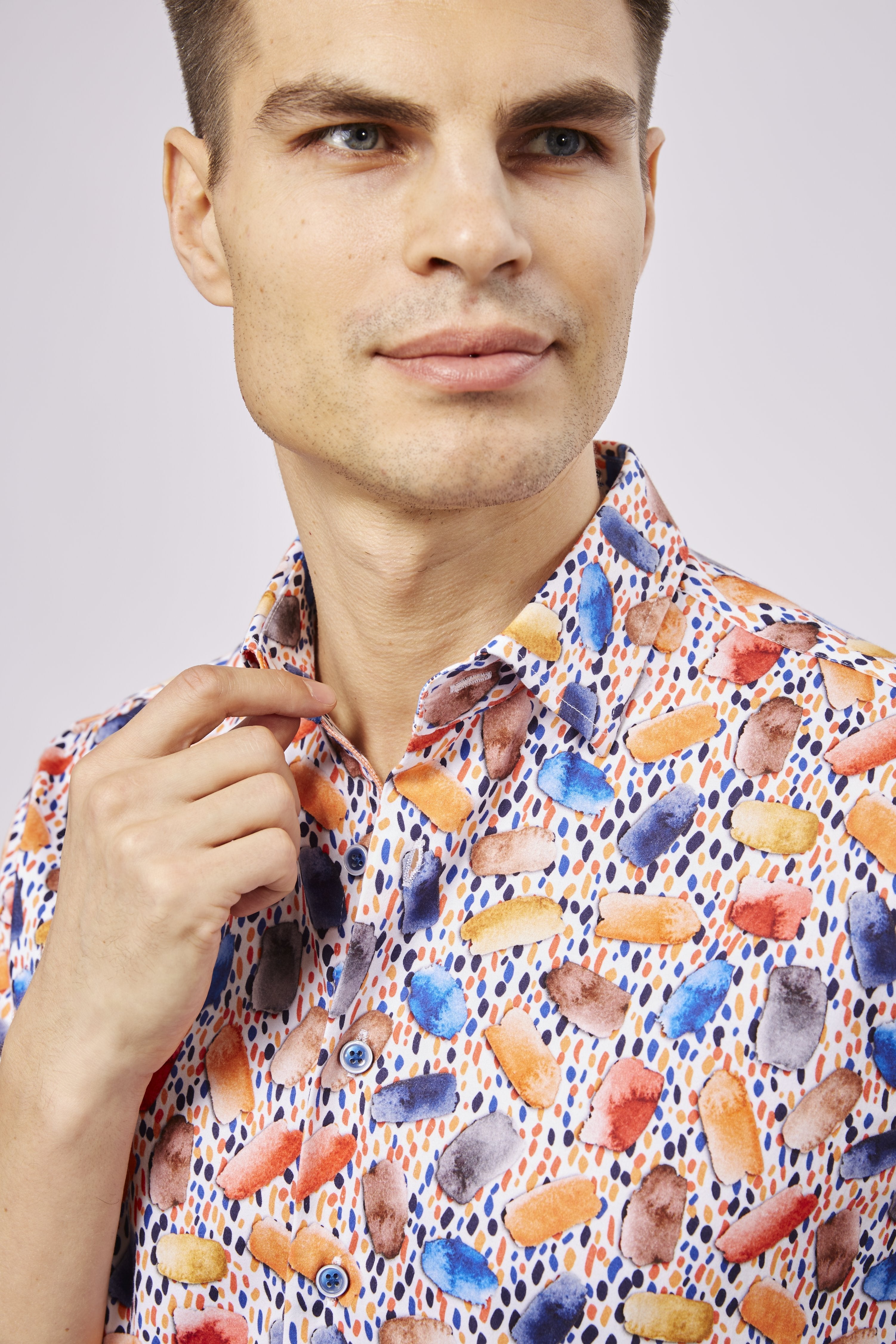 Short sleeve shirt in orange, red, blue and purple watercolor splashes and dashes.