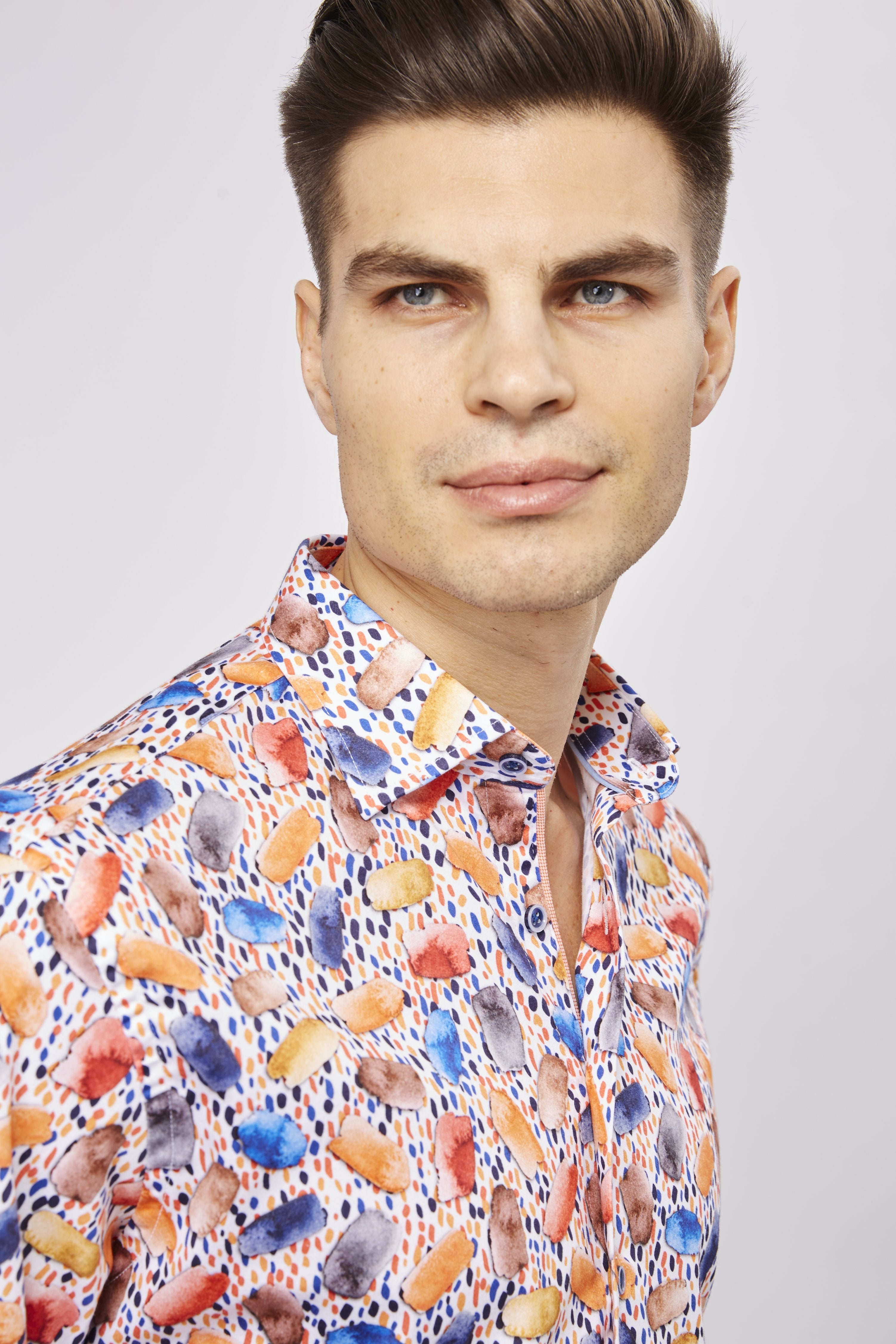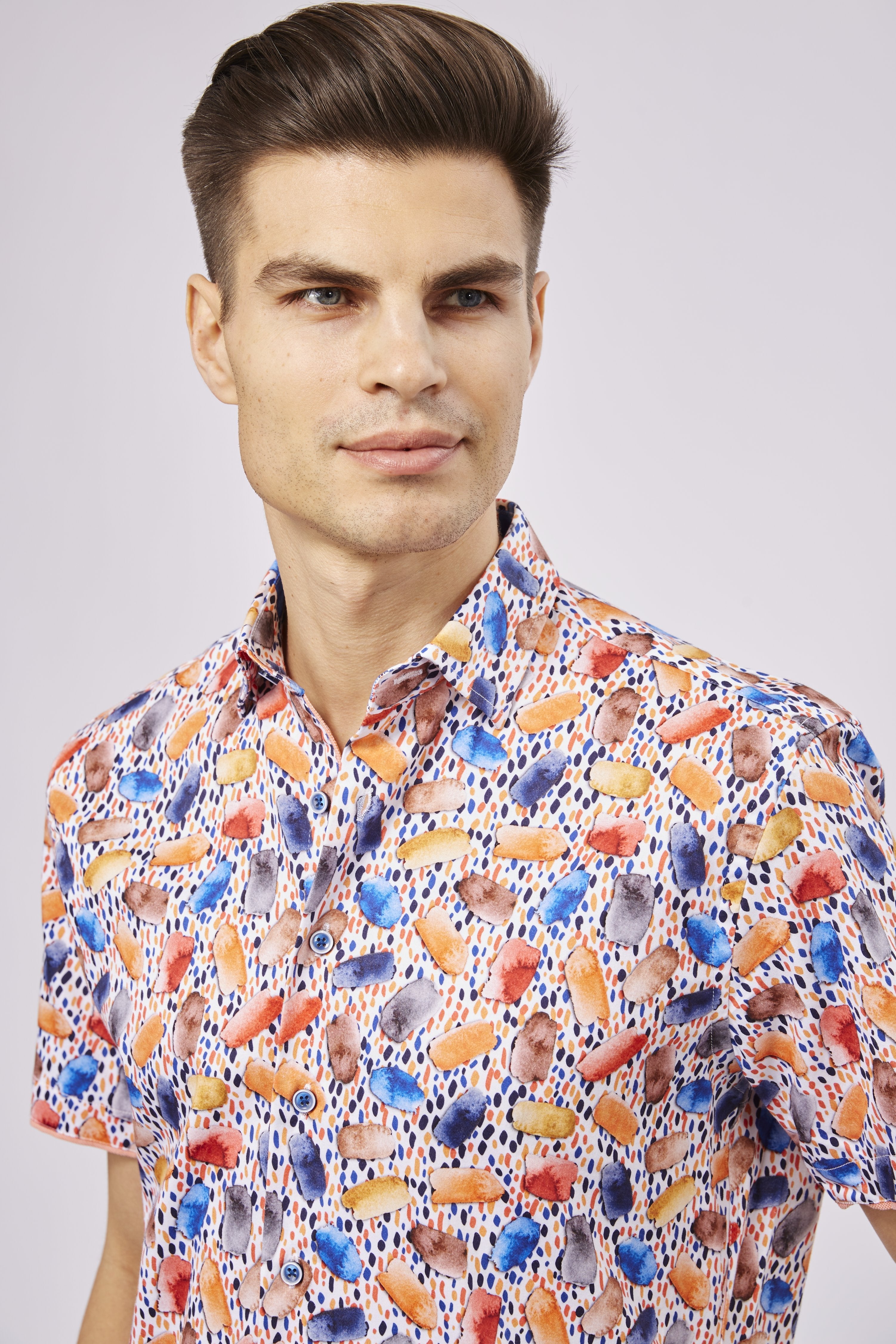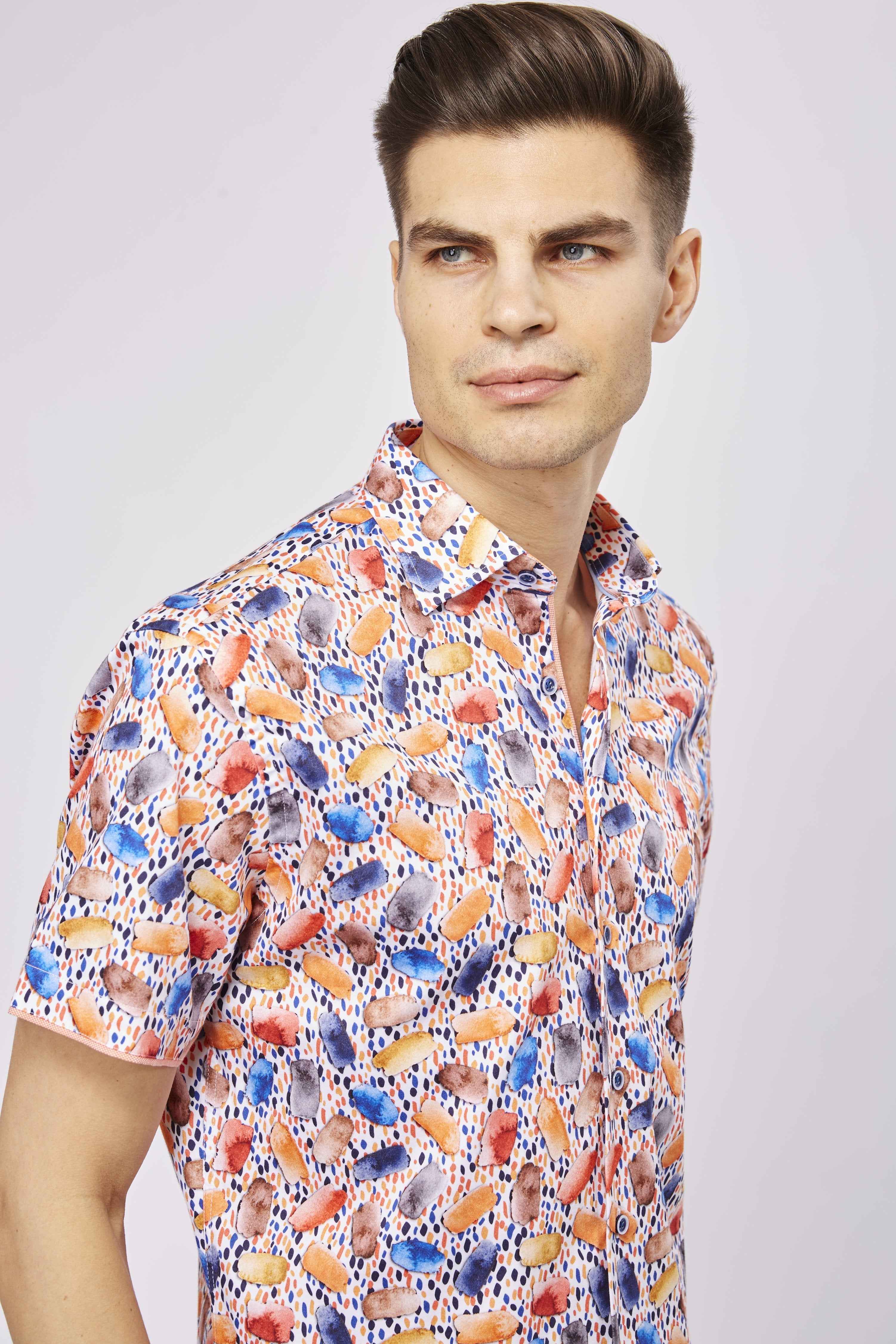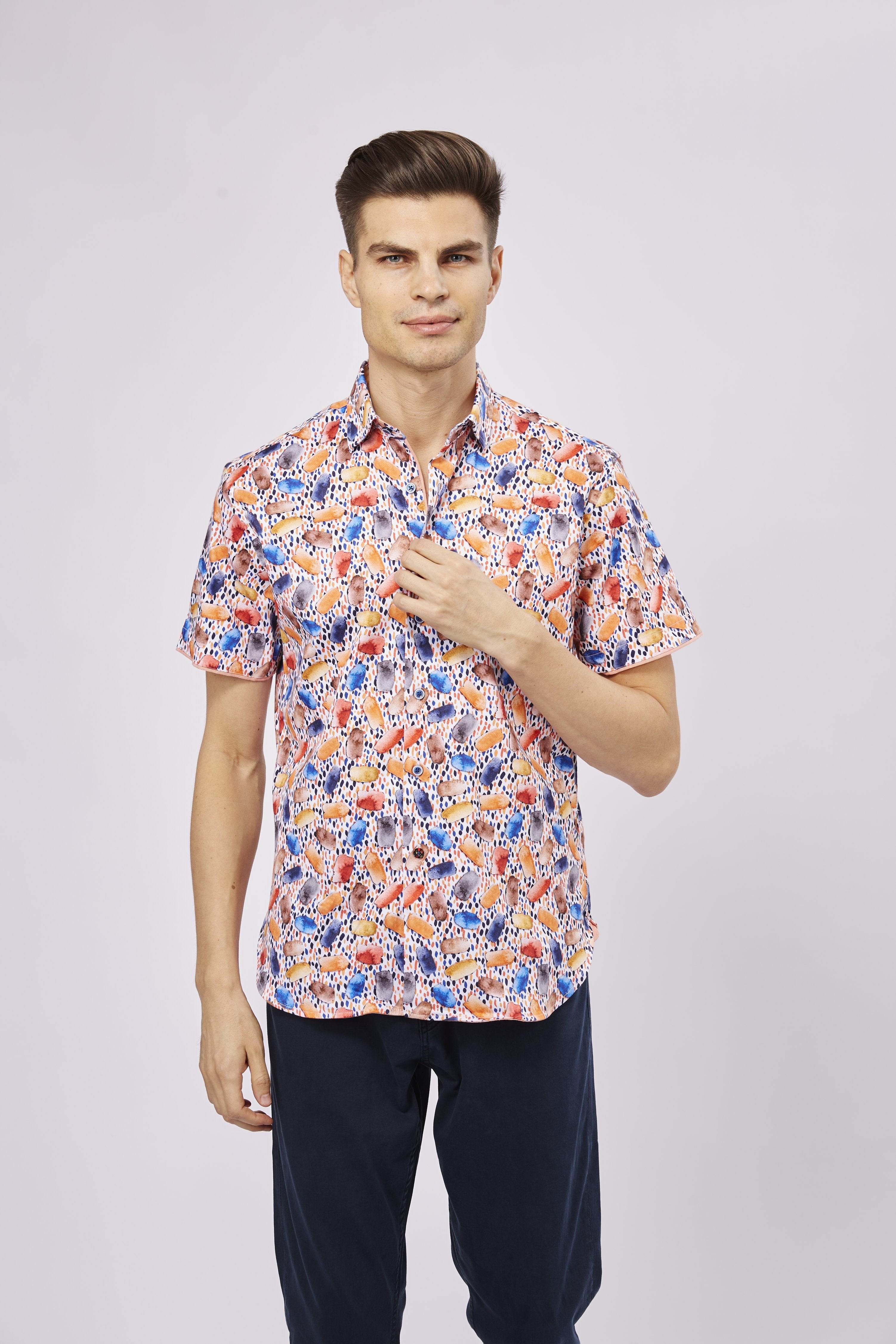 Short sleeve shirt in orange, red, blue and purple watercolor splashes and dashes.