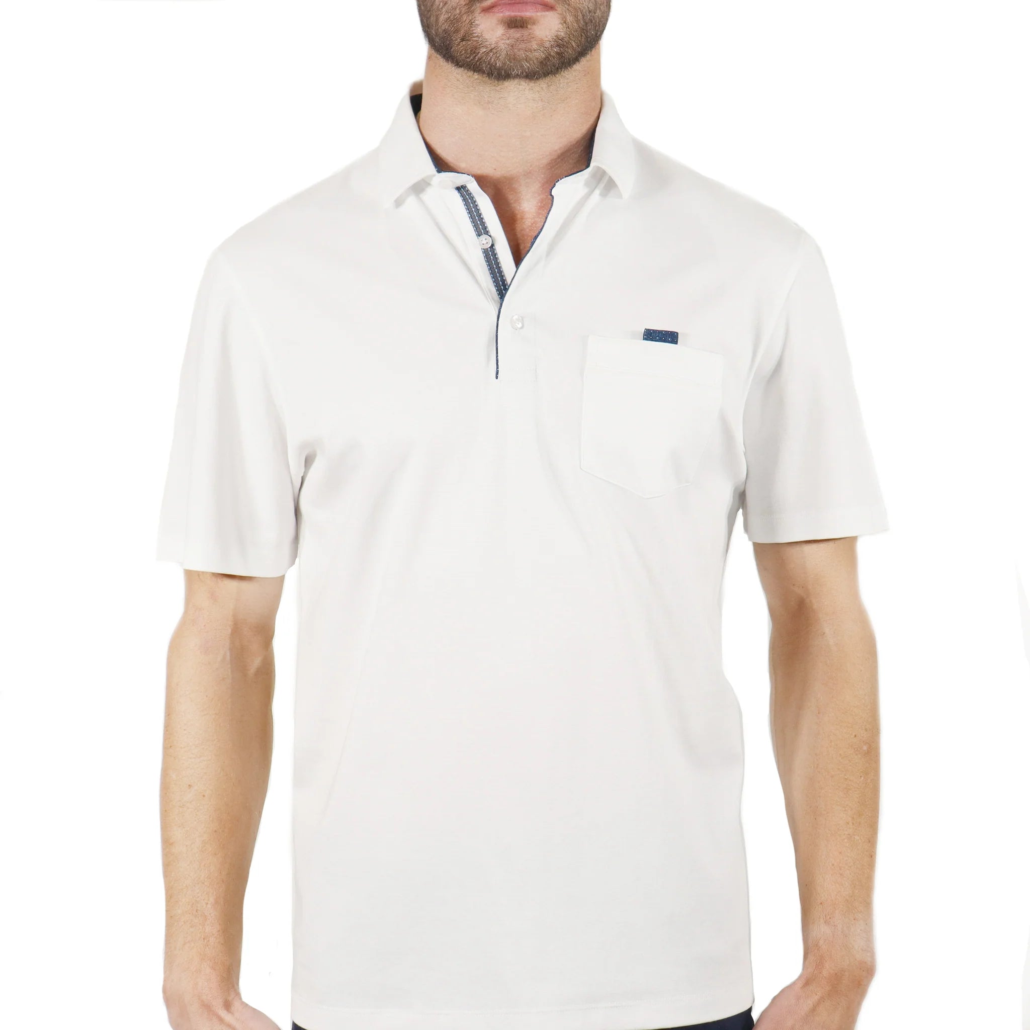 Polo knit in white with navy detailing.
