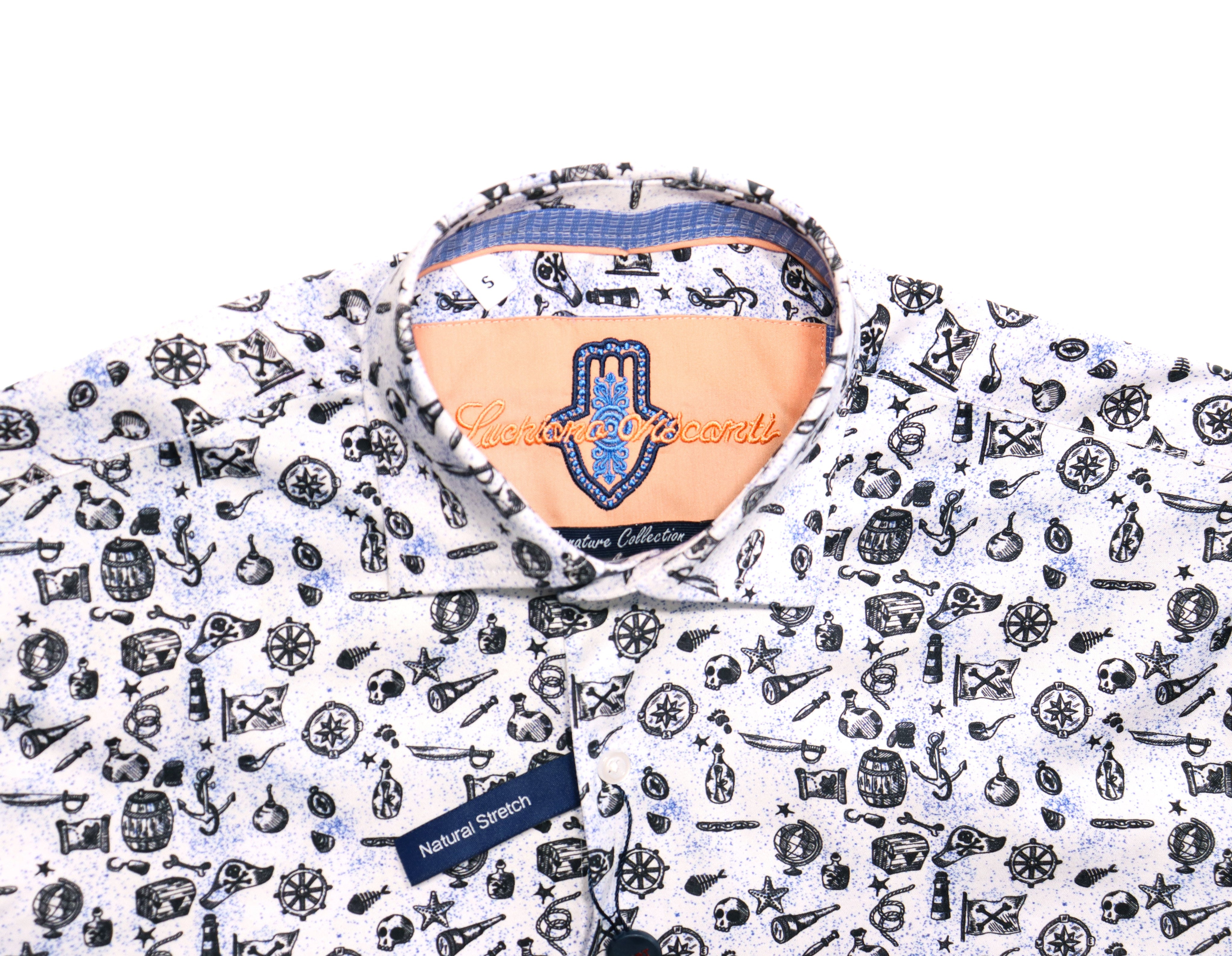 Long sleeve shirt in white with blue paint splatter and nautical print.