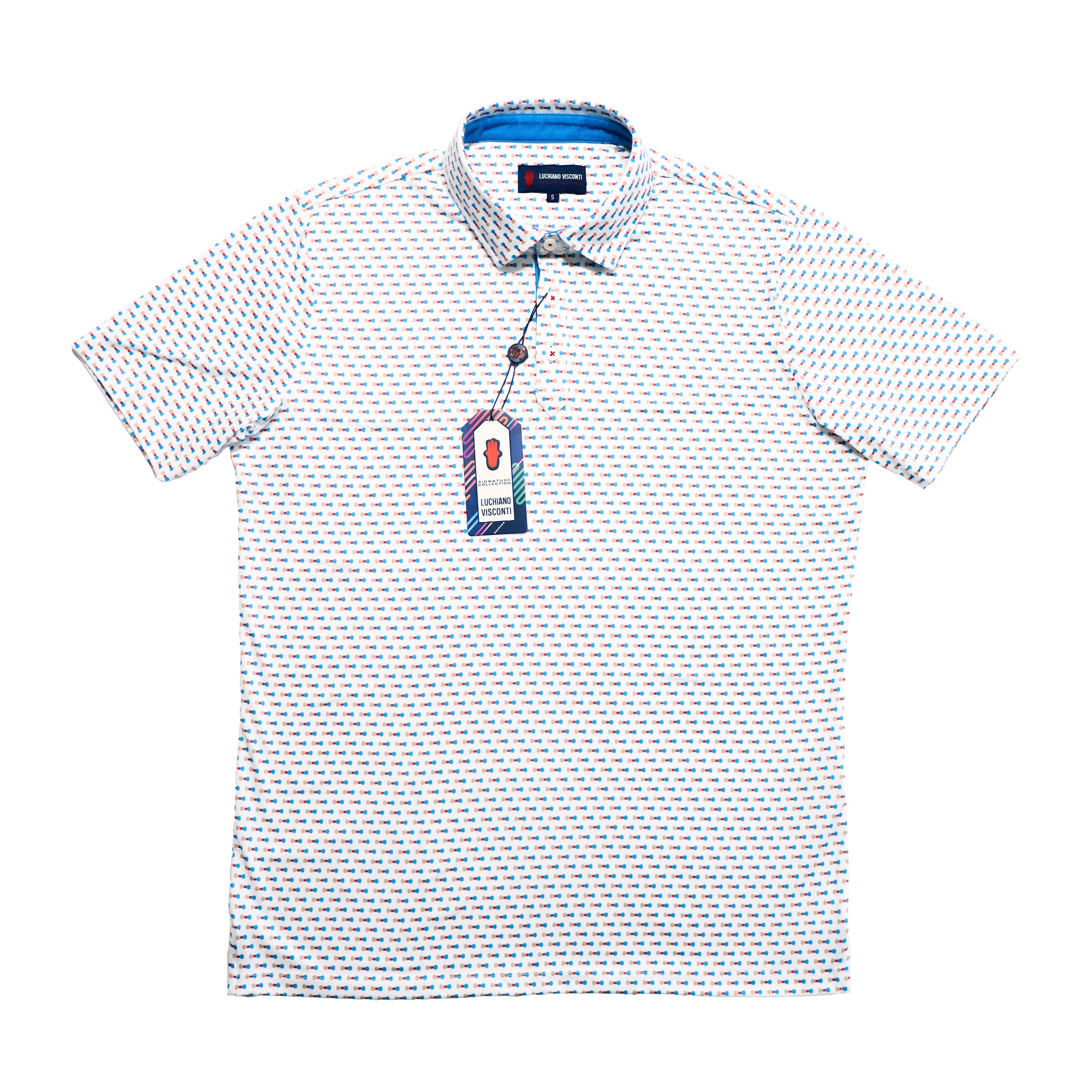 Short sleeve polo in white with blue, red and brown bowties. Material is 100% cotton.